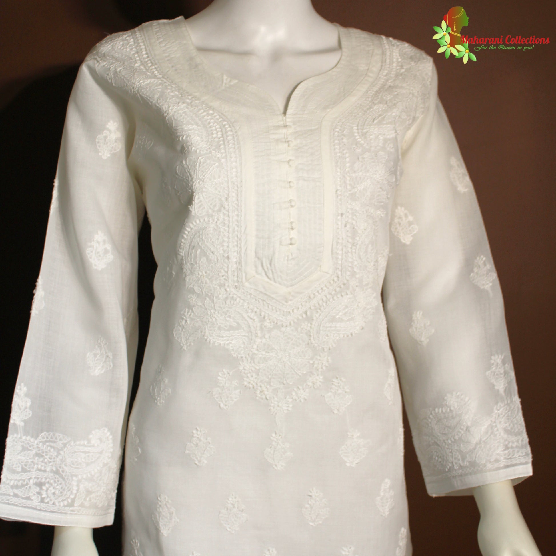 Maharani's Lucknowi Chikankari Kurta Top - White (M) - Pure Cotton