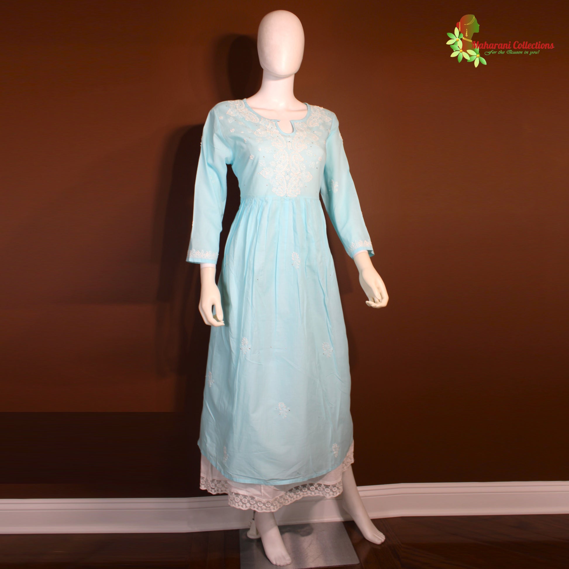 Maharani's Lucknowi Chikankari Long Top - Light Blue (L) - Pure Cotton