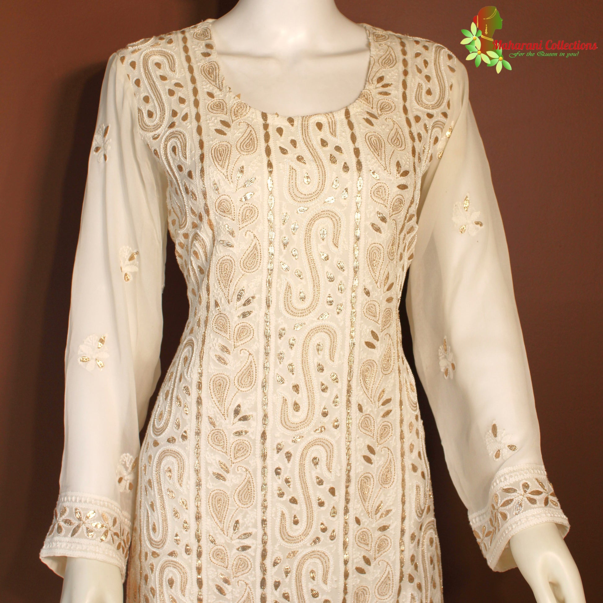 Maharani's finest pure Georgette Palazzo suit with Lucknowi Chikankari, Pearl, Gotta Patti and Thread work. Comes with matching Lucknowi Chikankari Pant and Pure Georgette Dupatta.