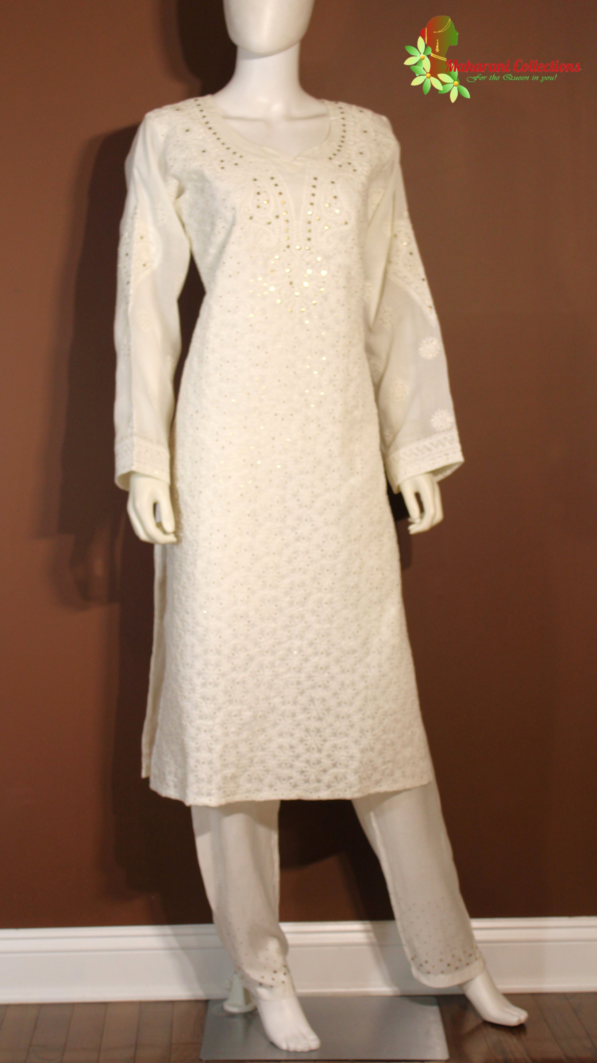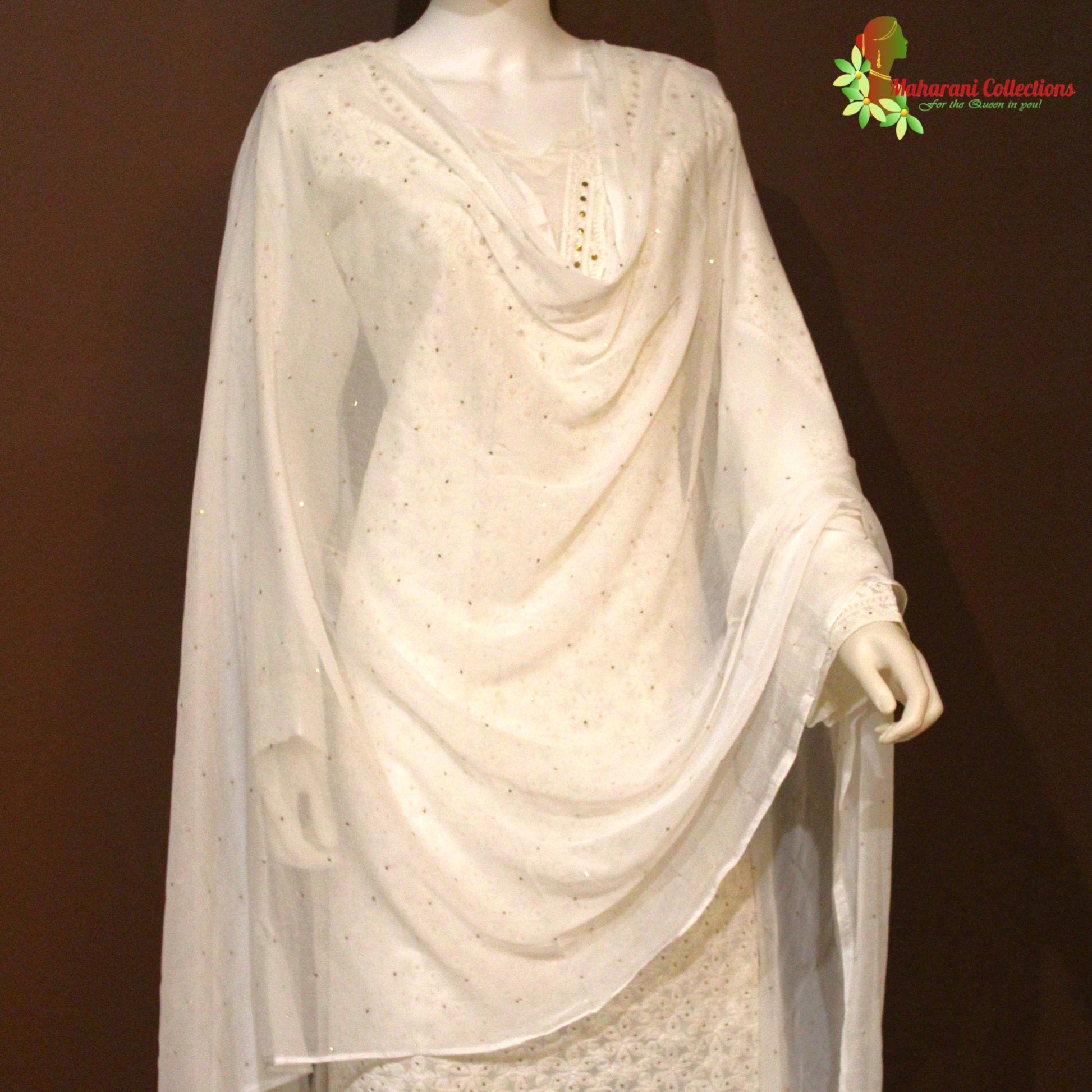 Maharani's Lucknowi Chikankari Pant suit with overall thread and Mukesh work, attached cotton lining, matching Pant and matching Georgette Dupatta.