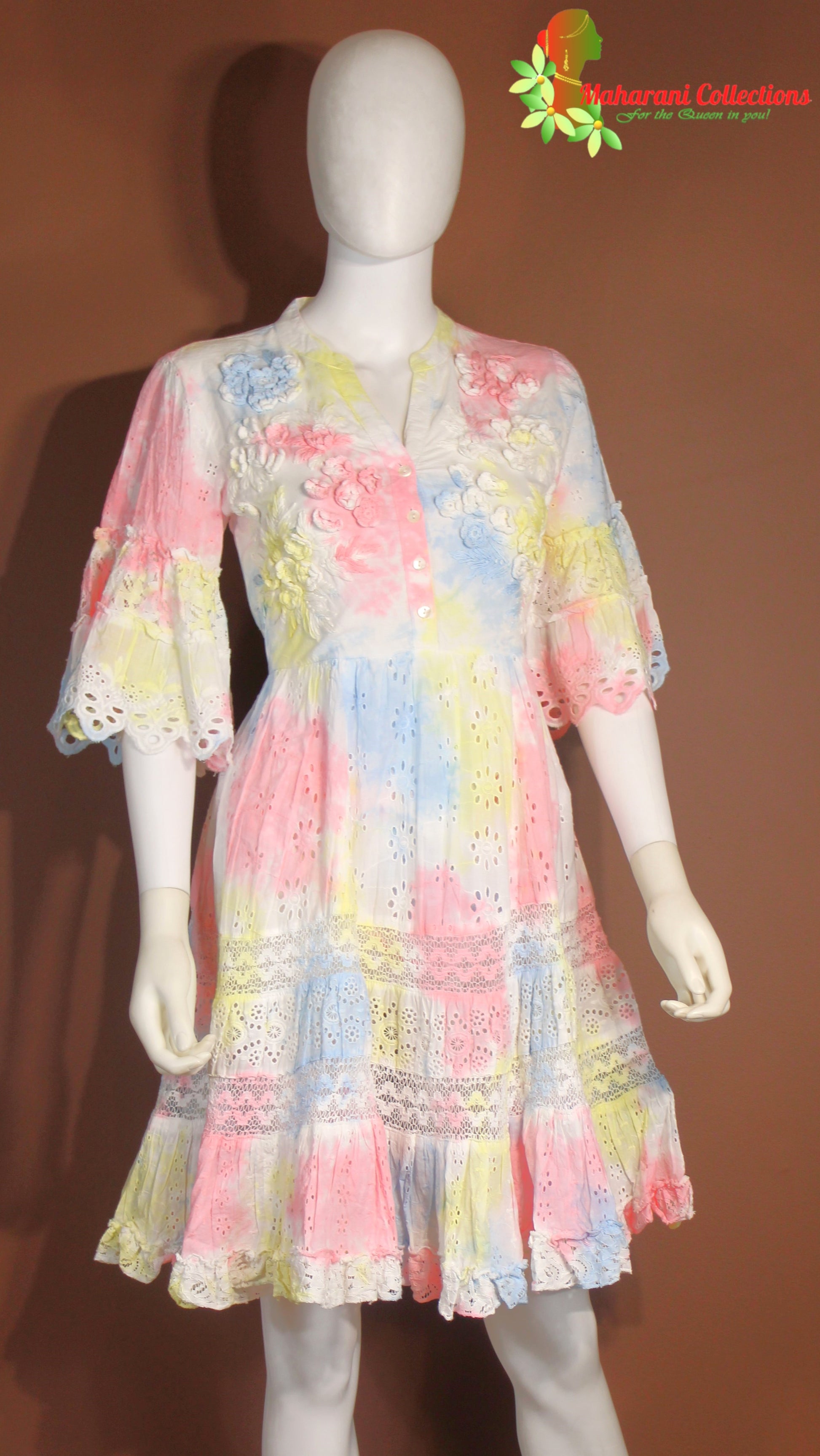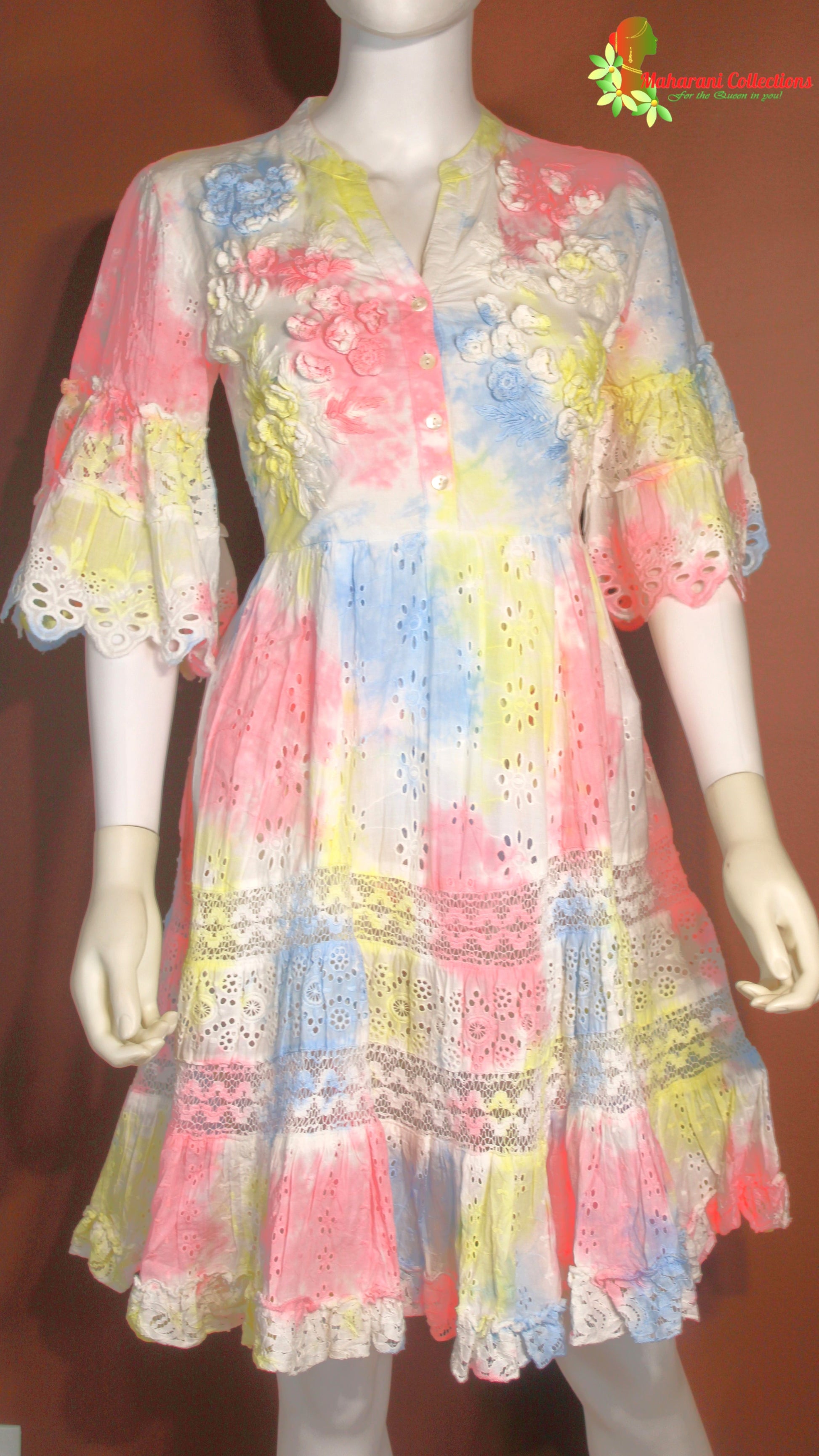 Maharani's Tie & Dye Short dress with stitched cotton liner and detailed floral threadwork.