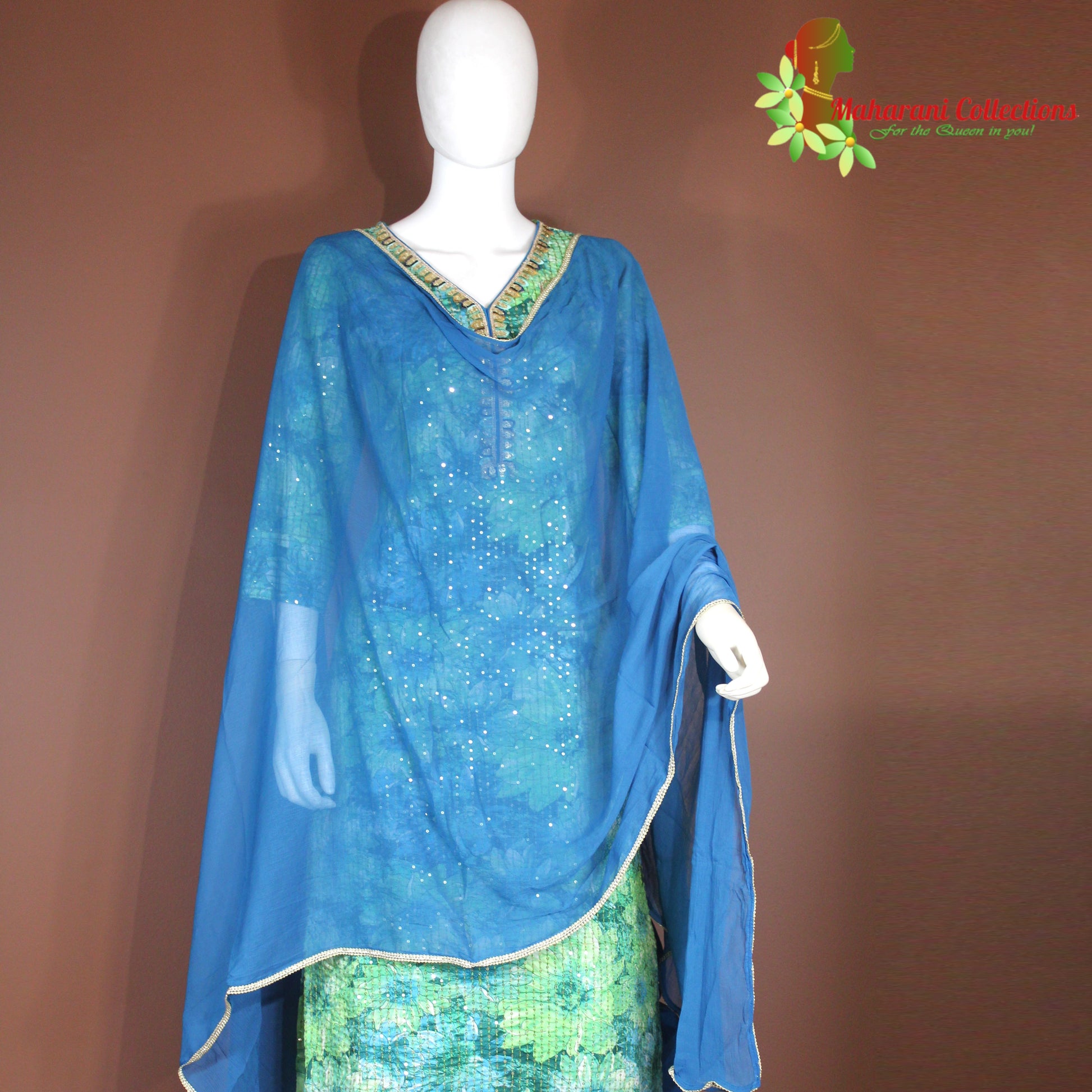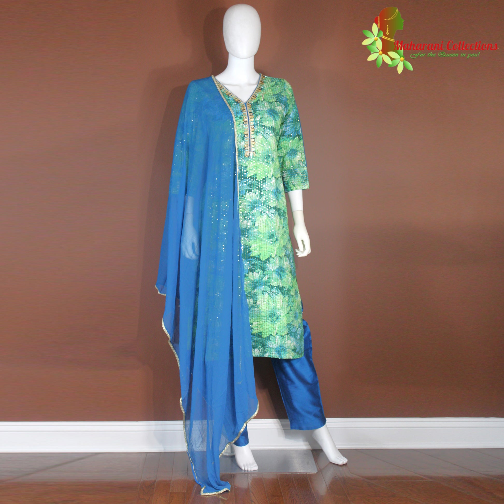 Maharani's Pant Suit with Stitched Liner, Over All Sequins and Thread Work, matching Pant and Teal Color, Georgette, allover Gotta Patti Work Dupatta.