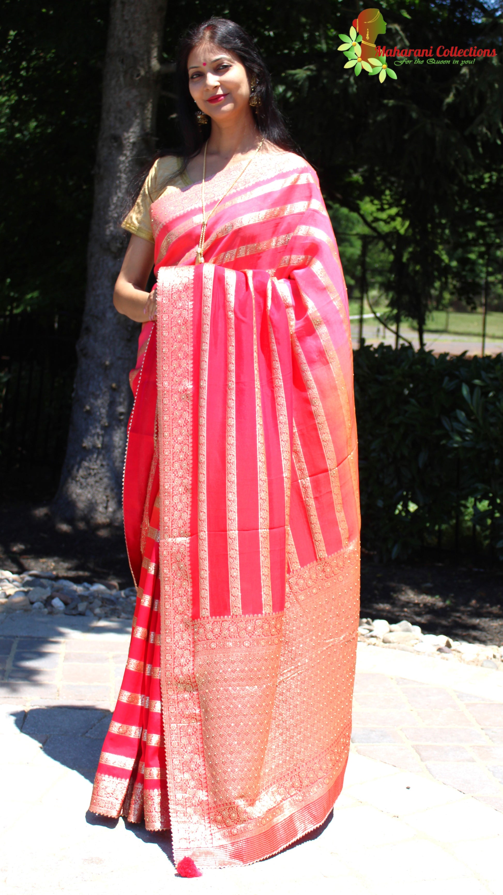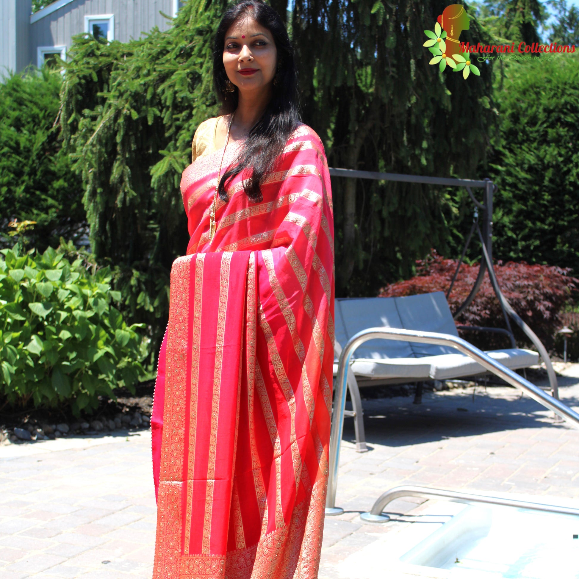 Maharani's Pure Banarasi Georgette Saree - Red, Pink and Orange (with stitched Blouse and Petticoat)
