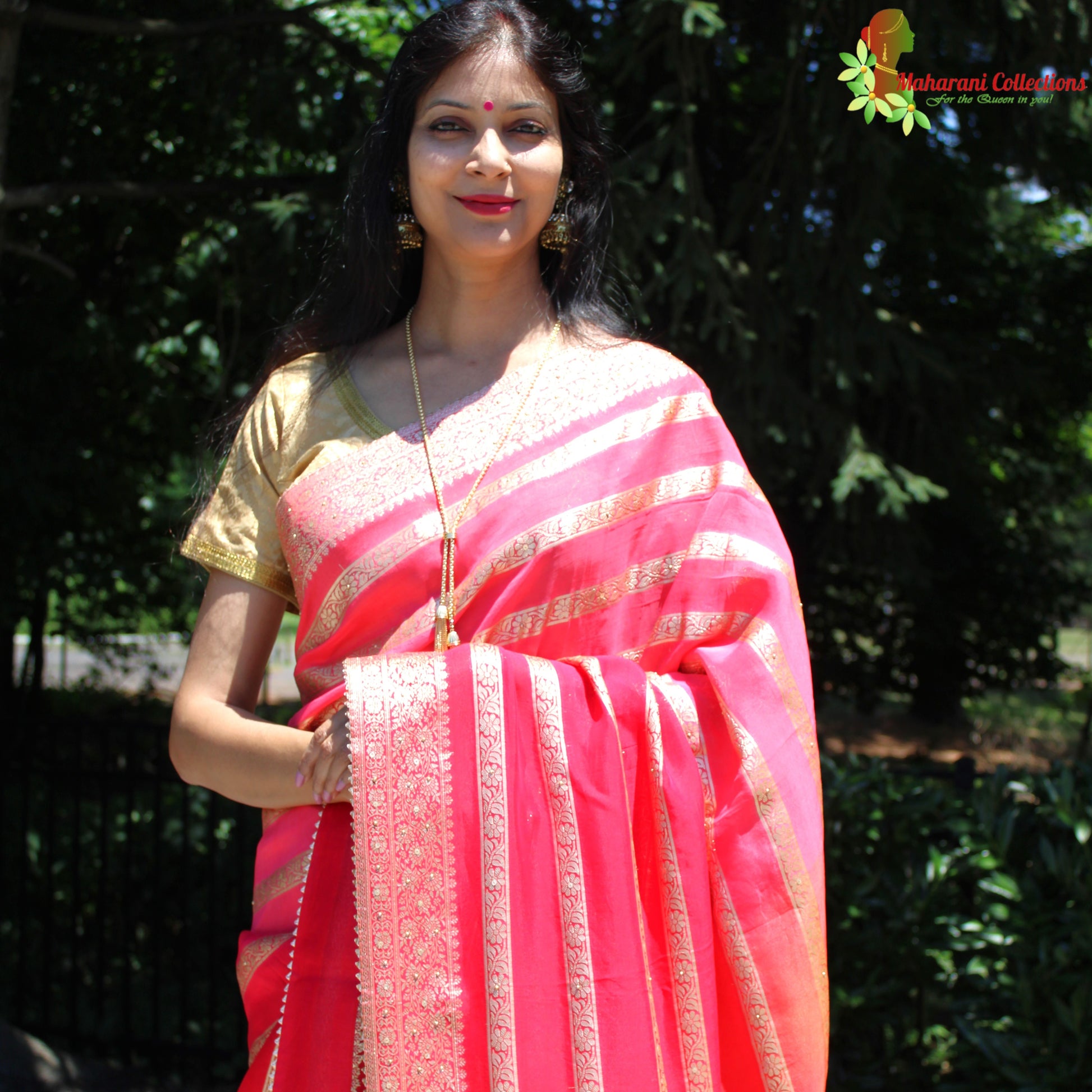 Authentic pure Banarasi Georgette saree with ready-to-wear stitched blouse and matching unstitched blouse piece. All stitching is done as per Maharani's specification with original and authentic material. Elegant Golden Zari Work, overall golden Zari stripes, Sequins and golden beads work and heavy zari Pallu. Fall and Pico is done.