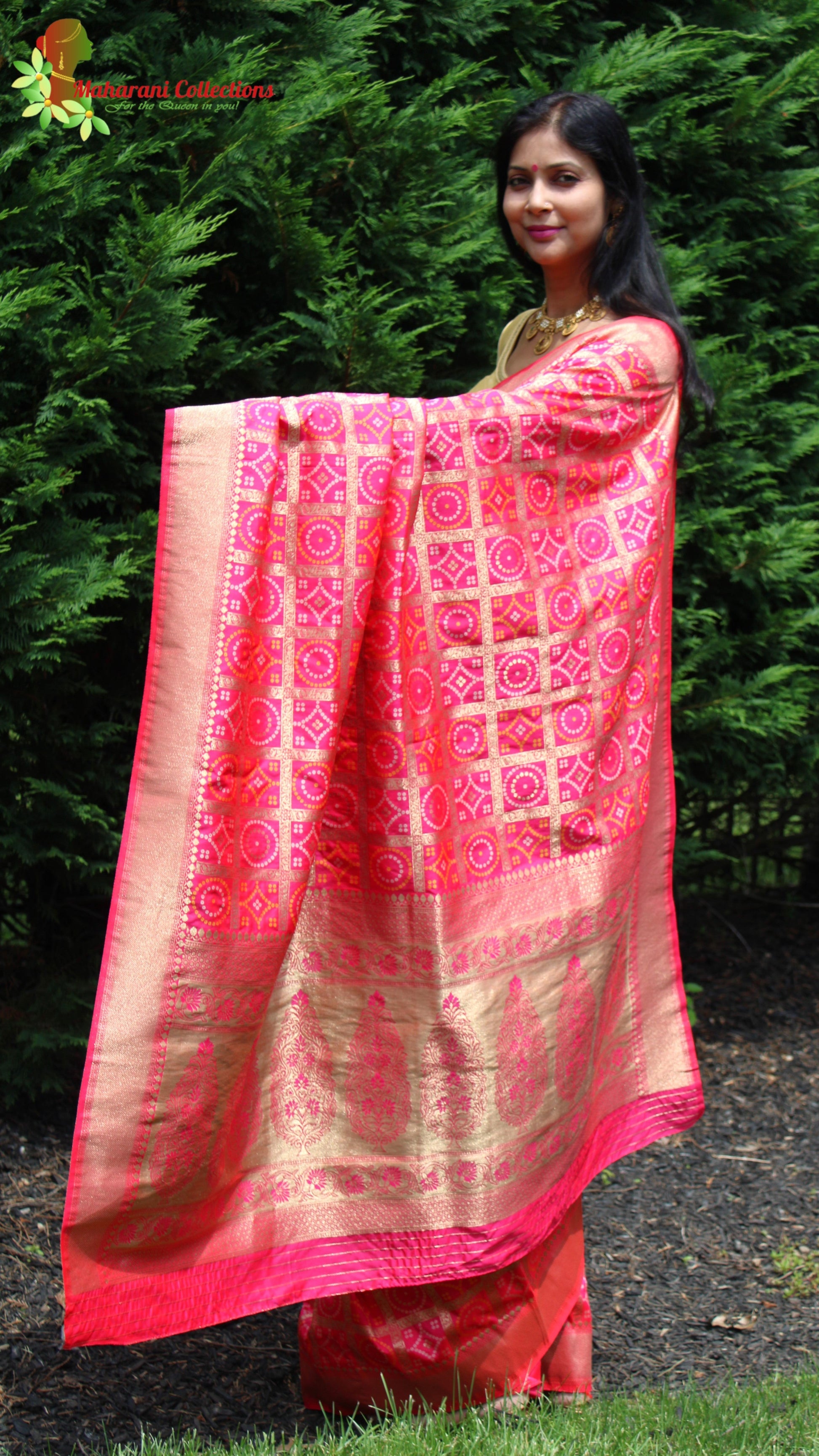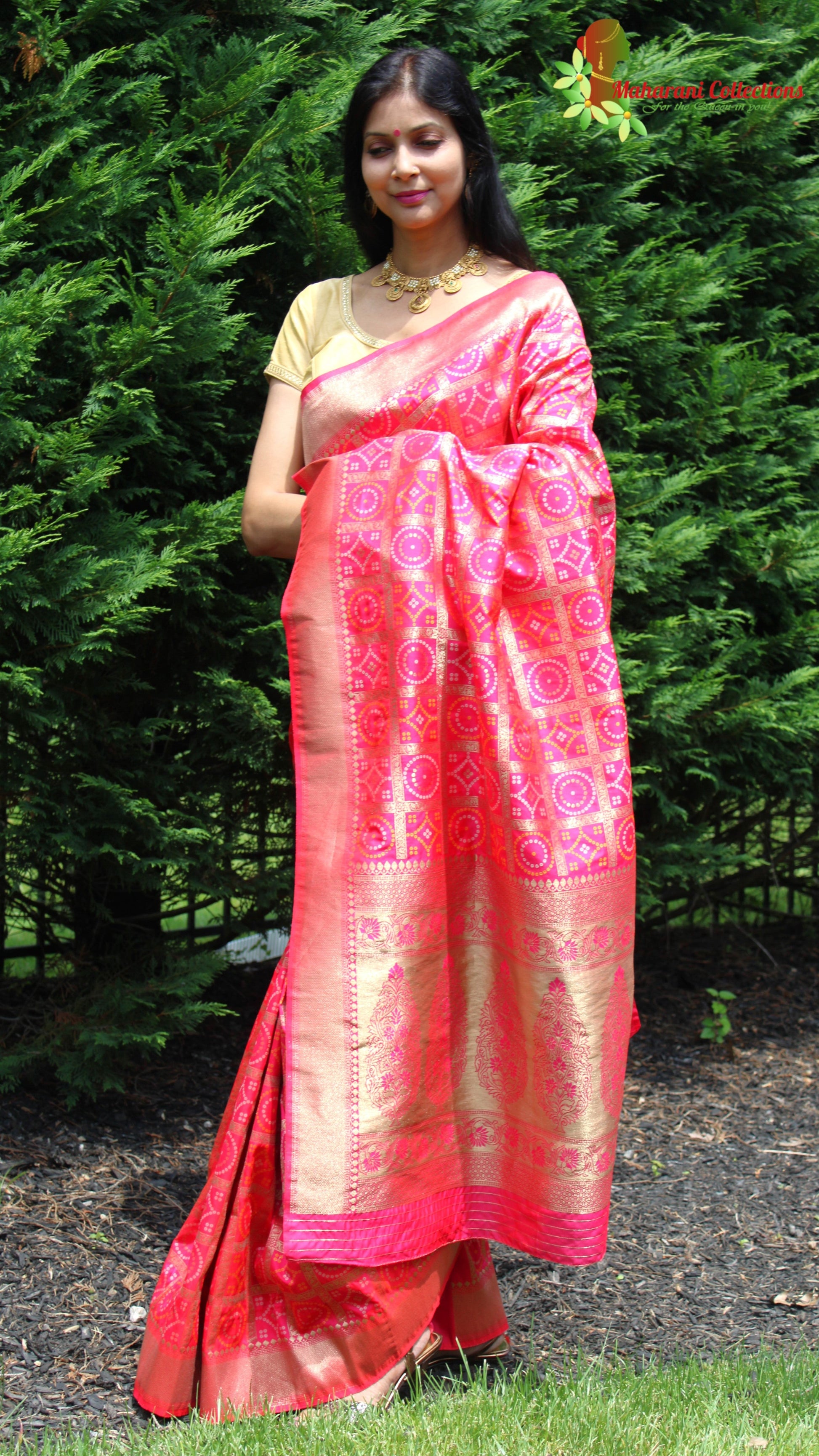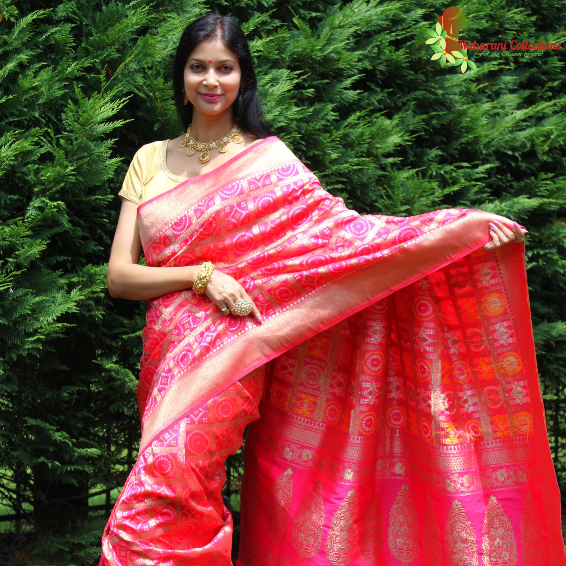 Maharani's Pure Banarasi Ikkat Patola Silk Saree - Pink (with Stitched Blouse and Petticoat)