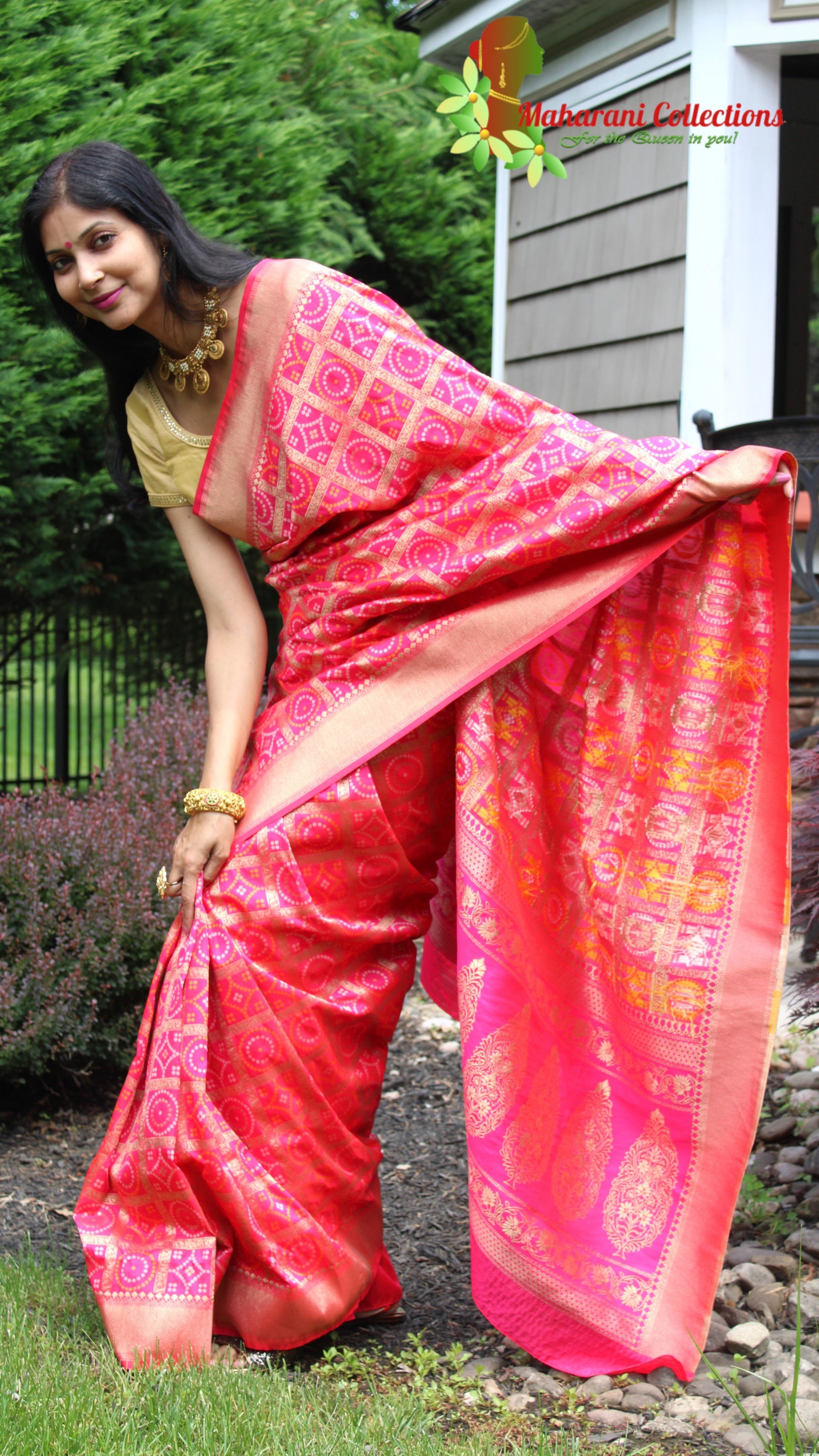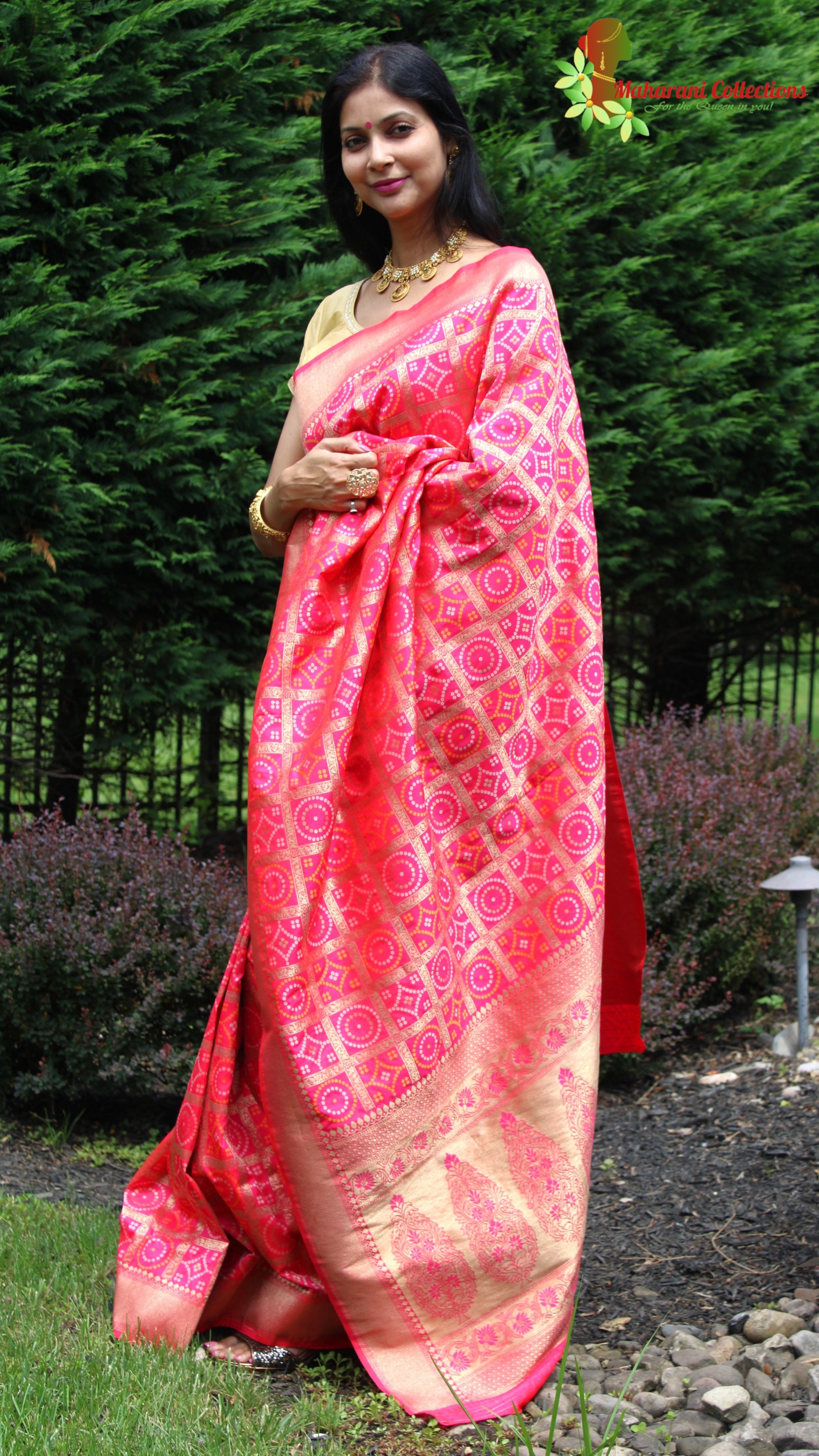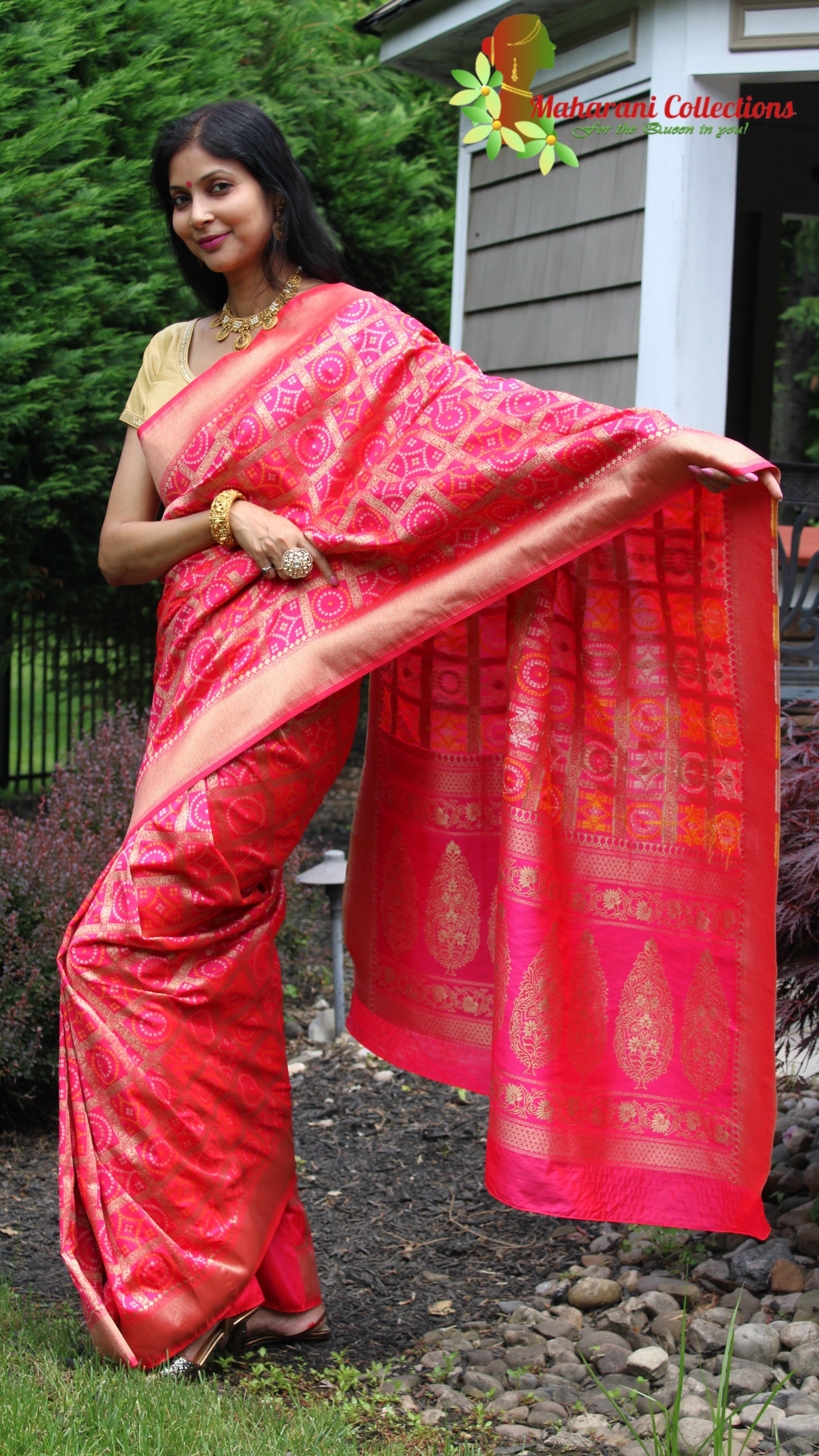 Maharani's Pure Banarasi Ikkat Patola Silk Saree - Pink (with Stitched Blouse and Petticoat)