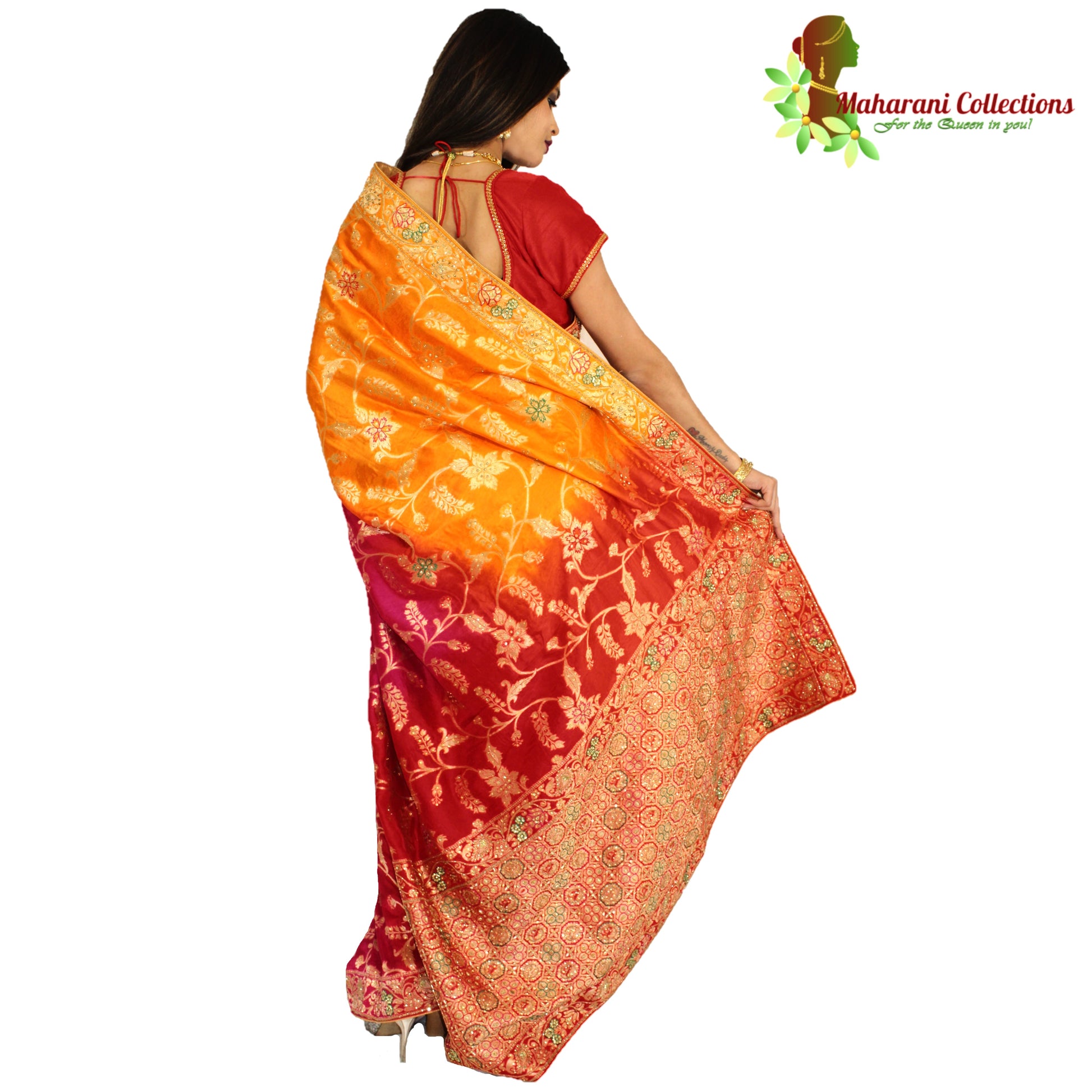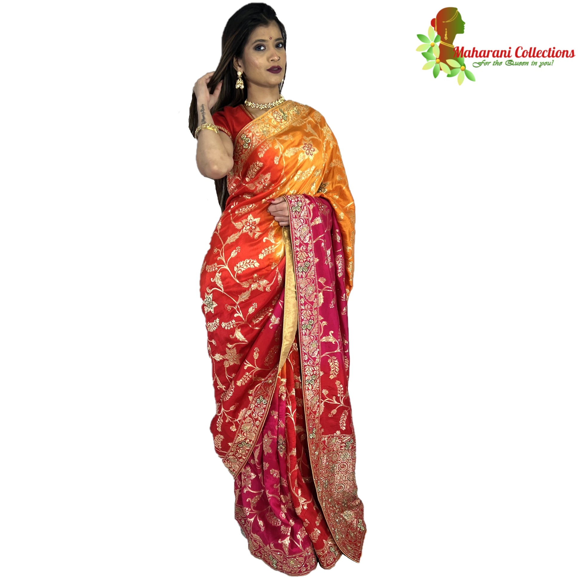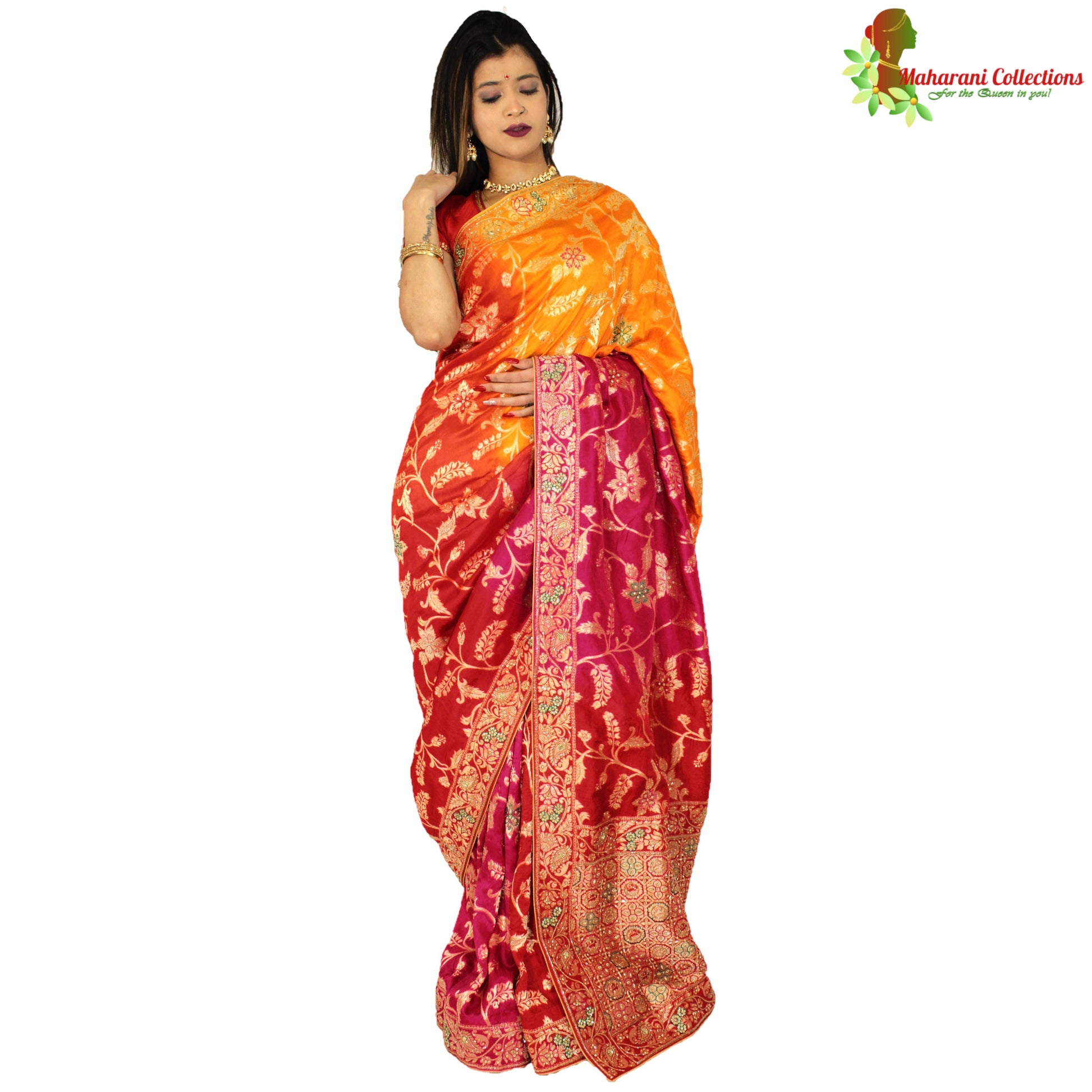 Maharani's Pure Banarasi Silk Saree - Shades of Red/Pink/Orange (with Stitched Petticoat)