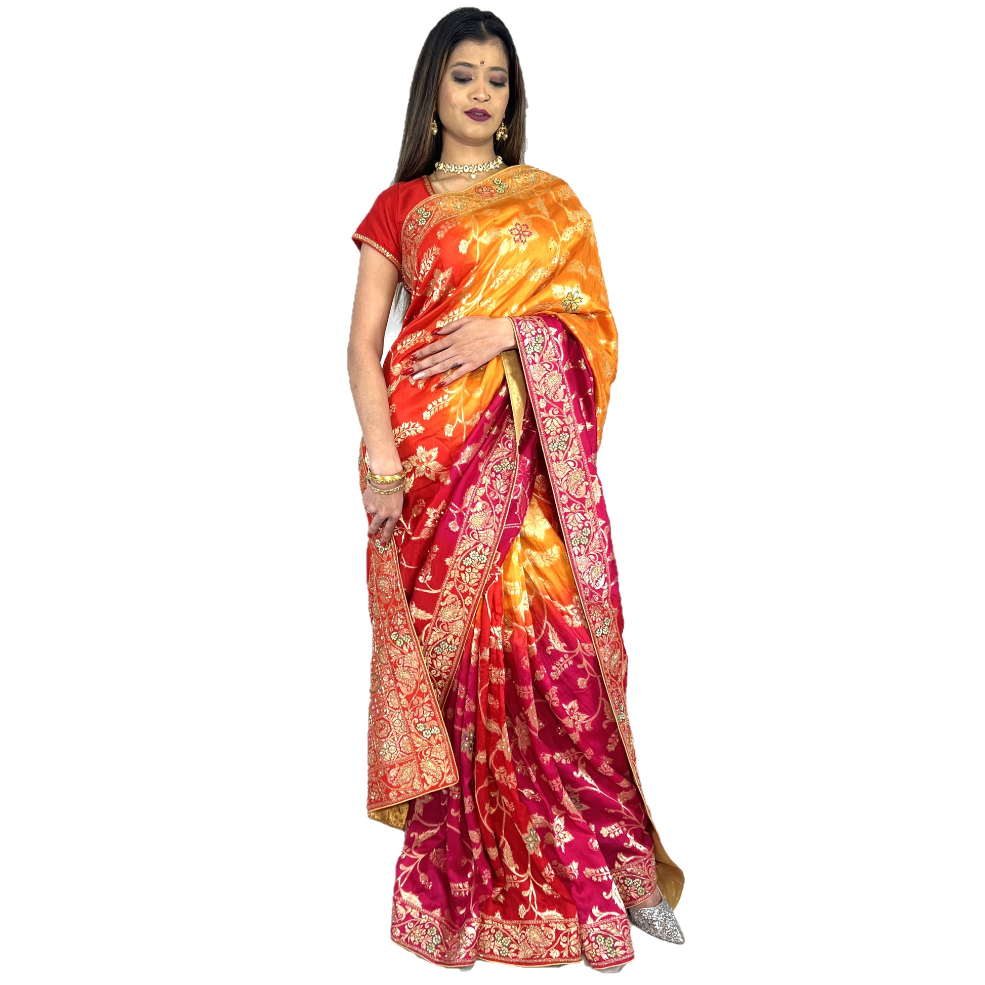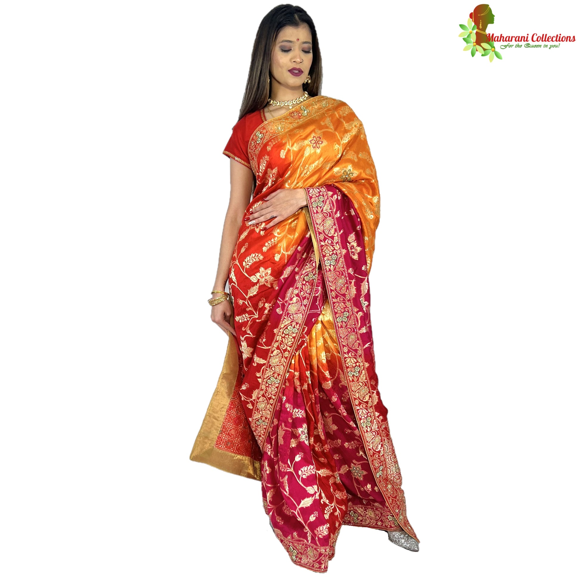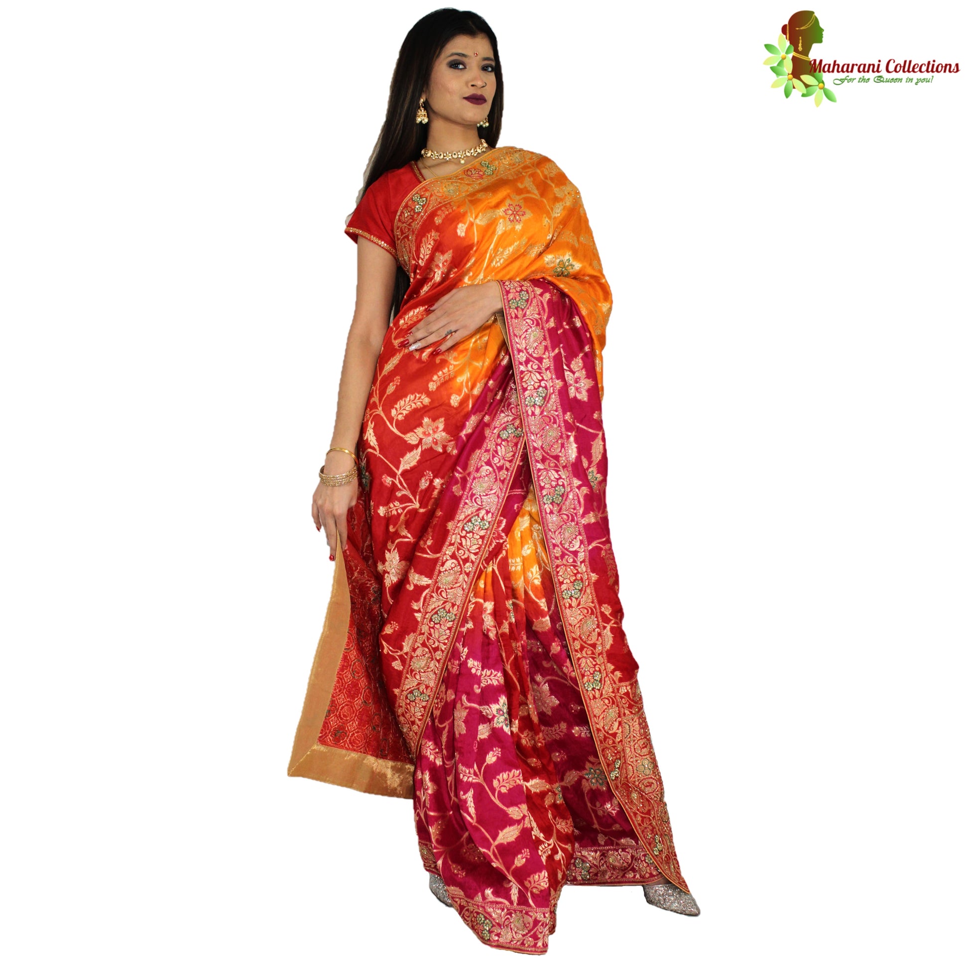 Maharani's Pure Banarasi Silk Saree - Shades of Red/Pink/Orange (with Stitched Petticoat)
