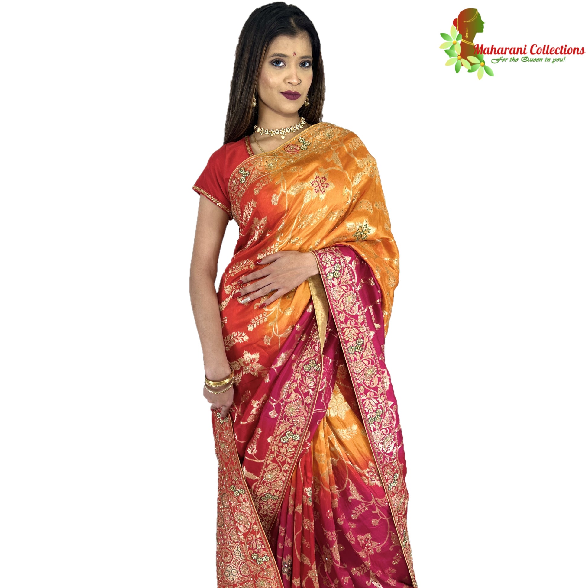 Featuring Maharani's traditional hand-woven Banarasi silk fabric, this saree is embellished with intricately crafted Gotta Patti, Sequins, Thread work and beautiful golden zari, with stitched satin silk petticoat and unstitched blouse piece included. A perfect choice to exude royal elegance.