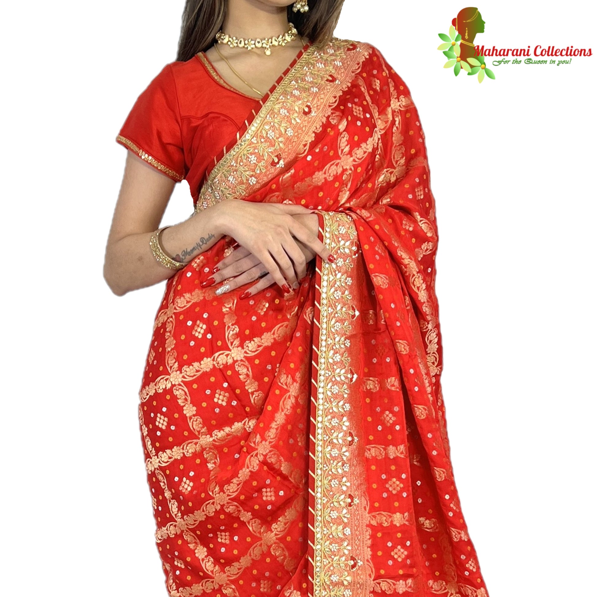 Featuring Maharani's traditional hand-woven Banarasi silk fabric, this saree is embellished with intricately crafted Gotta Patti, Sequins, Thread work and beautiful golden zari, with stitched satin silk petticoat and unstitched blouse piece included. A perfect choice to exude royal elegance.