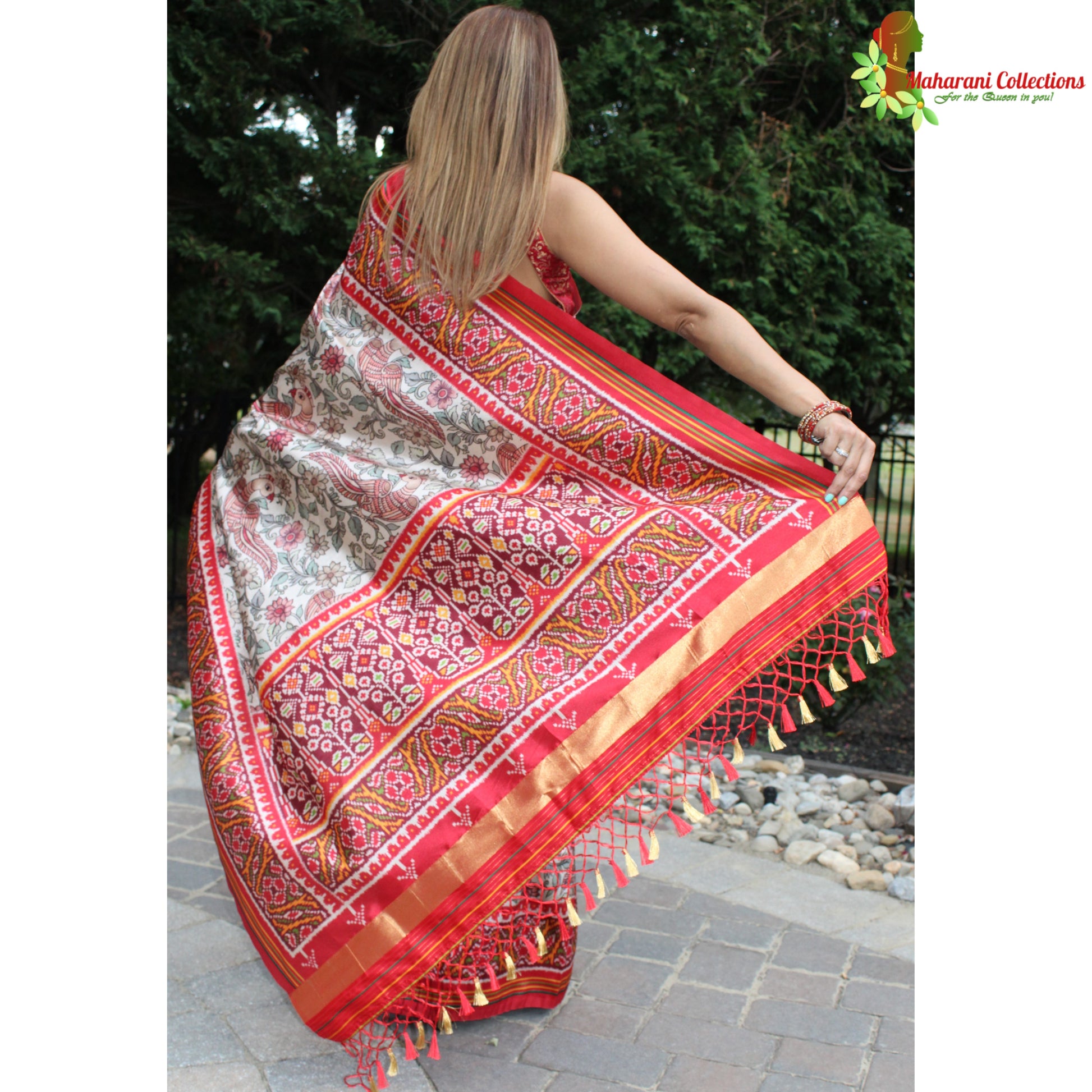 Maharani's Pure Banarasi Silk Saree - Cream and Red (with stitched Blouse and Petticoat)
