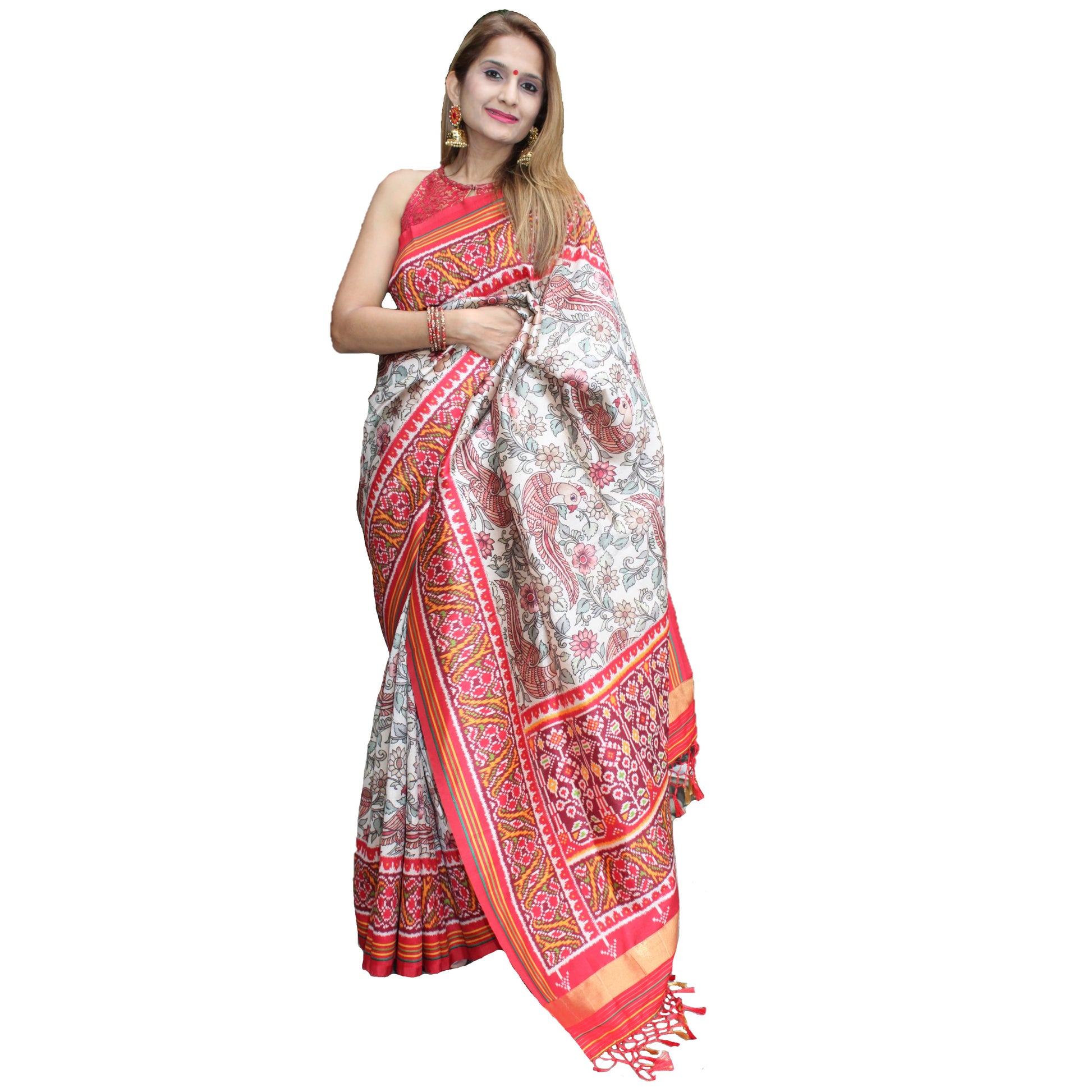 Authentic pure Banarasi Silk saree with ready-to-wear stitched blouse and matching unstitched blouse piece. All stitching is done as per Maharani's specification with original and authentic material. Elegant 3D floral Print, Ikkat and overall Kalamkari work, Fall and Pico is done.