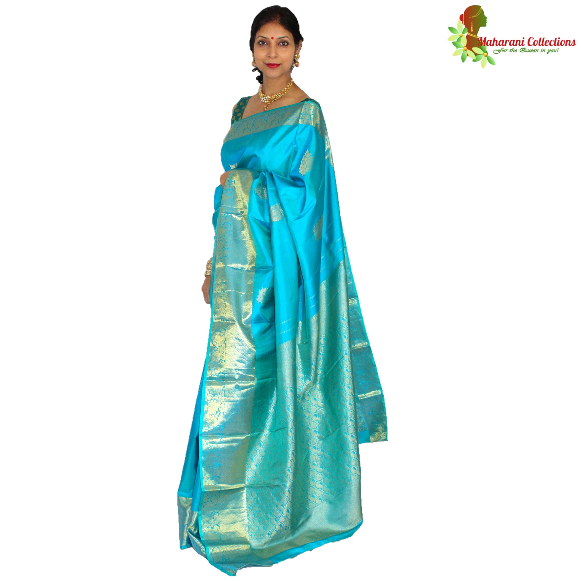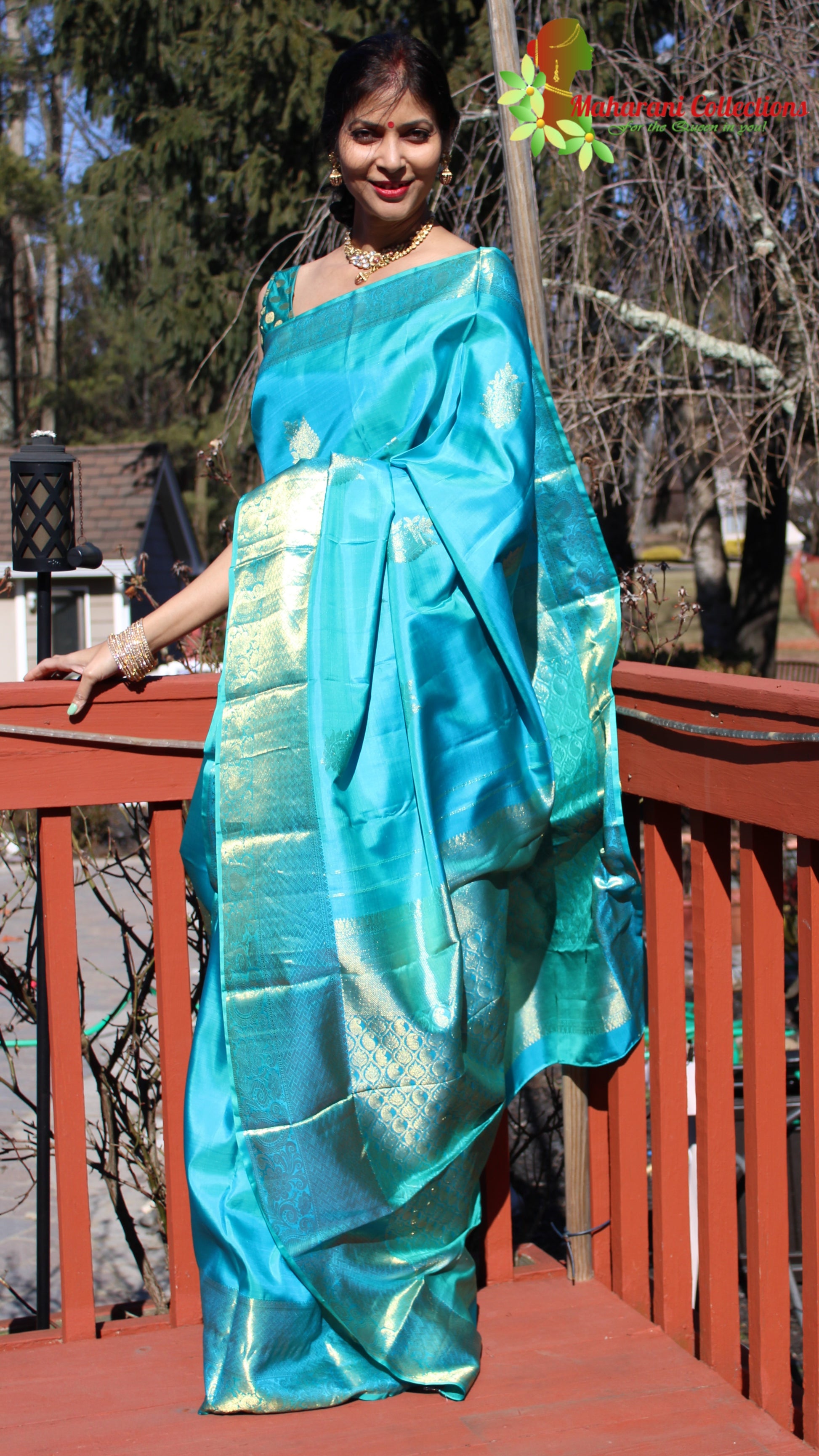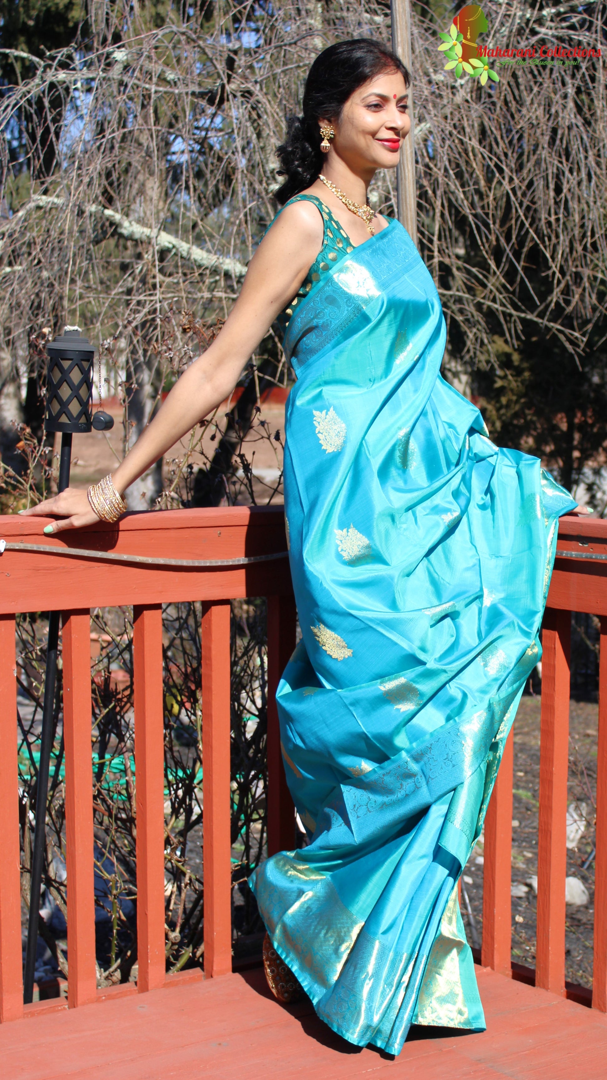 Maharani's Pure Handloom Kanjivaram Silk Saree - Greenish Blue with Golden Zari and Boota Work