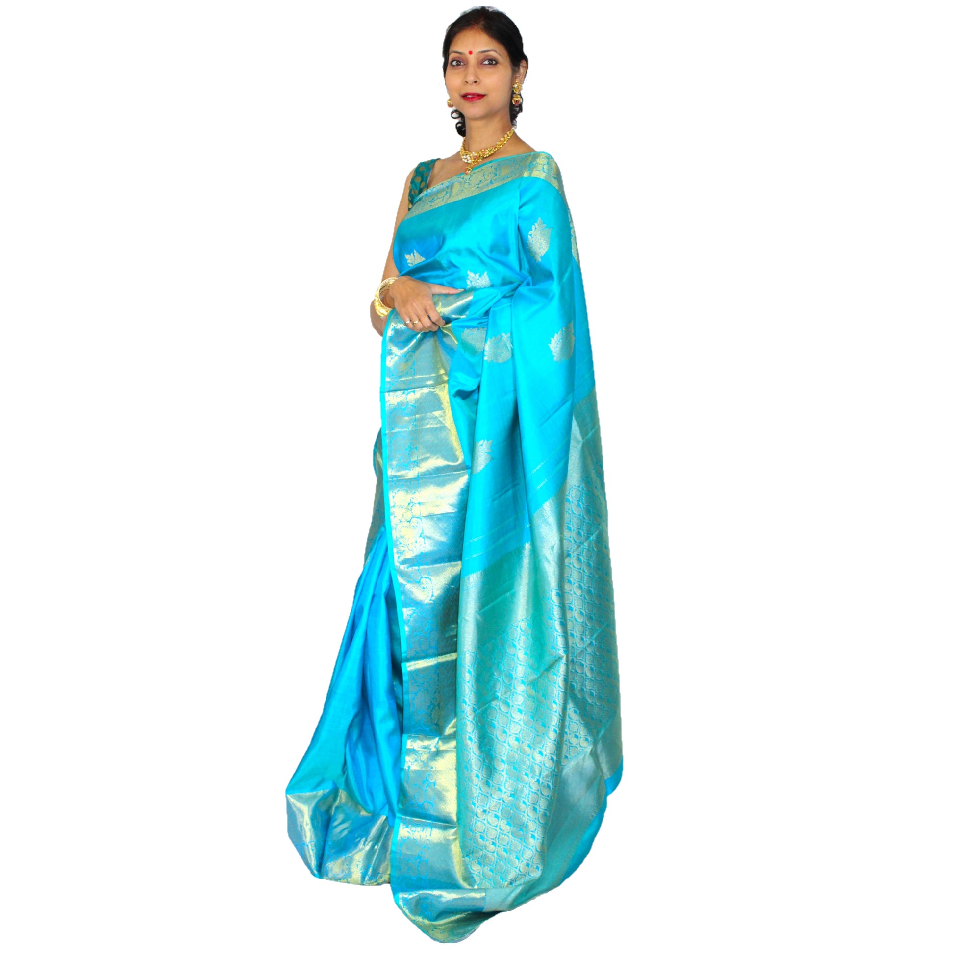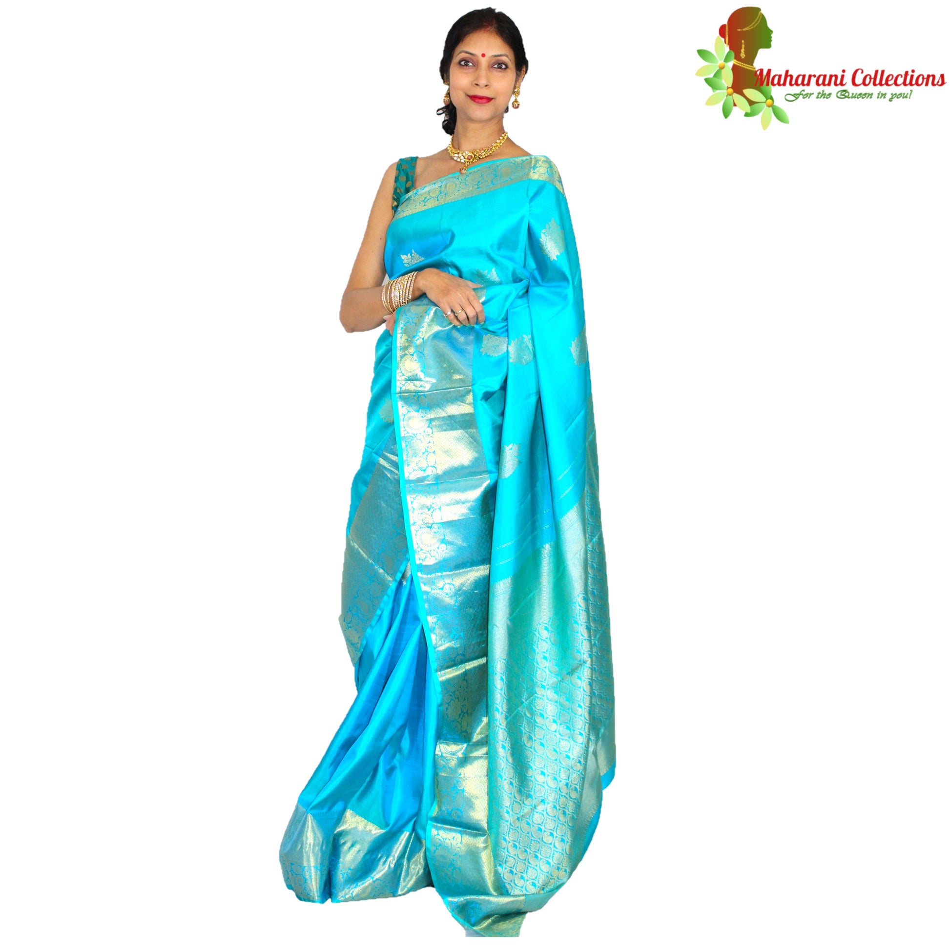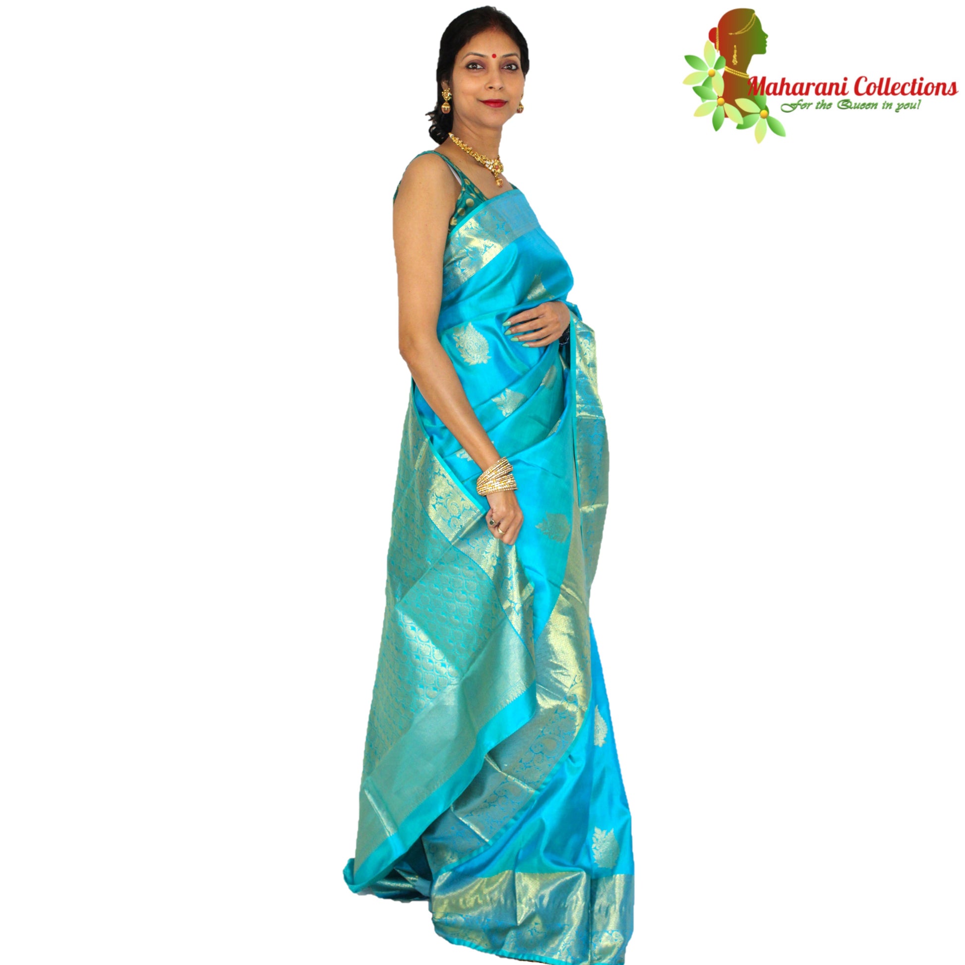Maharani's Pure Handloom Kanjivaram Silk Saree - Greenish Blue with Golden Zari and Boota Work