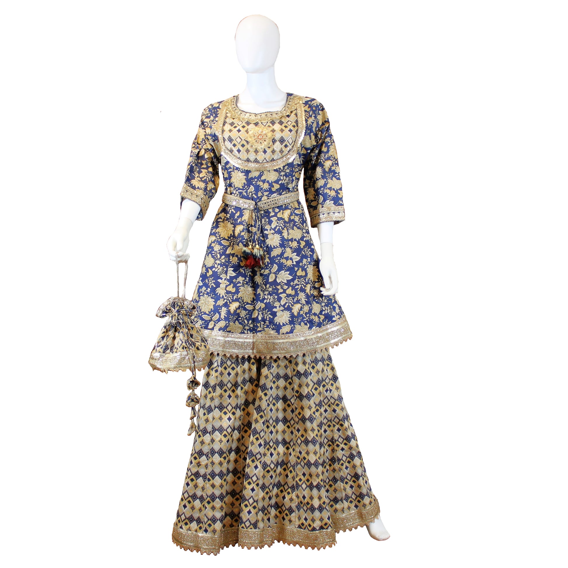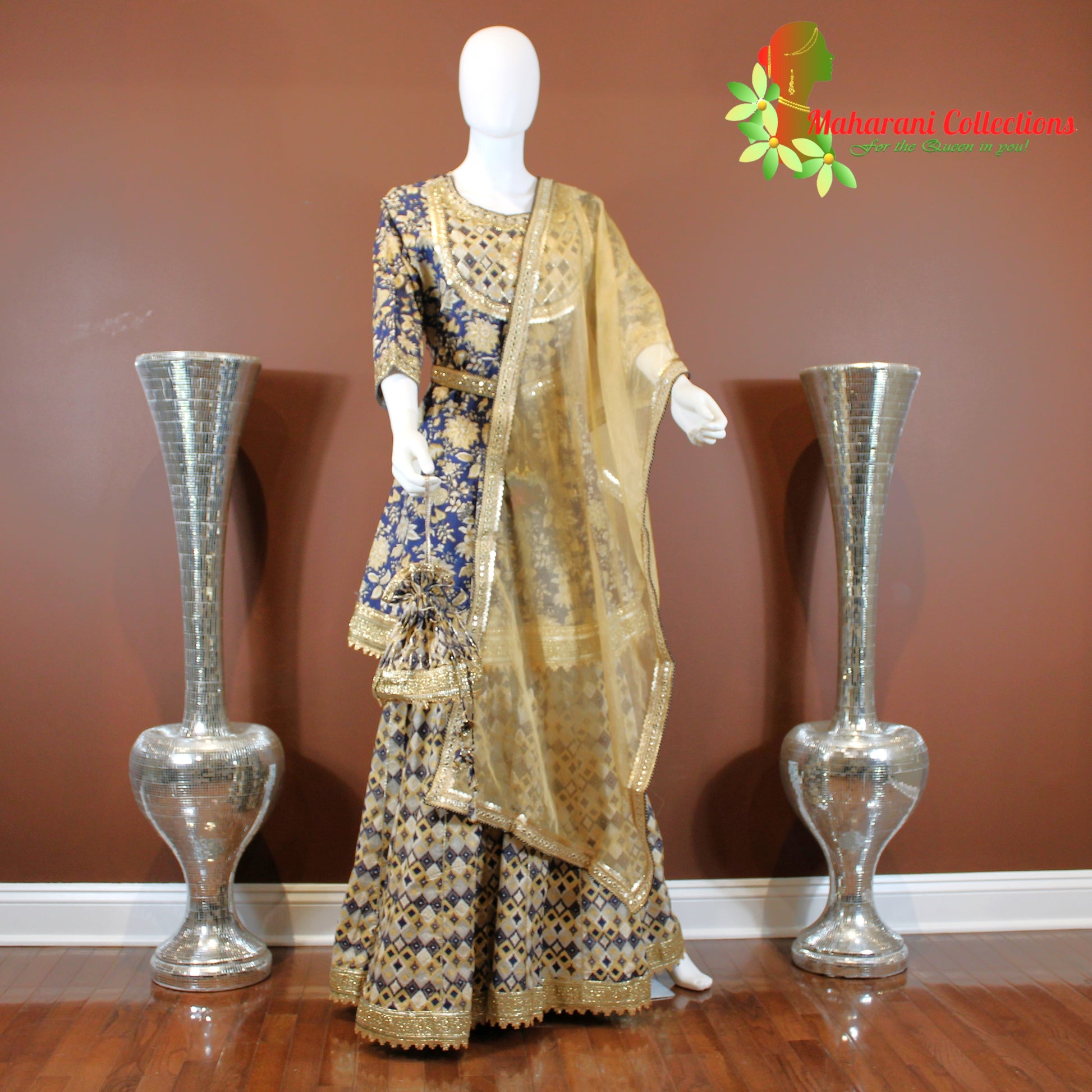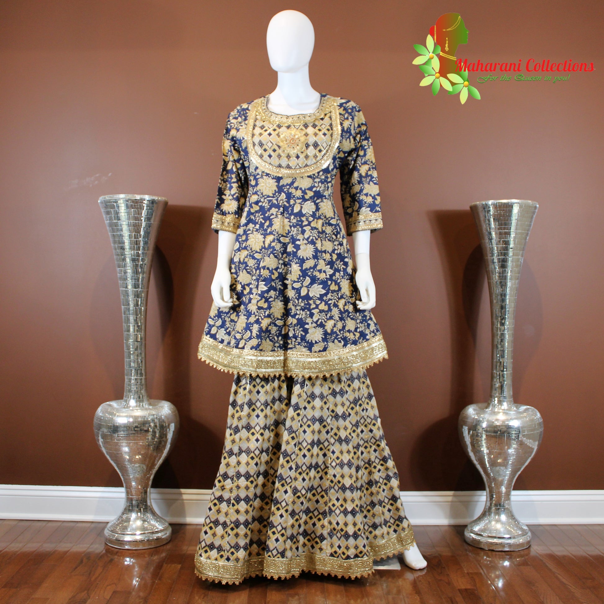 Maharani's Designer Linen Silk Sharara Suit - Blue (L, XL)