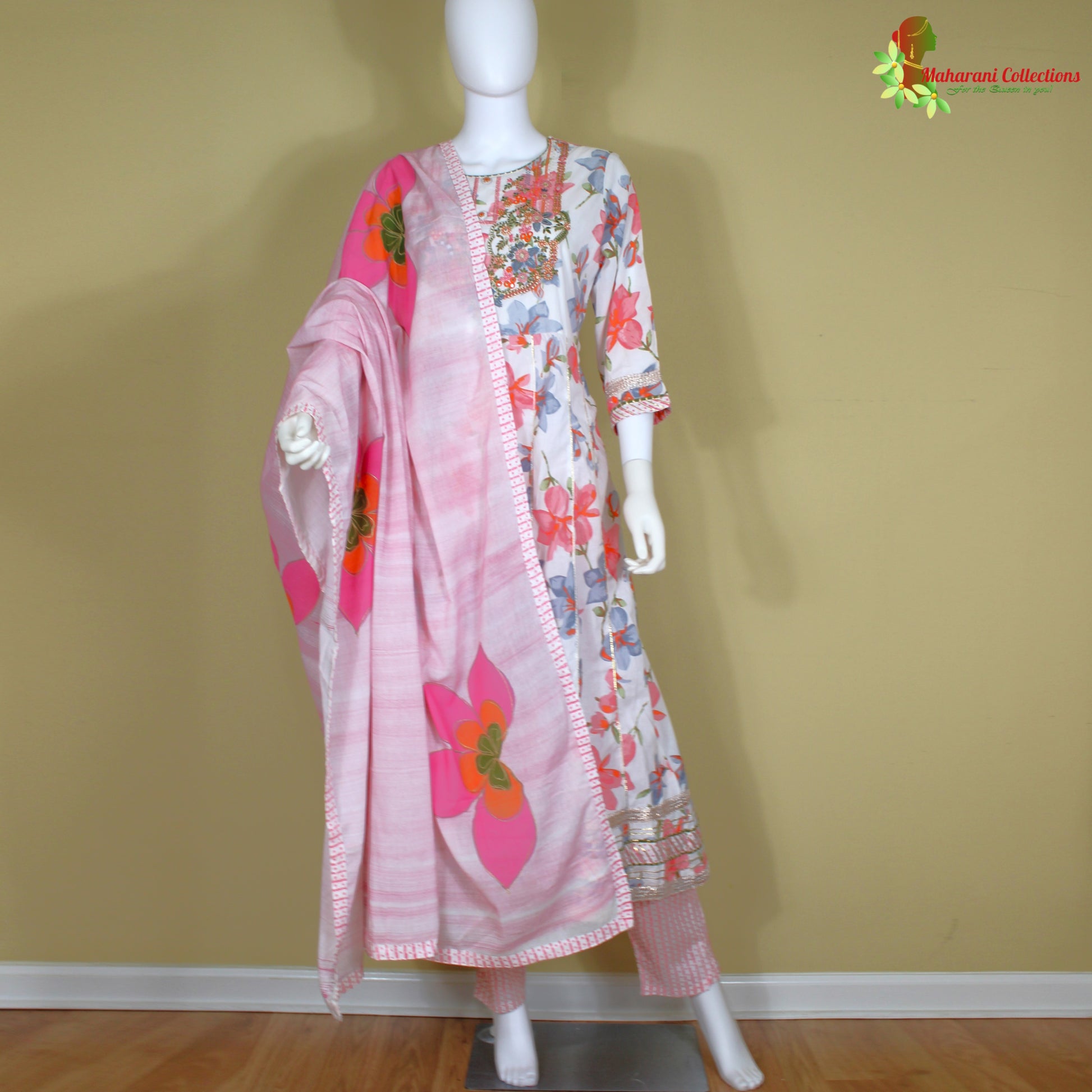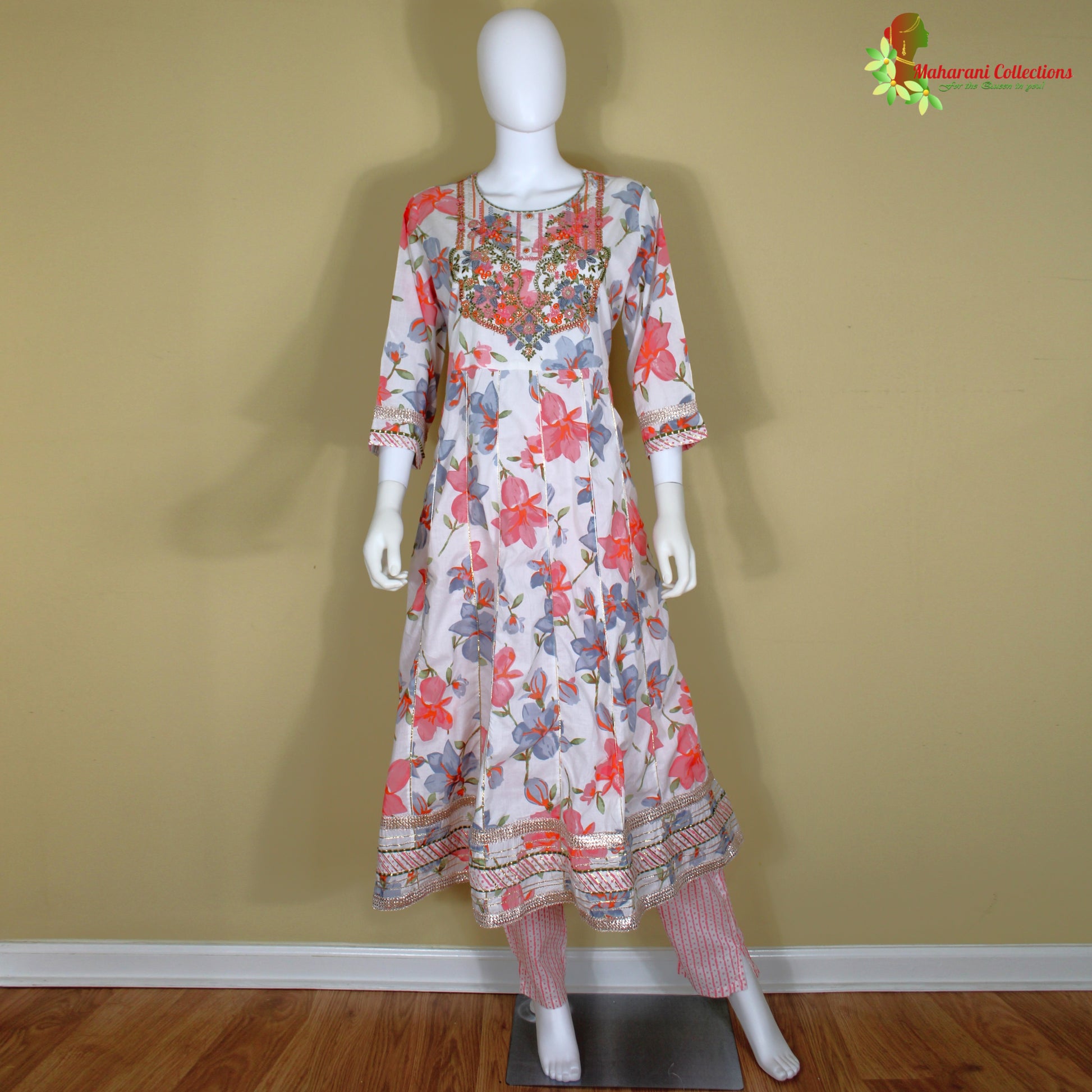 Maharani's Anarkali Suit - White Floral (M) - Pure Muslin Silk