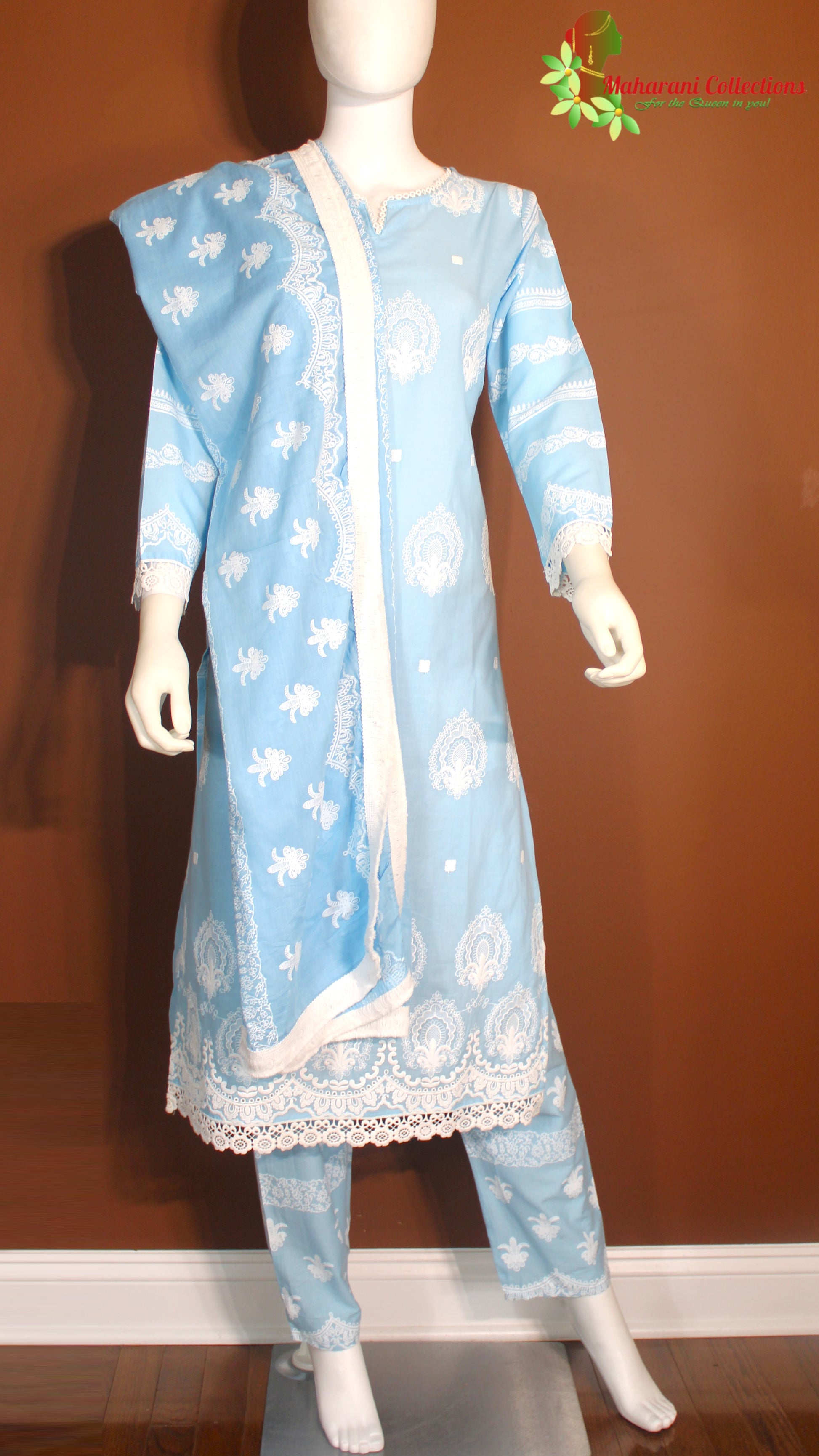 Maharani's Pant Suit with overall Thread and print work, matching Pant and Sky-Blue soft Cotton printed Dupatta.