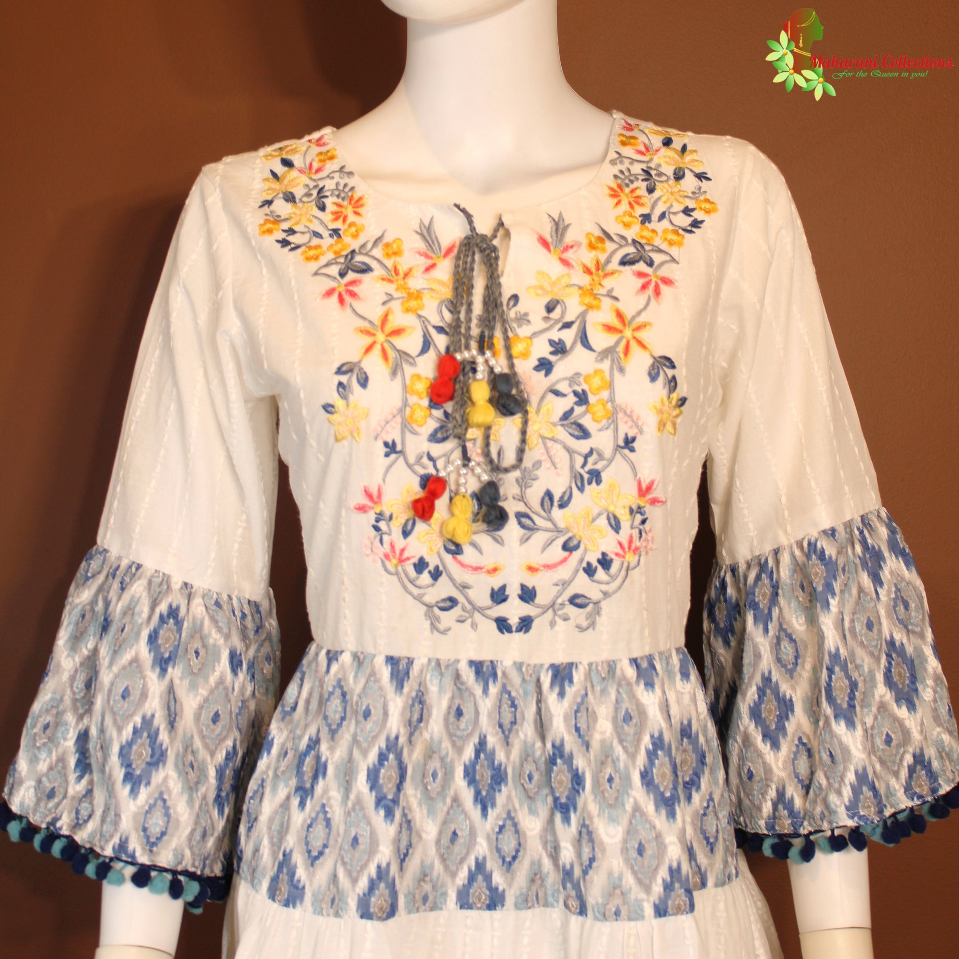 Maharani's Short Dress - Pure Cotton - White and Blue (S)