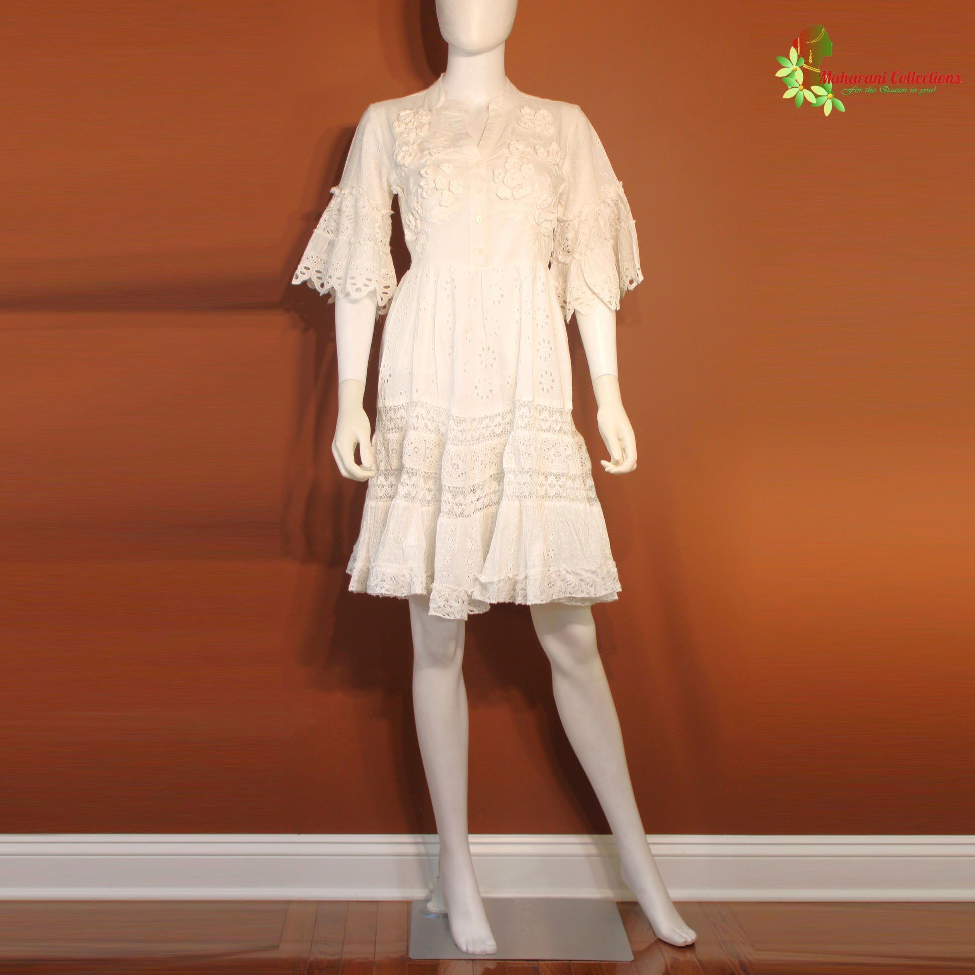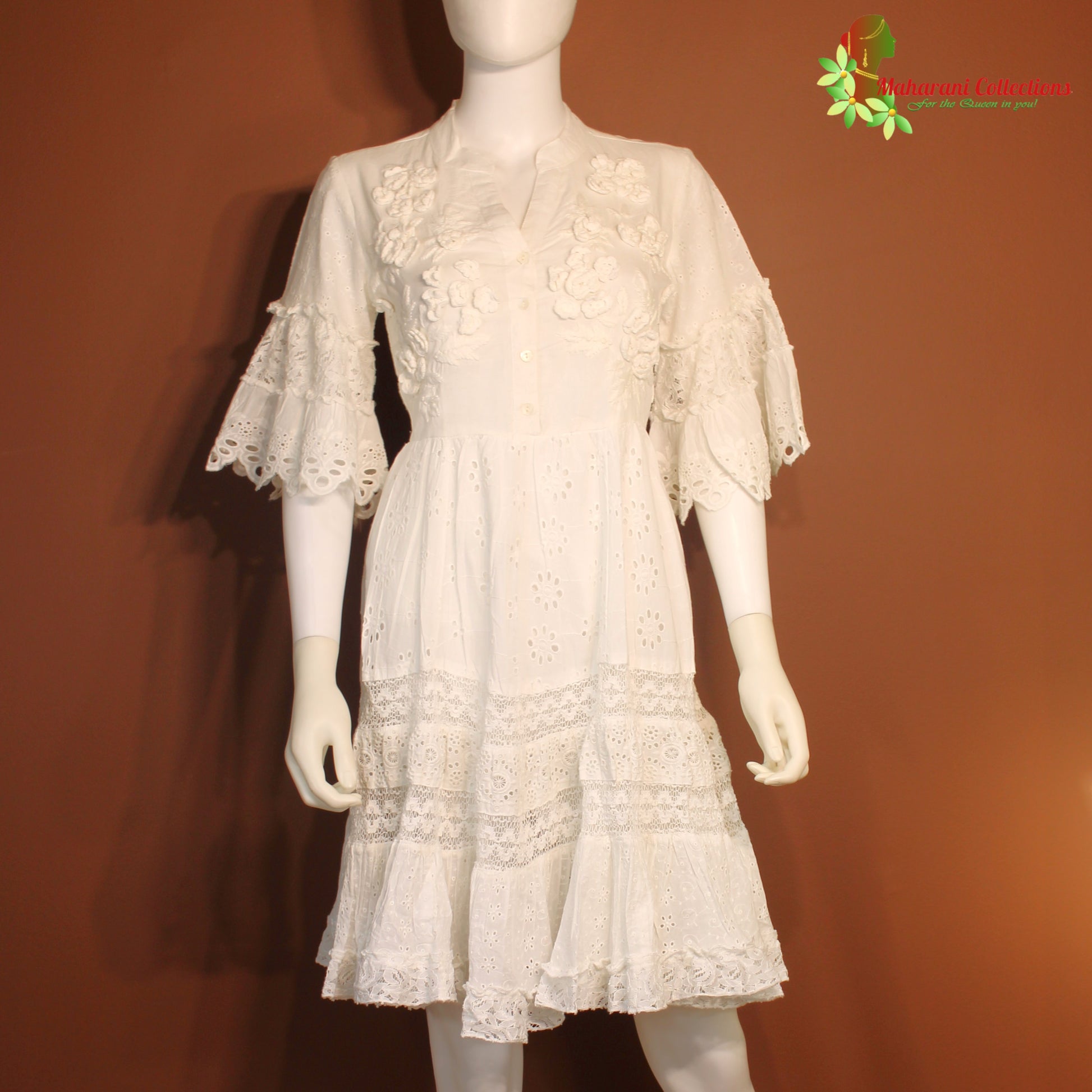 Maharani's Short Dress with Stitched Cotton Liner, Front Button, Thread Work, Lace Work.