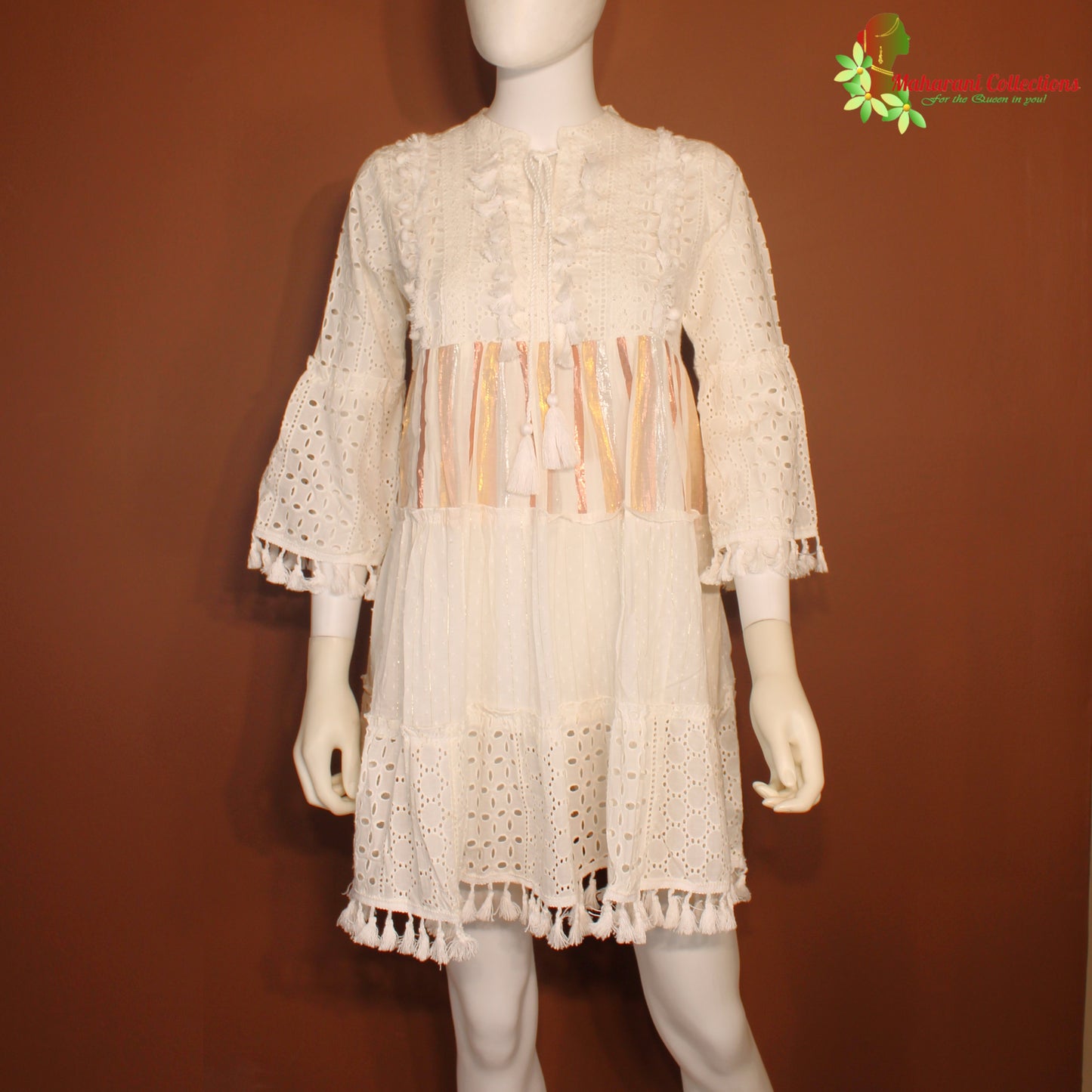 Maharani's Short Dress with Stitched cotton lining, Thread and Lace work, Front String Tassel.