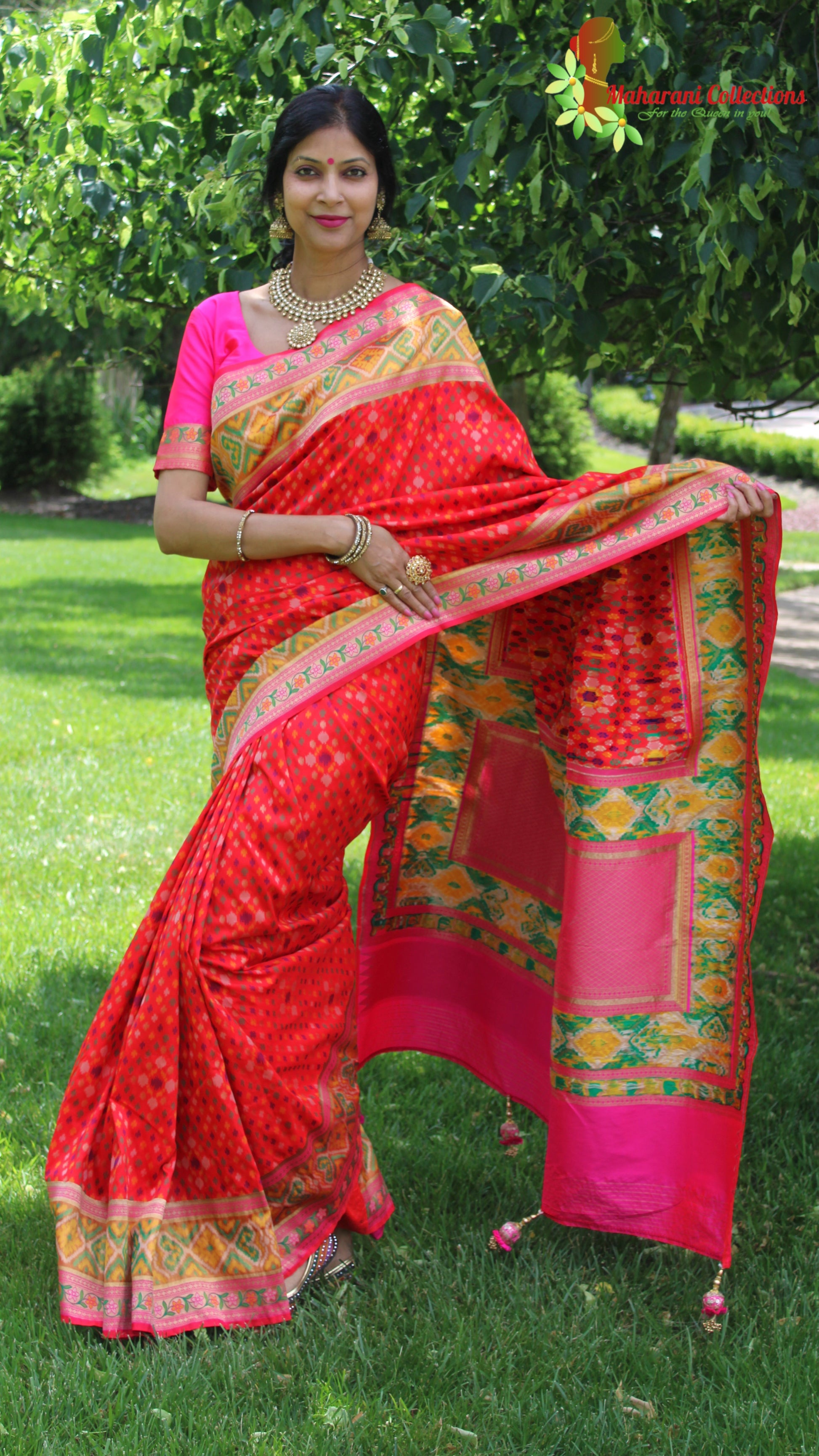 Maharani's Pure Banarasi Ikkat Patola Silk Saree - Red (with Stitched Blouse and Petticoat)