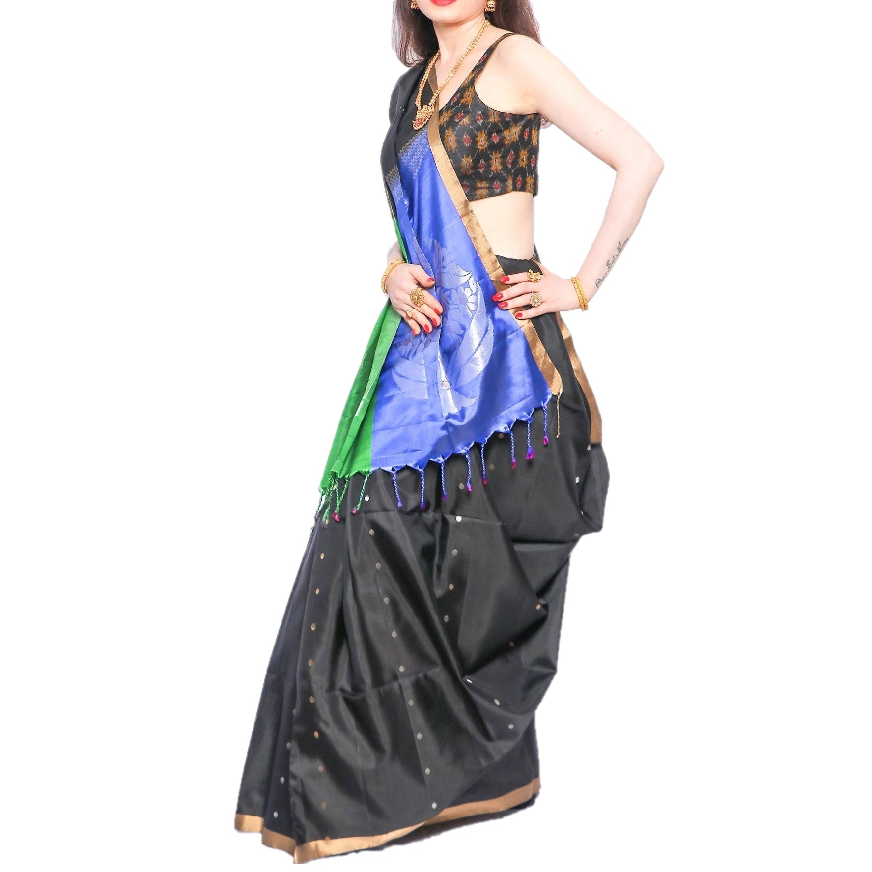 Maharani's finest Kanjivaram - Black, Purple, Green and Blue authentic handloom weaved Kanjivaram (Kanchipuram) Silk Saree with golden Zari and allover golden Boota work, contrasting border and Pallu and Maharani's elegance!