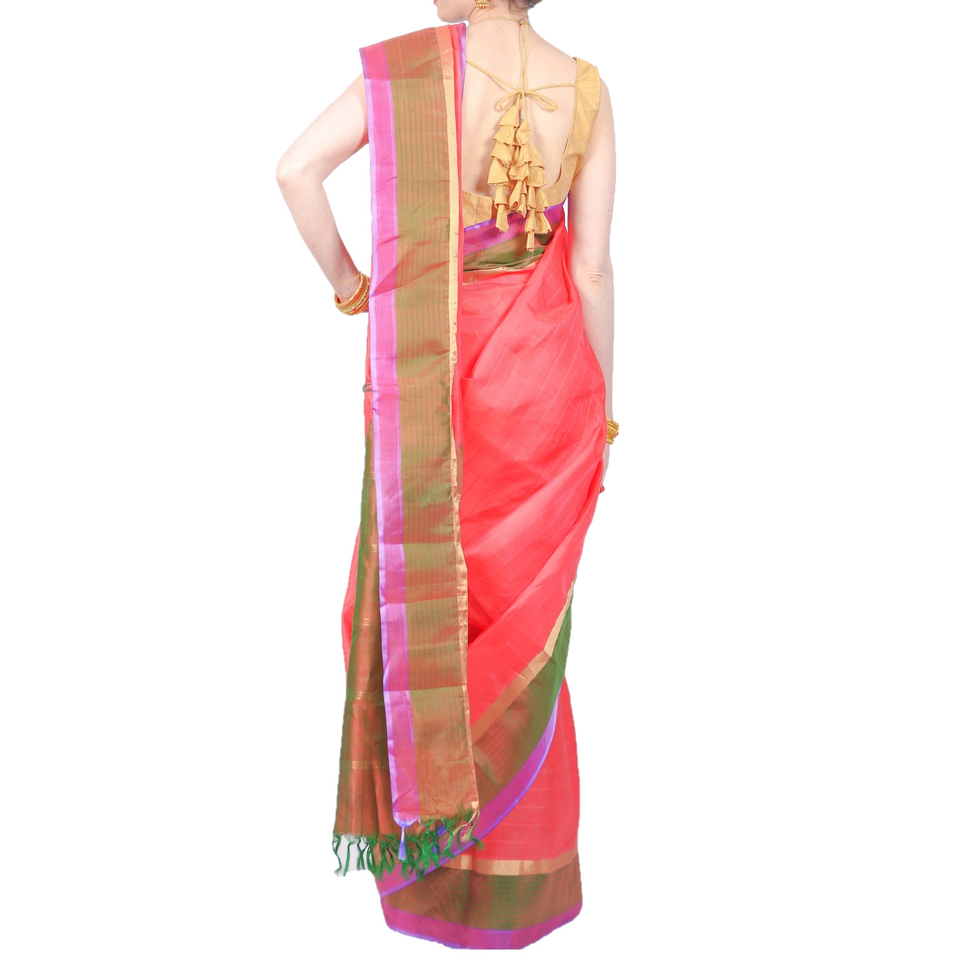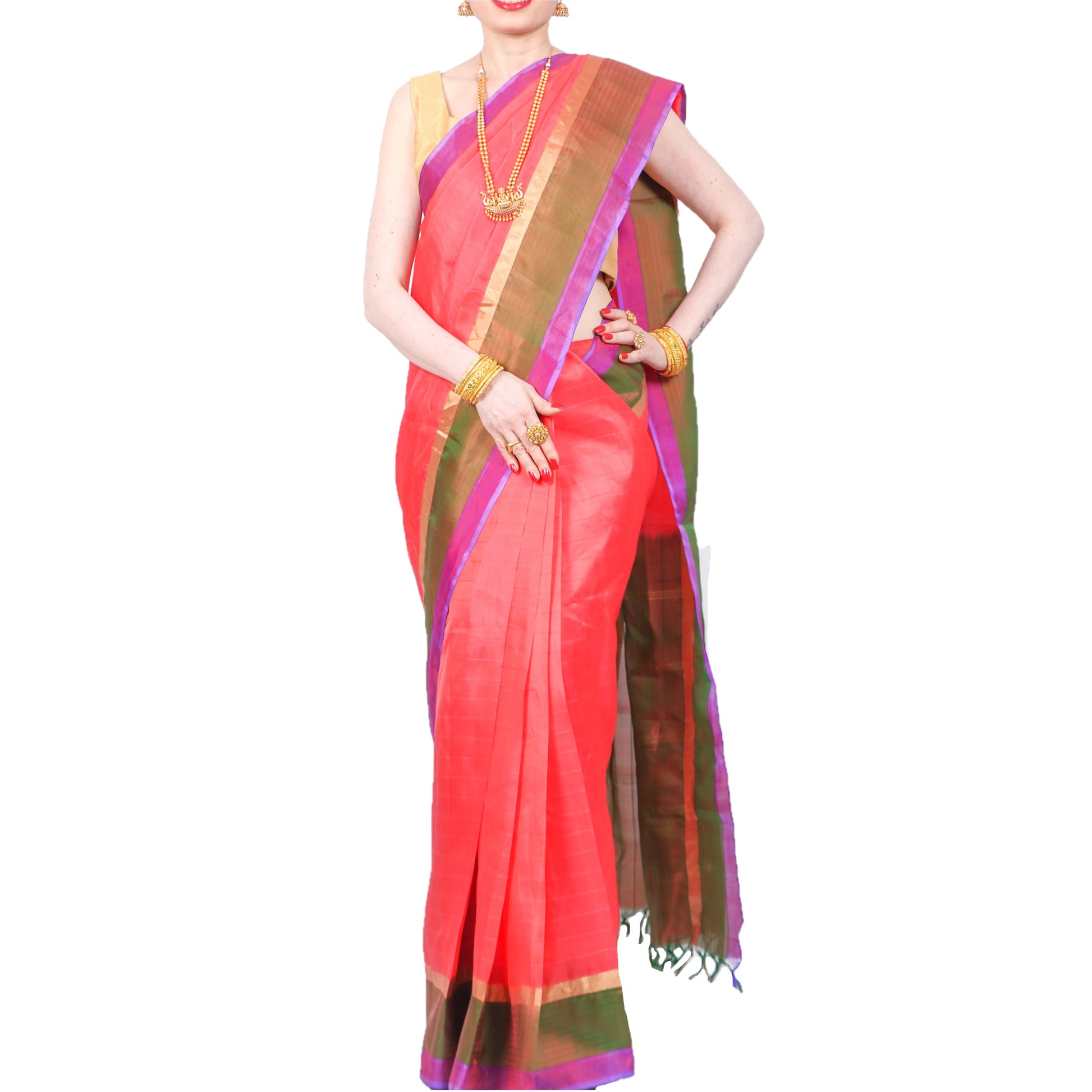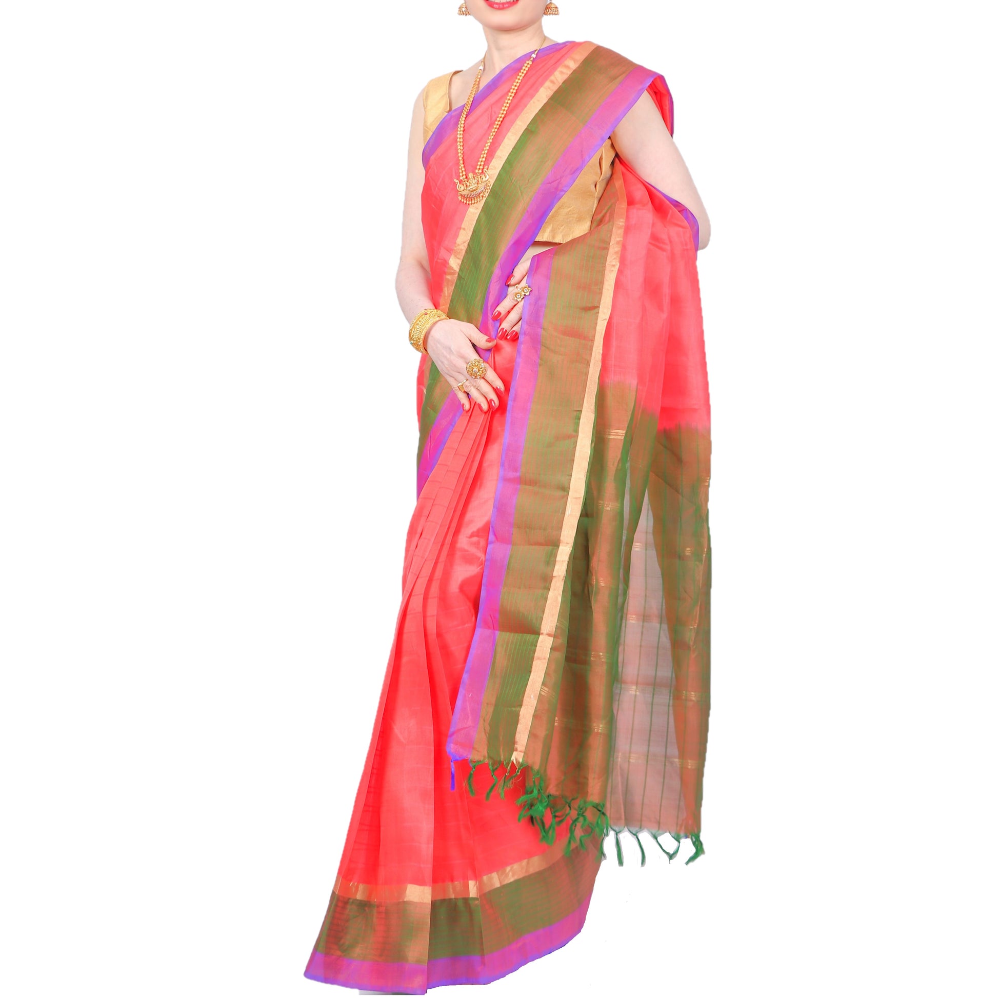 Orange. green and purple authentic handloom-weave Kanjivaram (Kanchipuram) Silk Saree with golden Zari work, contrasting border and Pallu and Maharani's elegance!