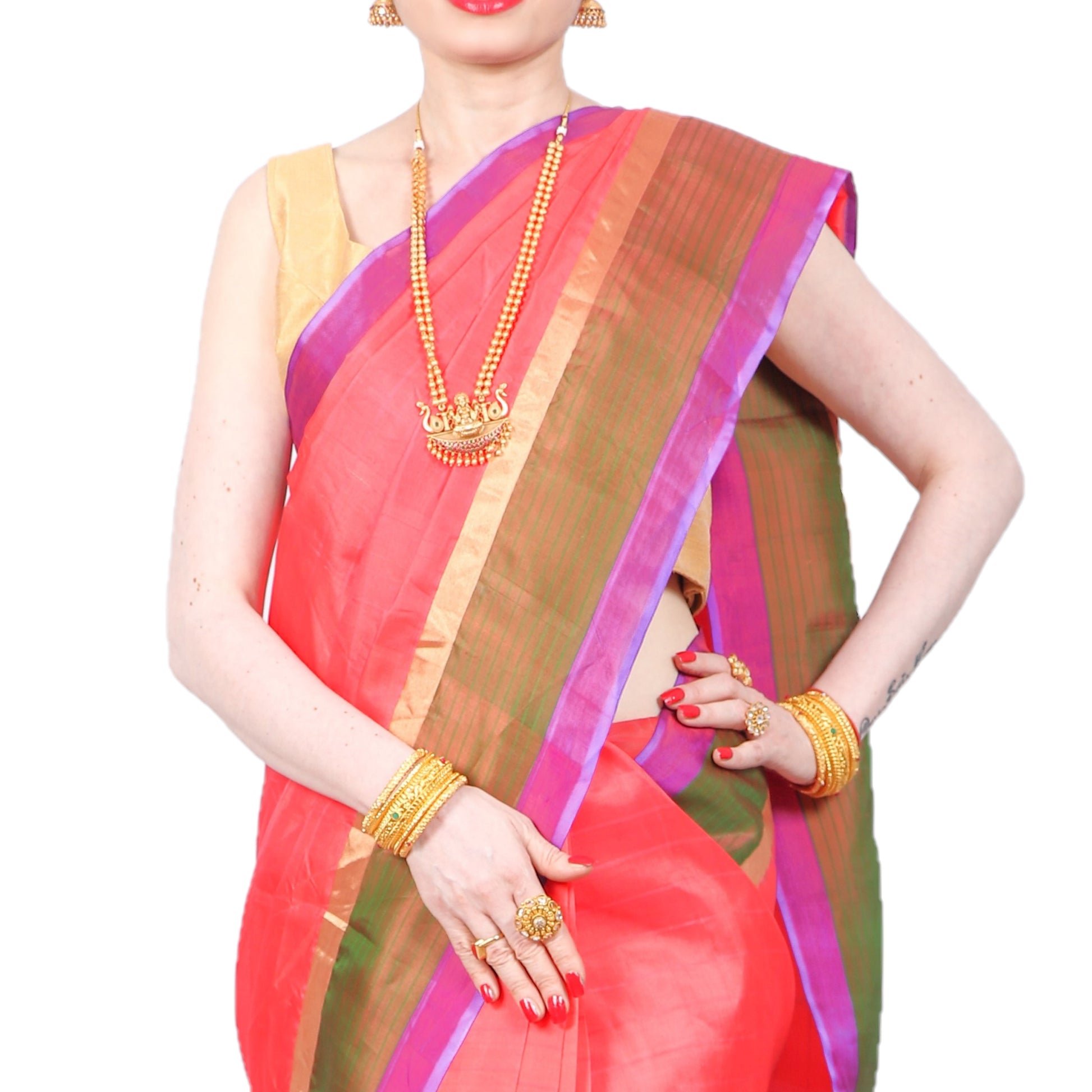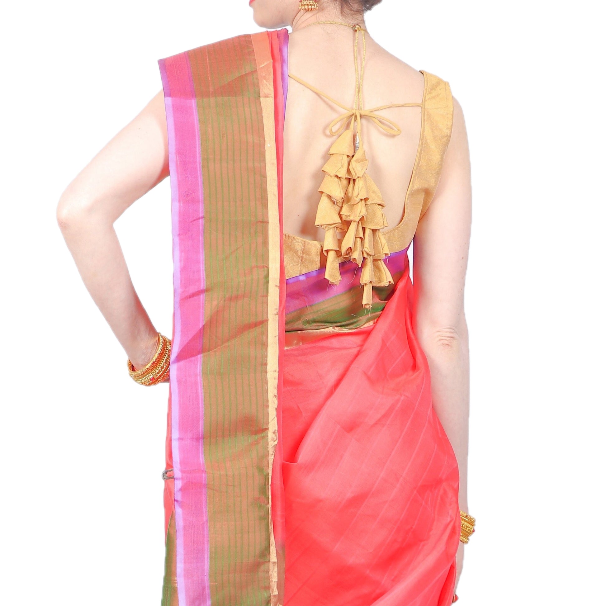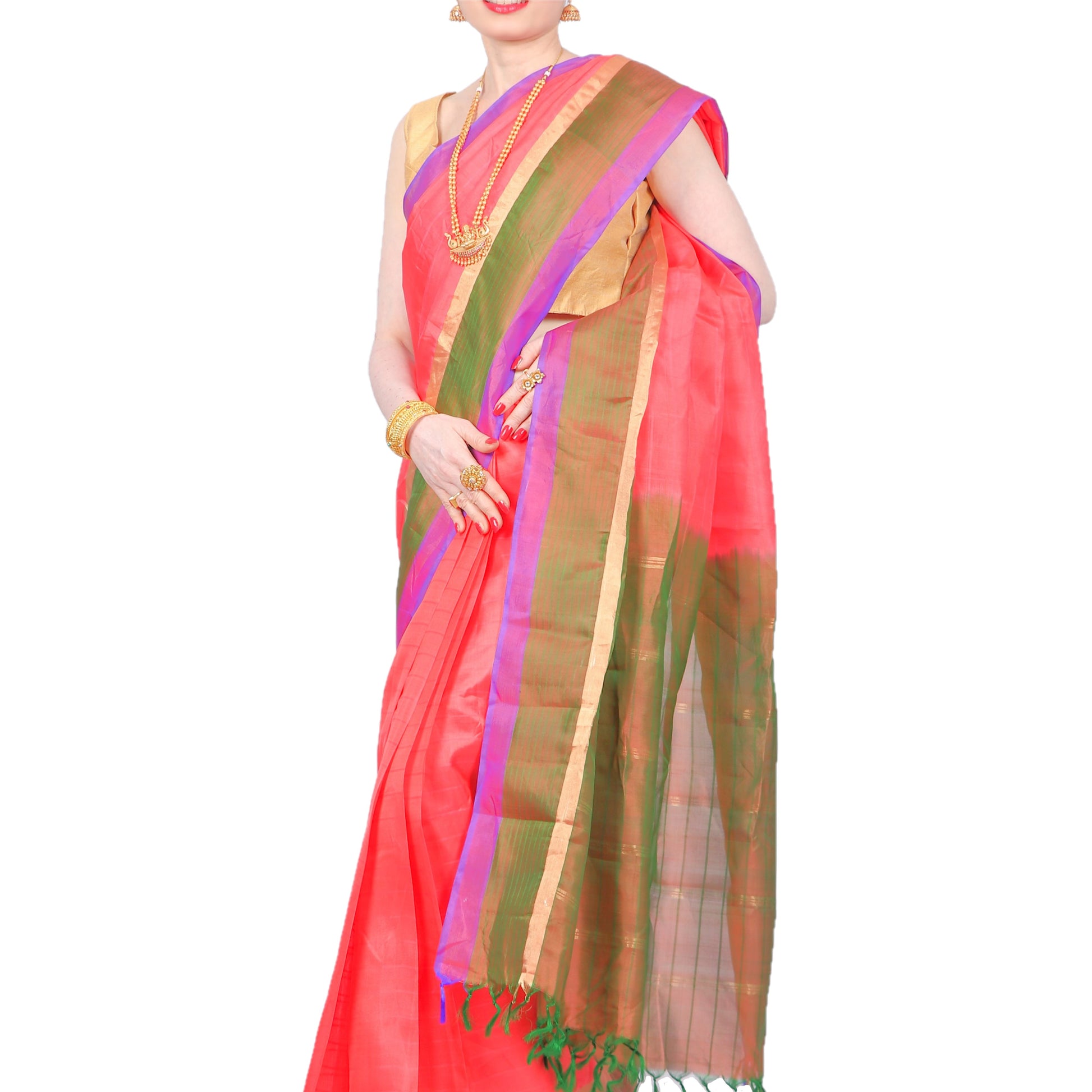 Orange. green and purple authentic handloom-weave Kanjivaram (Kanchipuram) Silk Saree with golden Zari work, contrasting border and Pallu and Maharani's elegance!