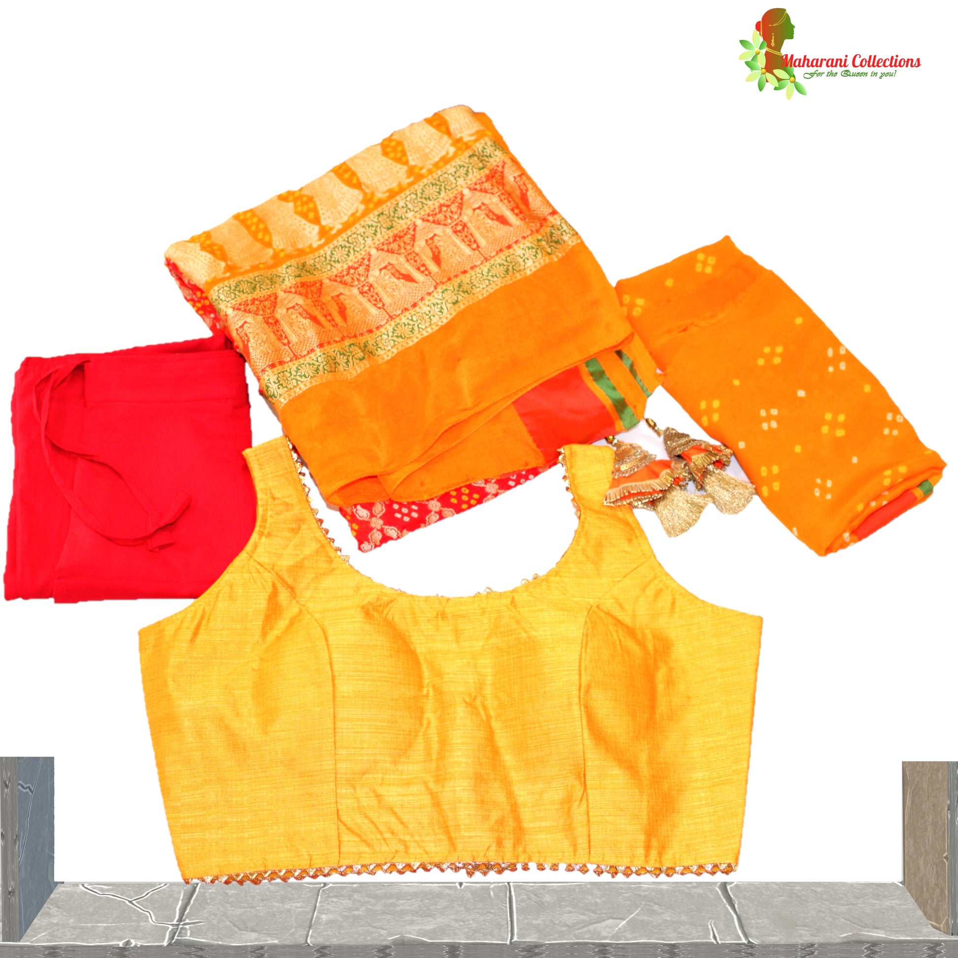 Maharani's Pure Handloom Banarasi Bandhej Saree - Red and Orange (with Stitched Blouse & Petticoat)