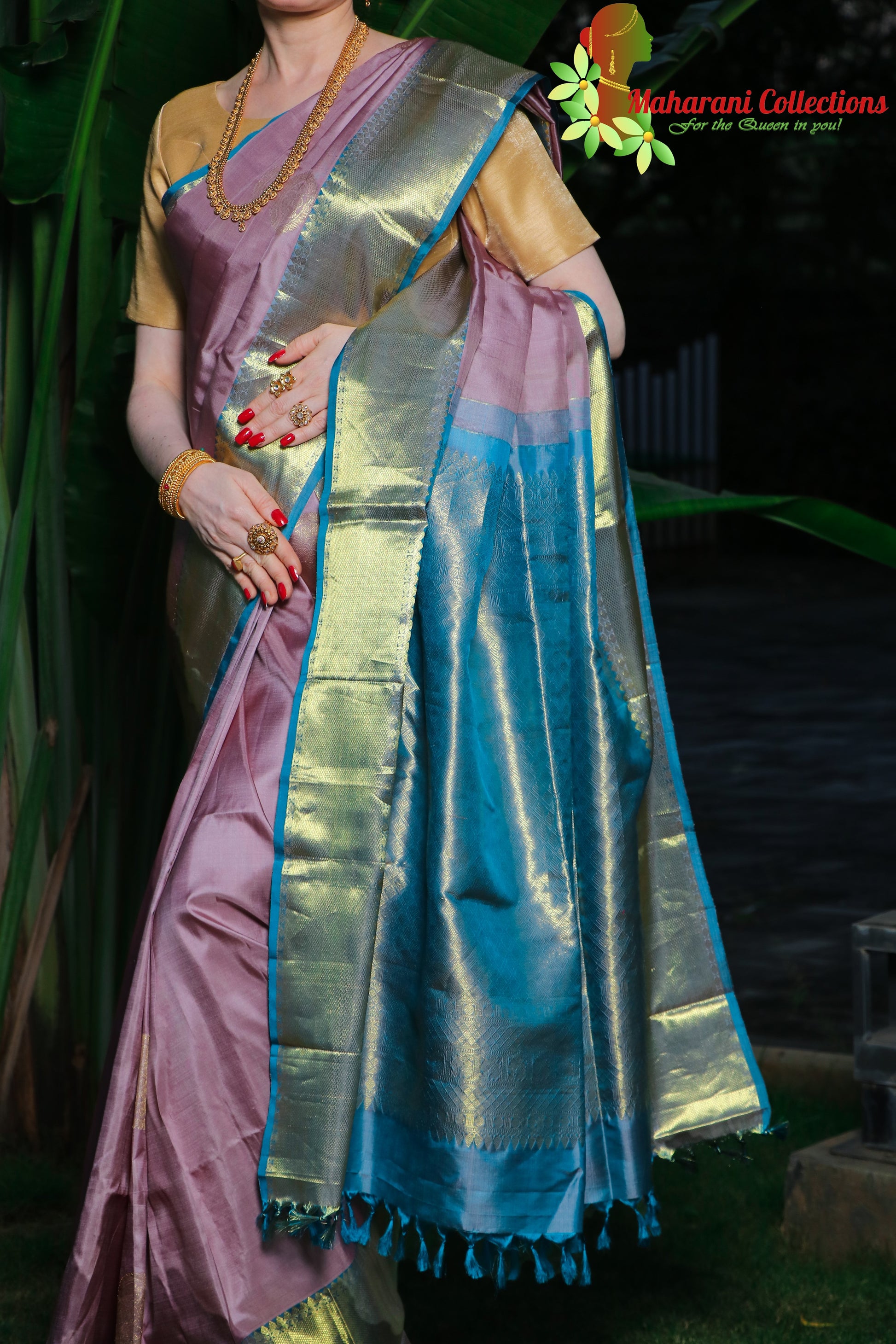 Maharani's Pure Handloom Kanjivaram Silk Saree - Purple with Blue Pallu and Golden Zari Border