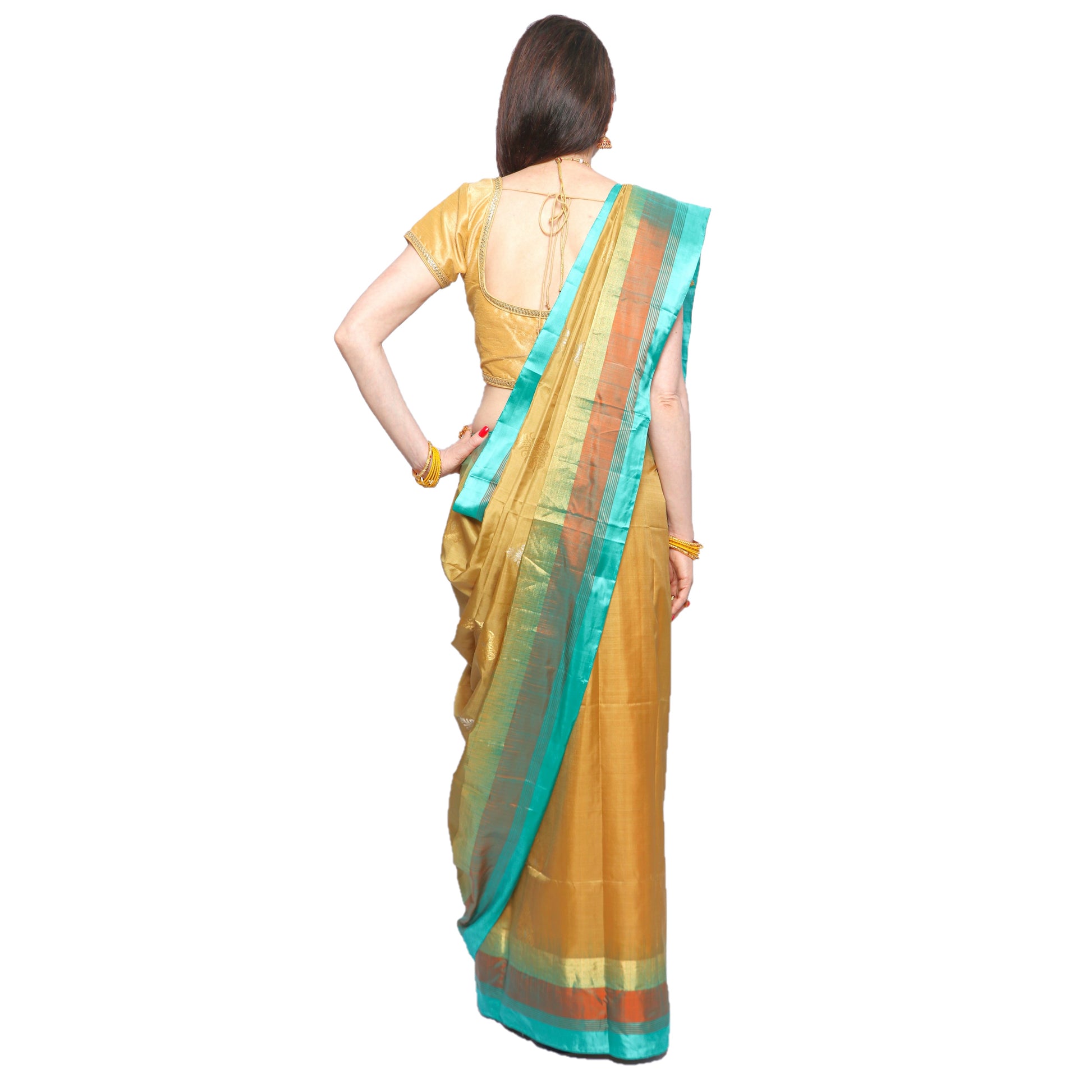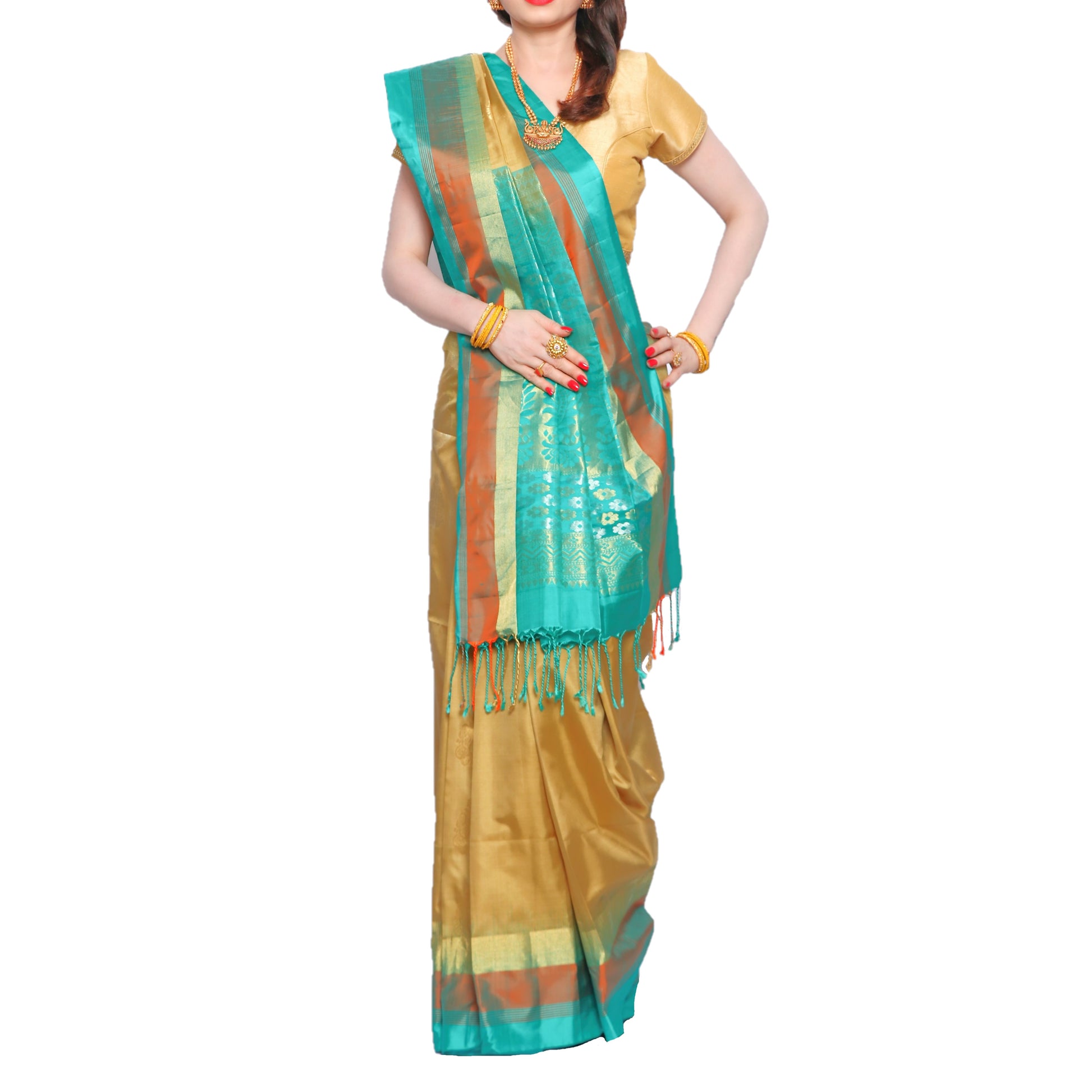 Maharani's Pure Handloom Kanjivaram Silk Saree - Mustard with Green Pallu and Golden Border