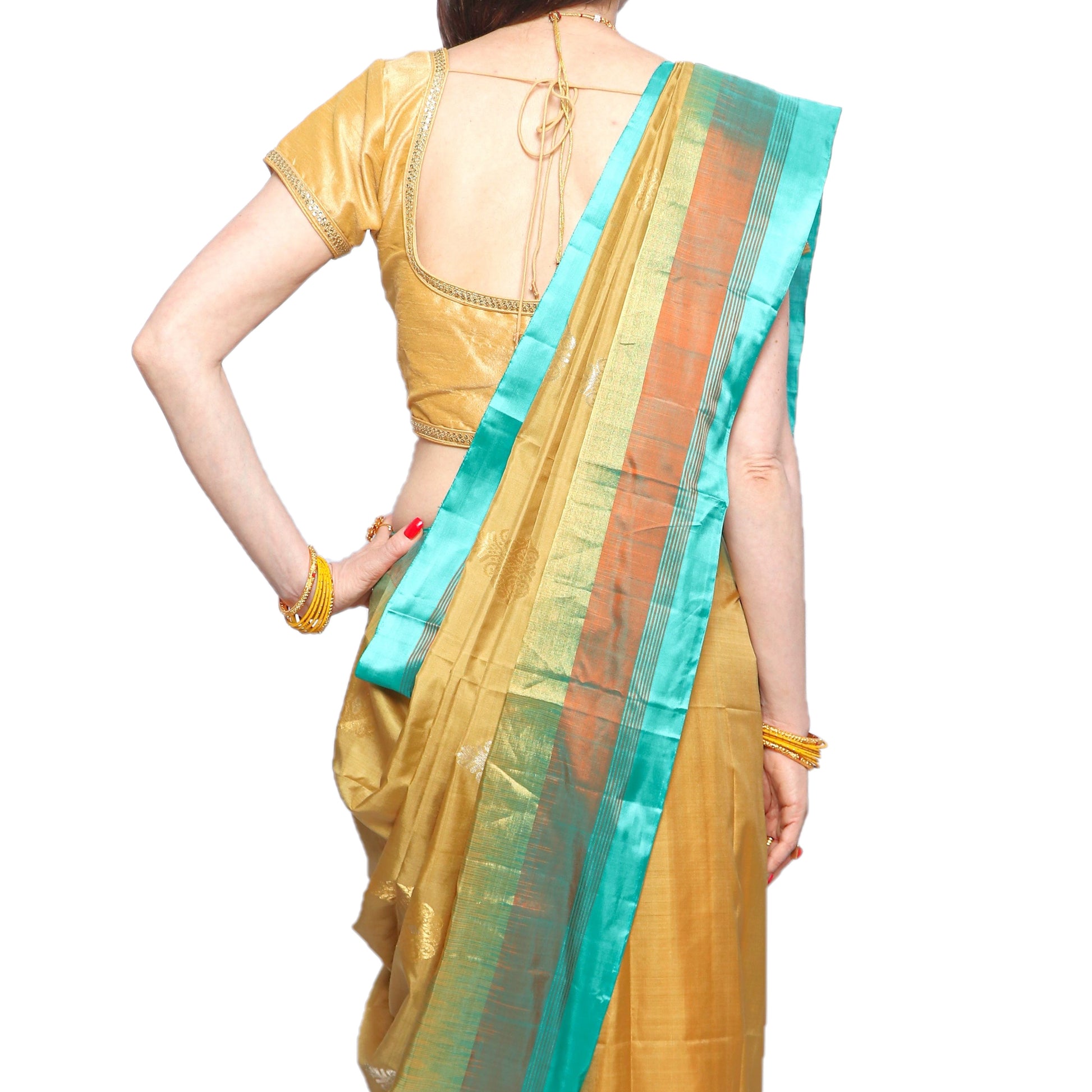 Mustard with Green Pallu and Golden Border, authentic handloom weaved Kanjivaram (Kanchipuram) Silk Saree with golden Zari and golden Boota work on Pallu and Maharani's elegance to go with it!