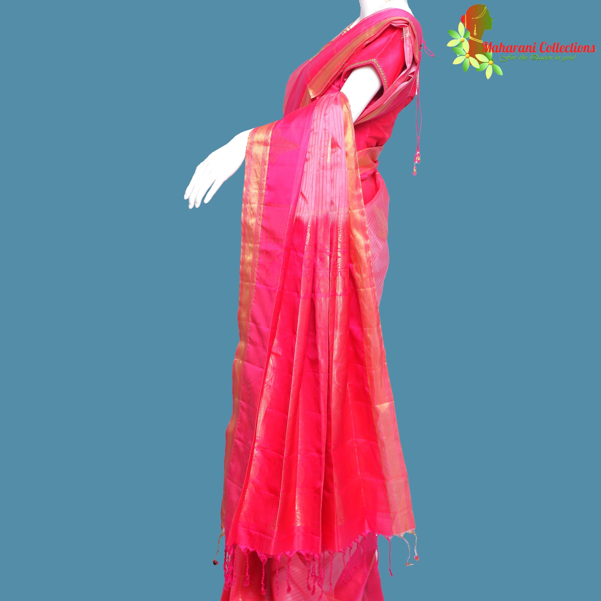 Pink, authentic handloom weaved Kanjivaram (Kanchipuram) Silk Saree with Golden Zari work, beautiful contrasting border and Pallu, elegant shine of pure Silk and Maharani's quality assurance!
