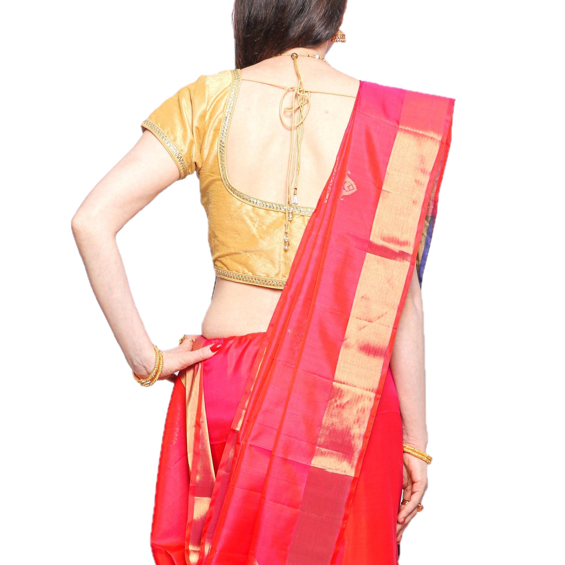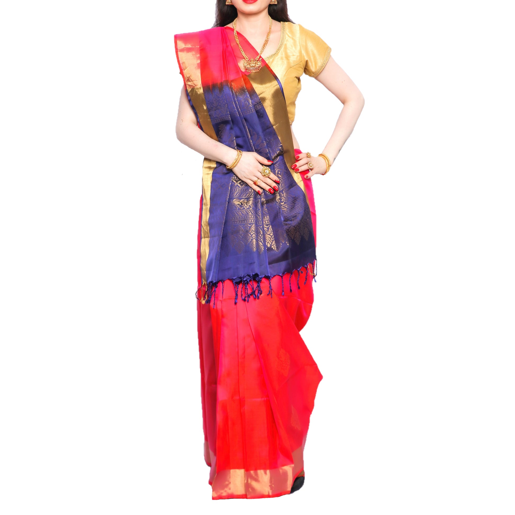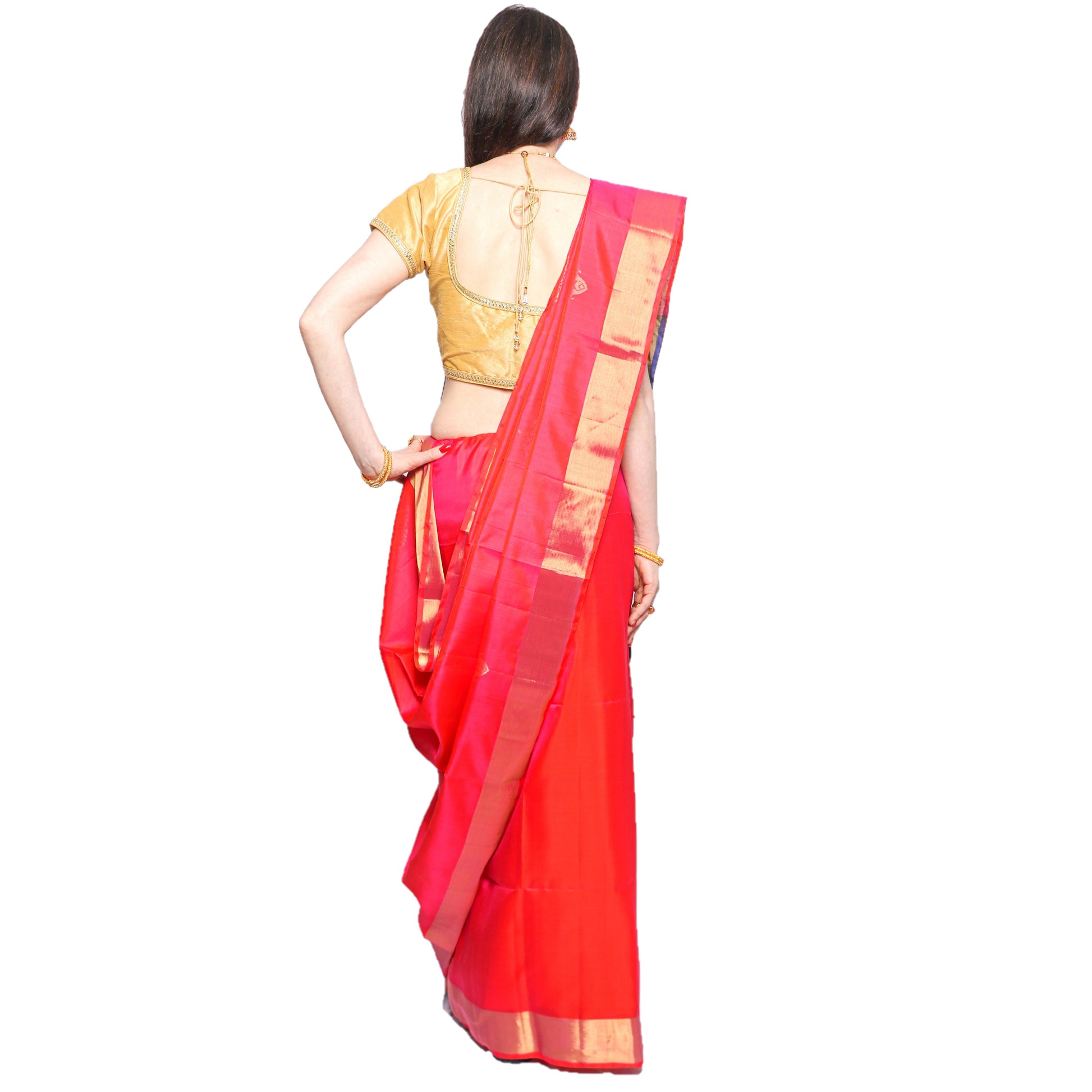 Maharani's Pure Handloom Kanjivaram Silk Saree - Red with Purple Pallu and Golden Zari Border