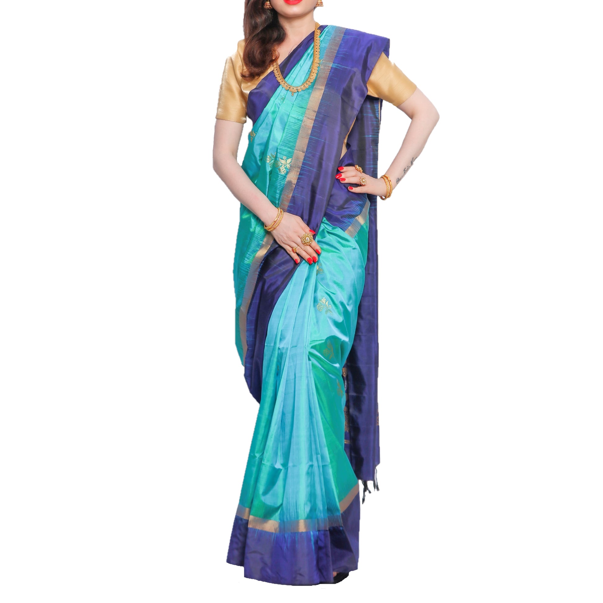 Turquoise with Blue Pallu and Golden Zari Border, authentic handloom weaved Kanjivaram (Kanchipuram) Silk Saree with Golden Zari and Boota Work, beautiful contrasting border and Pallu, elegant shine of pure Silk in beautiful festive colors!