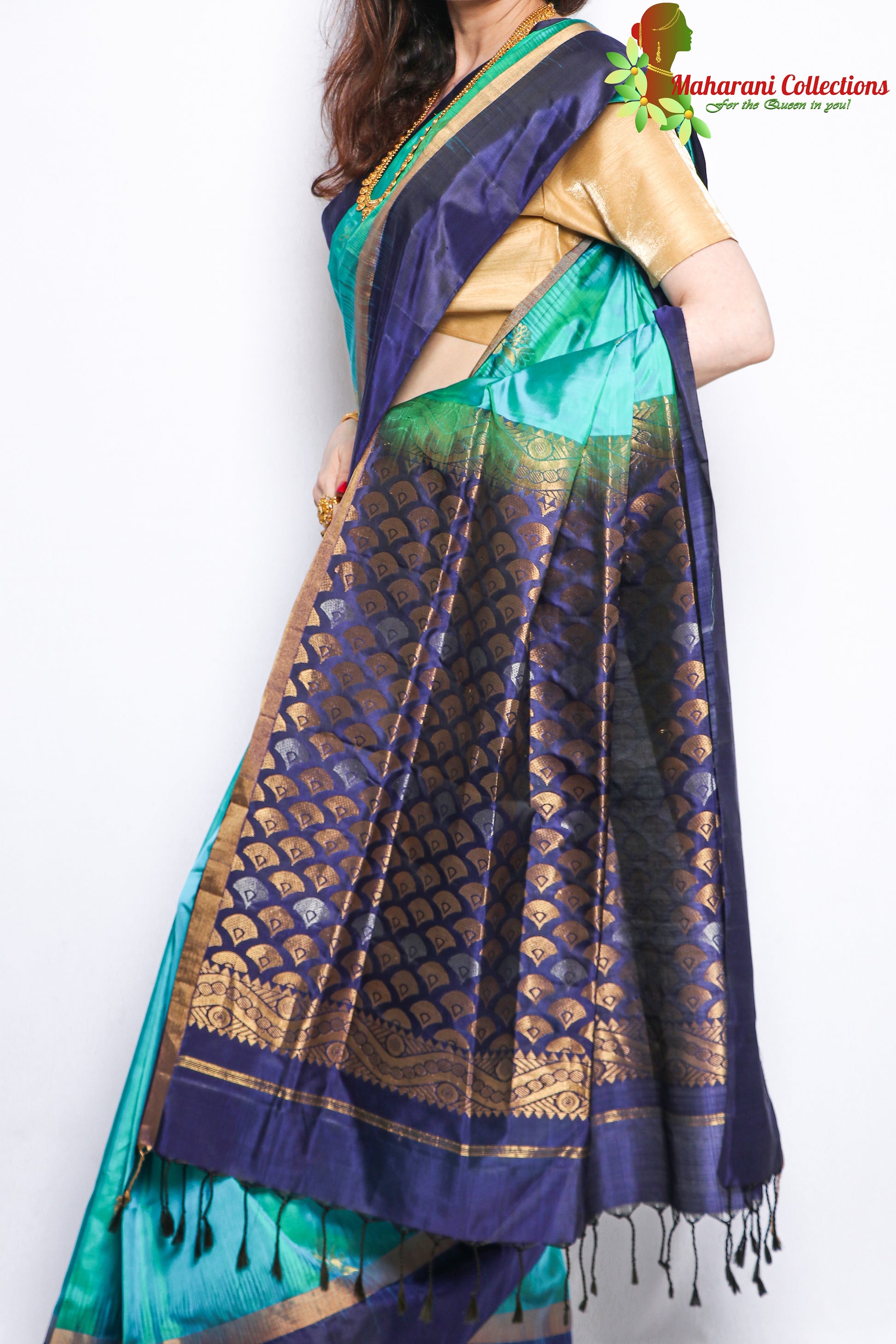 Maharani's Pure Handloom Kanjivaram Silk Saree - Turquoise with Blue Pallu and Golden Zari Border