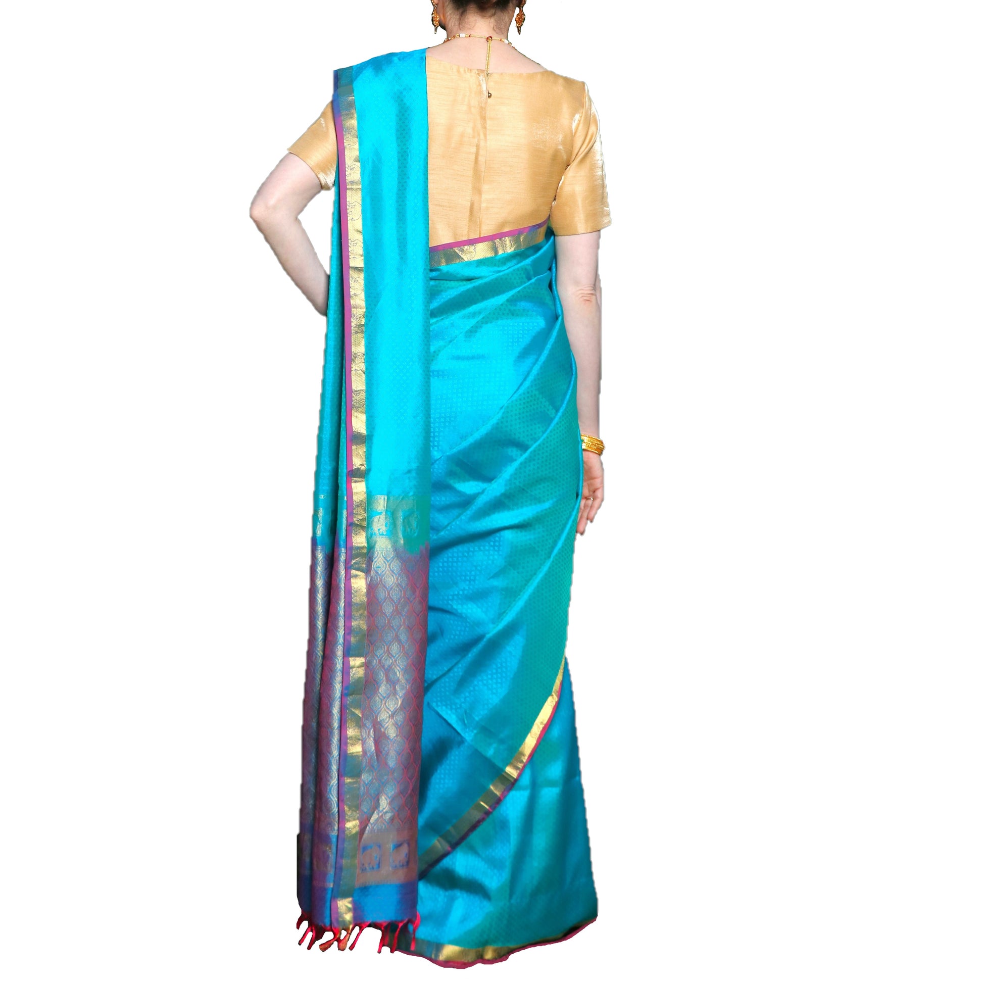 Sky Blue with Purple Zari Border and Pallu, authentic handloom weaved Kanjivaram (Kanchipuram) Silk Saree with golden Zari and allover golden Boota work, contrasting border and Pallu and Maharani's elegance!