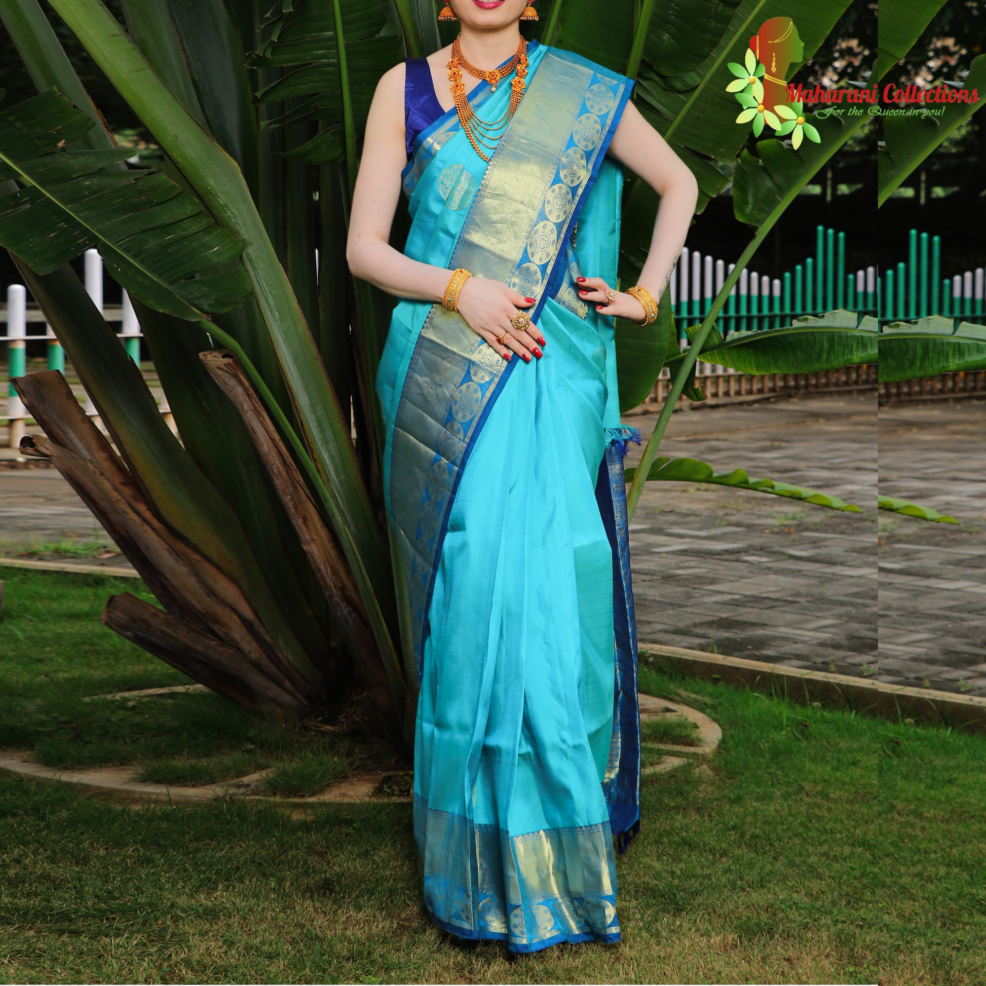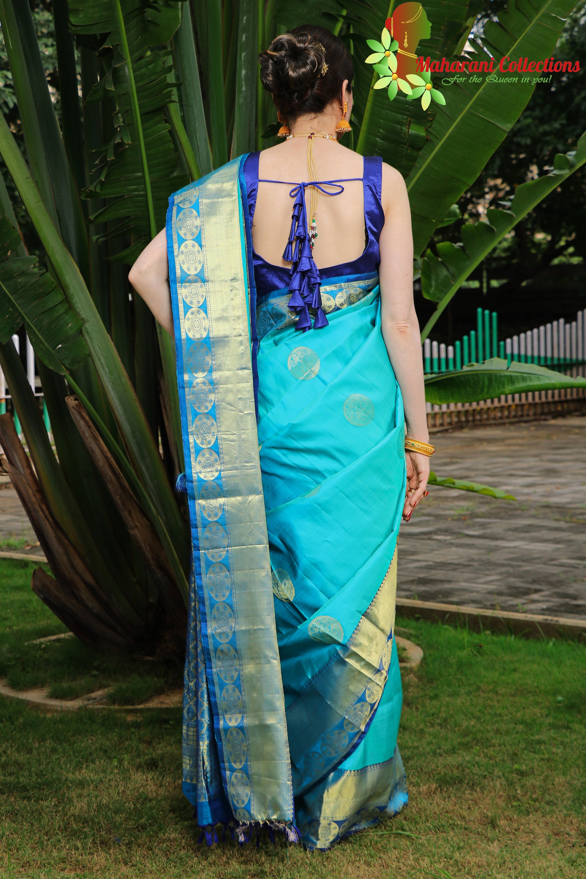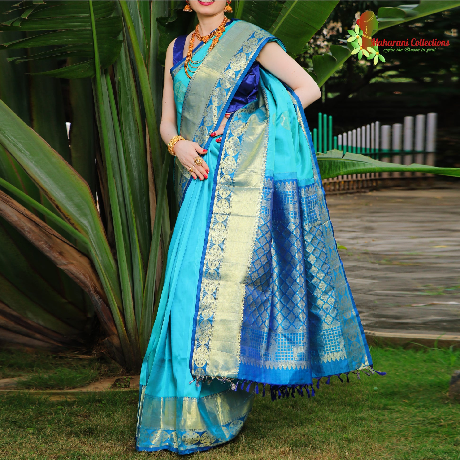 Maharani's Pure Handloom Kanjivaram Silk Saree - Turquoise with Blue Pallu and Golden Zari Border