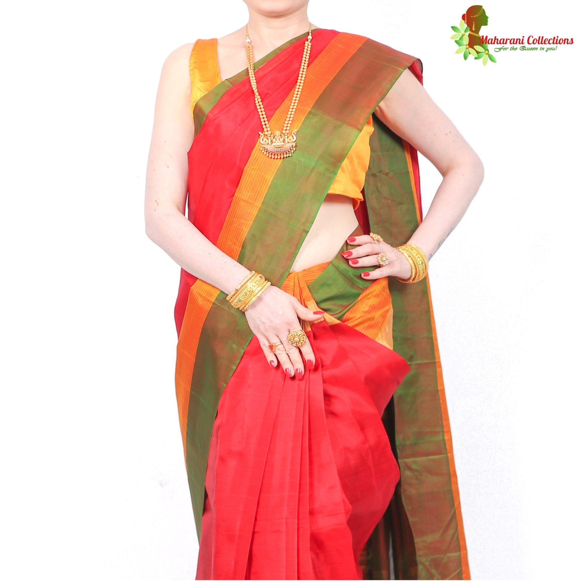Maharani's Pure Kanjivaram Silk Saree - Red with Green and Golden Zari Border and Pallu, authentic handloom weaved Kanjivaram (Kanchipuram) Silk Saree with golden Zari, contrasting border and Pallu and Maharani's elegance!