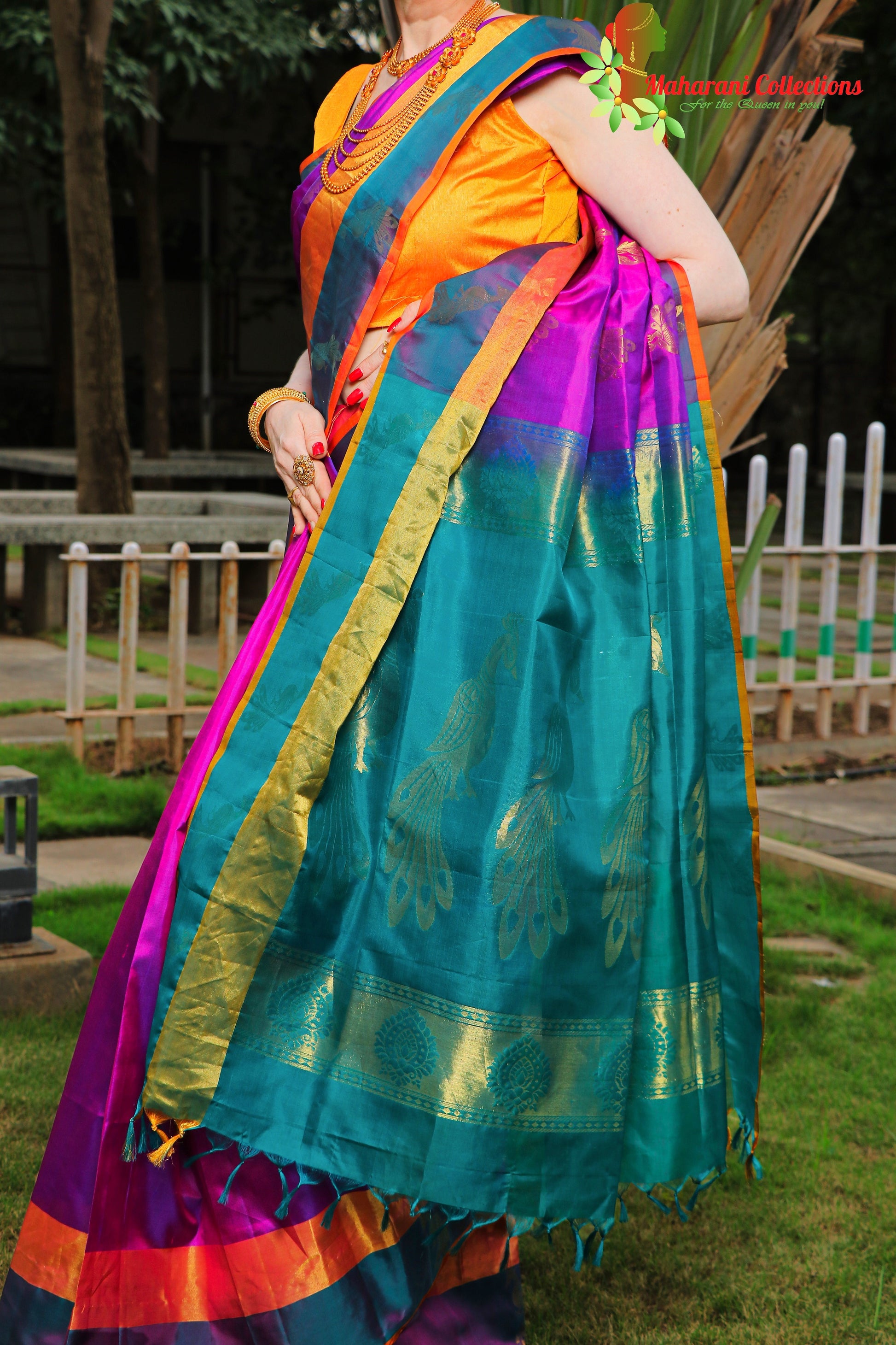 Maharani's Pure Handloom Kanjivaram Silk Saree - Purple with Turquoise Pallu and Golden Zari Border