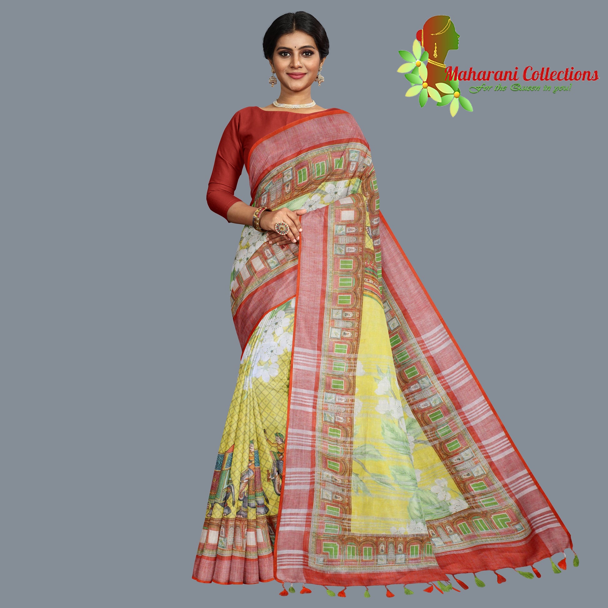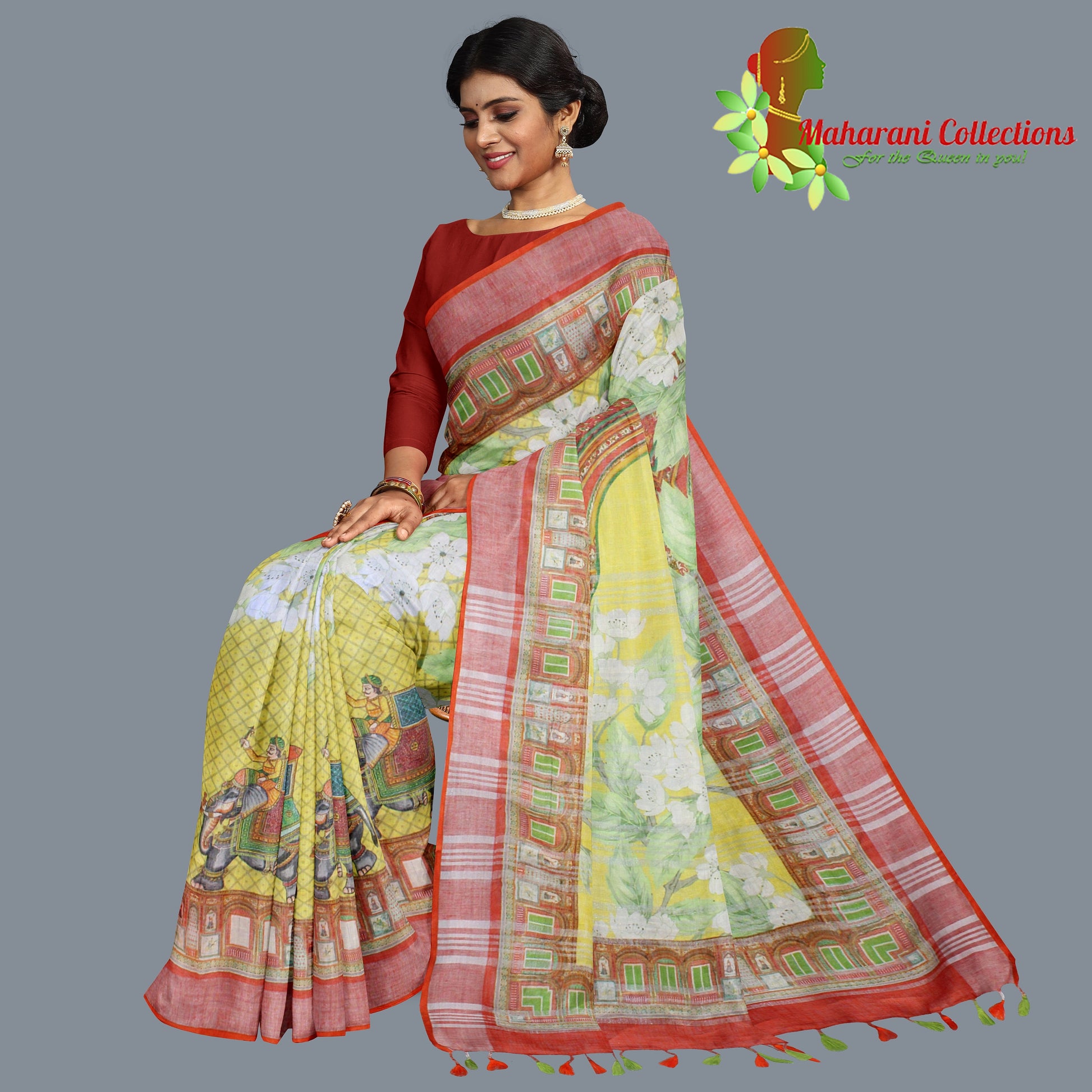 Handloom-woven pure Linen Silk saree with included ready-to-wear stitched blouse and FREE ready-to-wear petticoat. All stitching is done as per Maharani's specification with original and authentic material. A truly professional look - at work or at get-together.