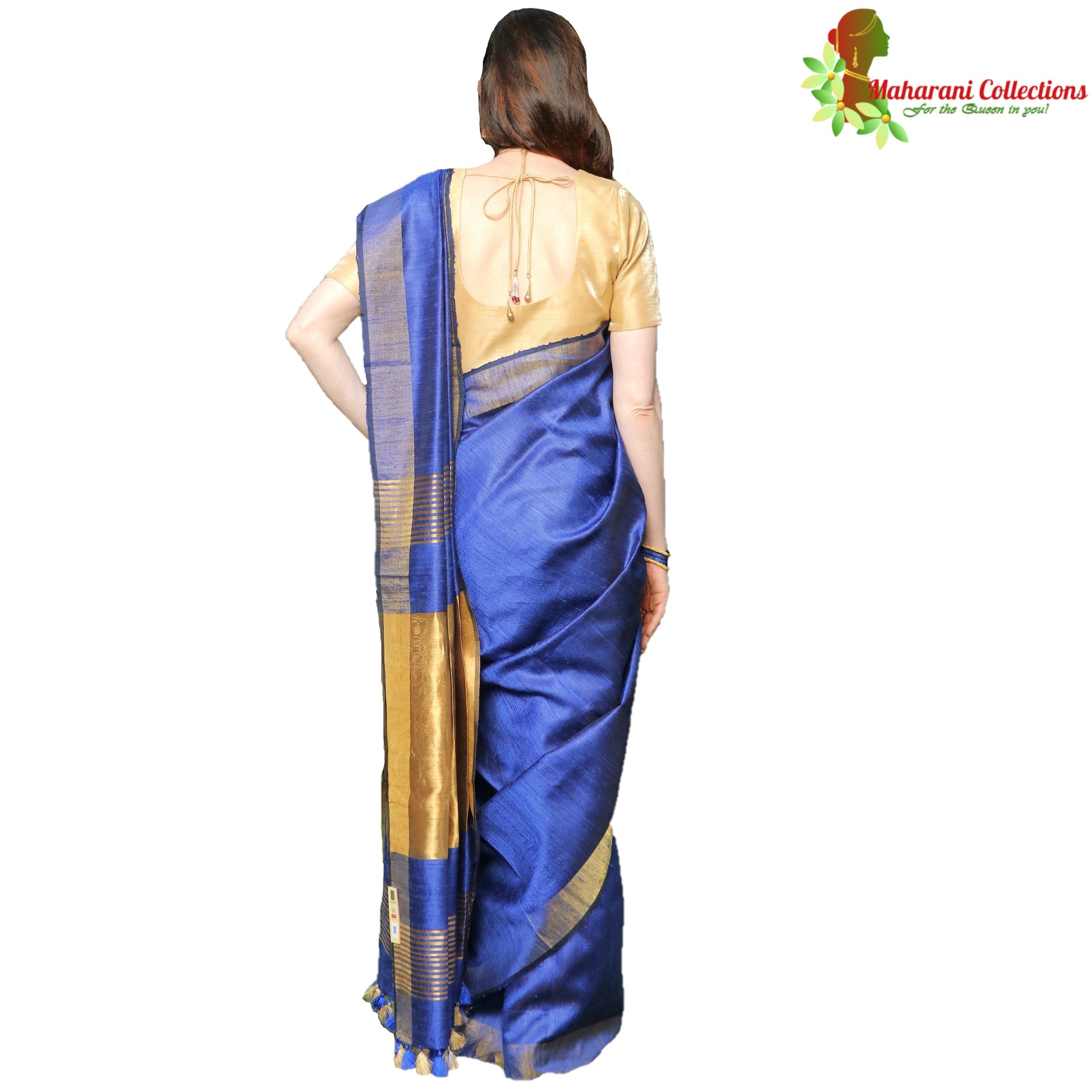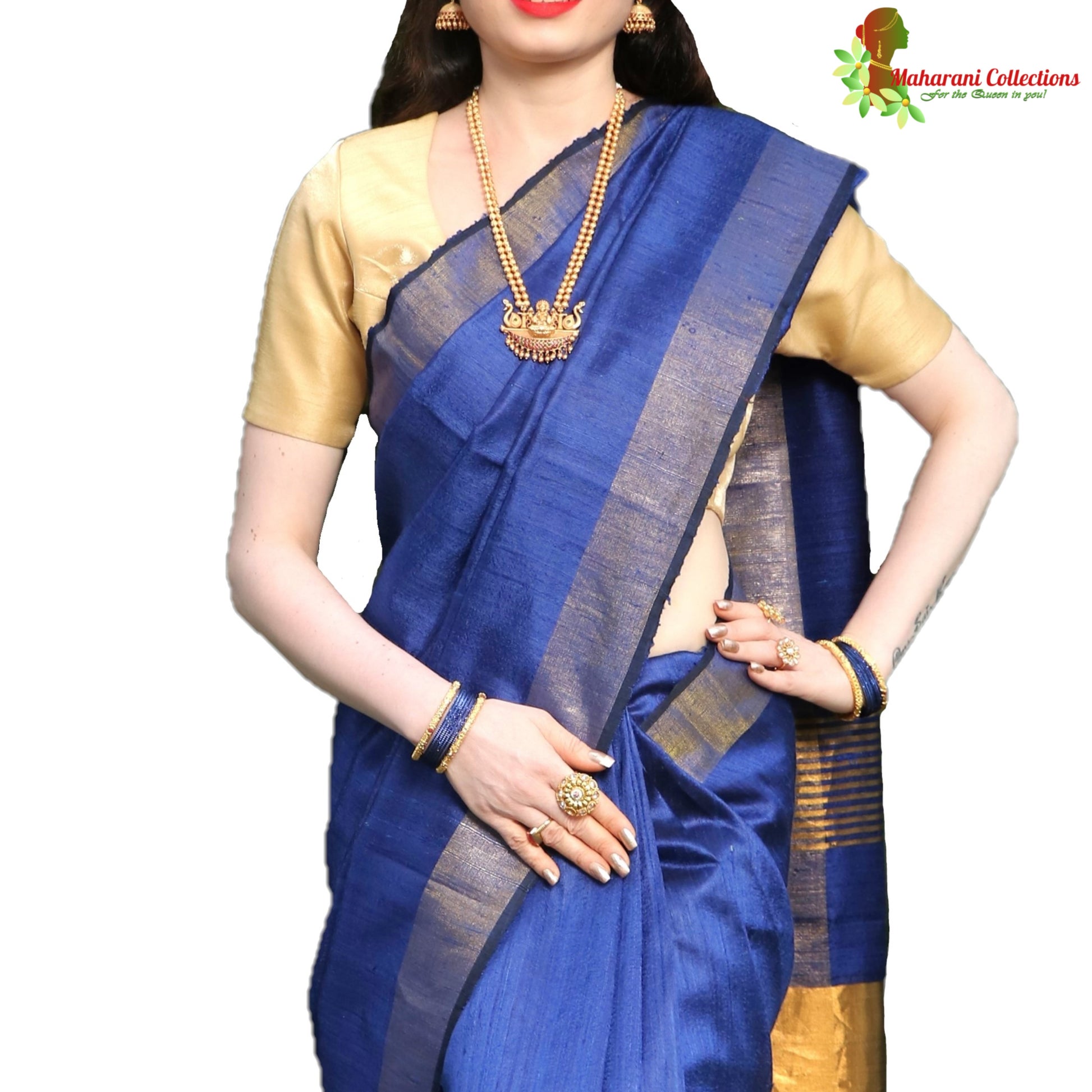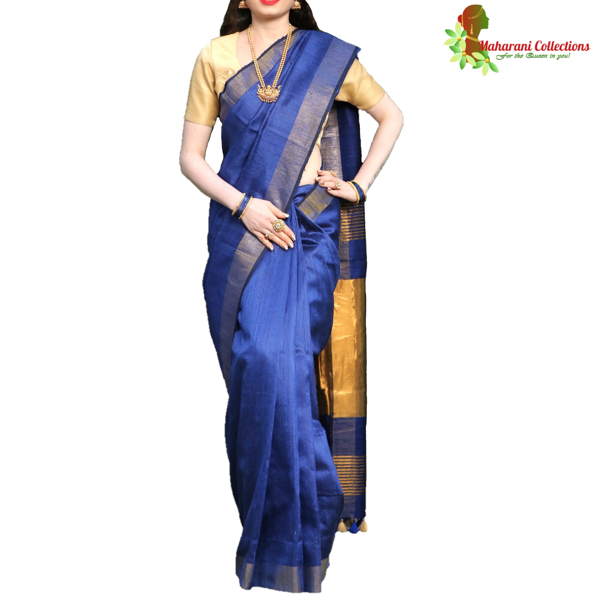 Pure Handloom Tussar Silk Saree - Royal Blue with Golden Zari Border and Pallu