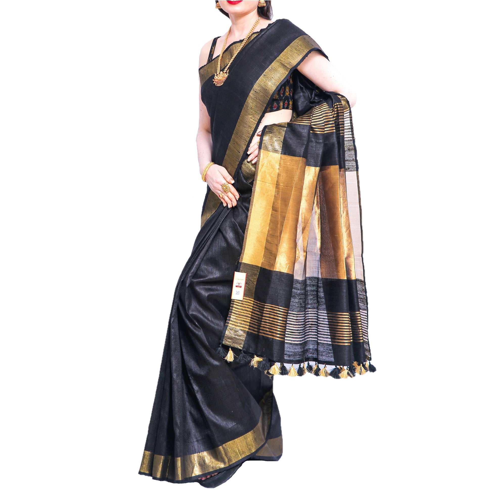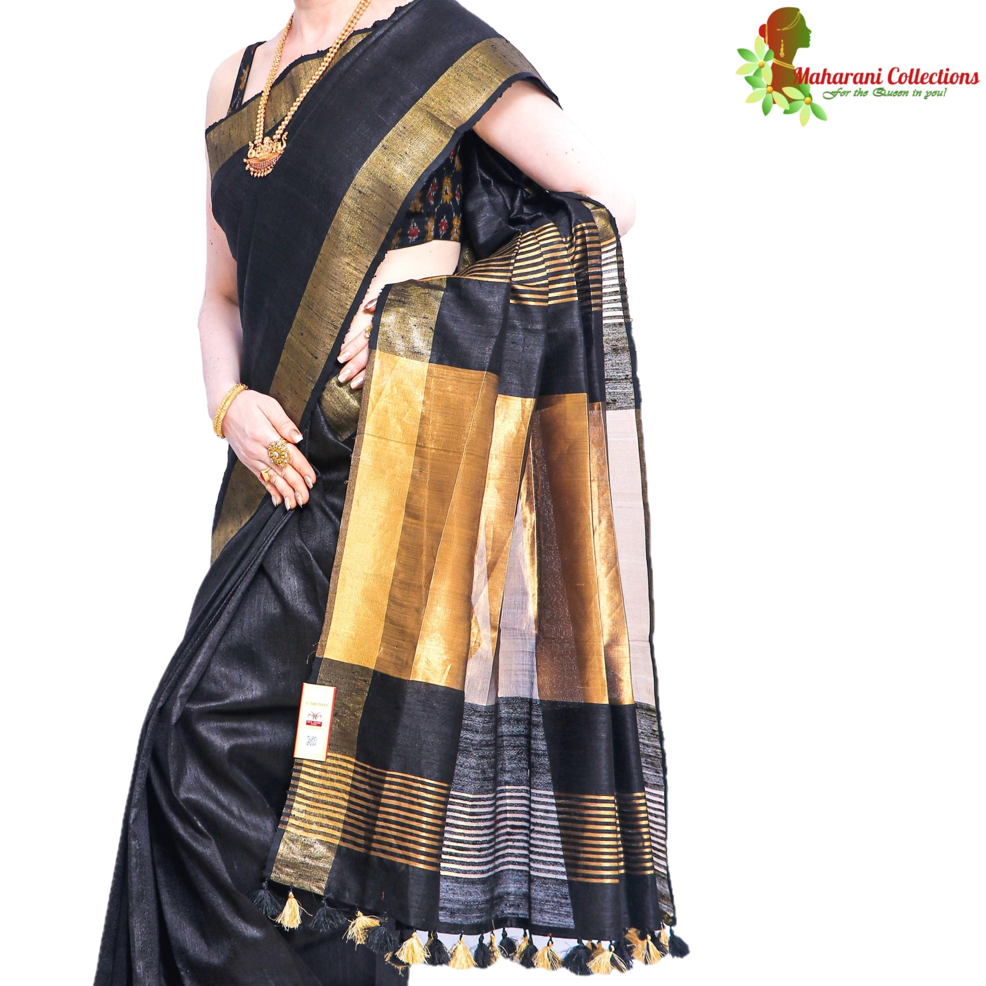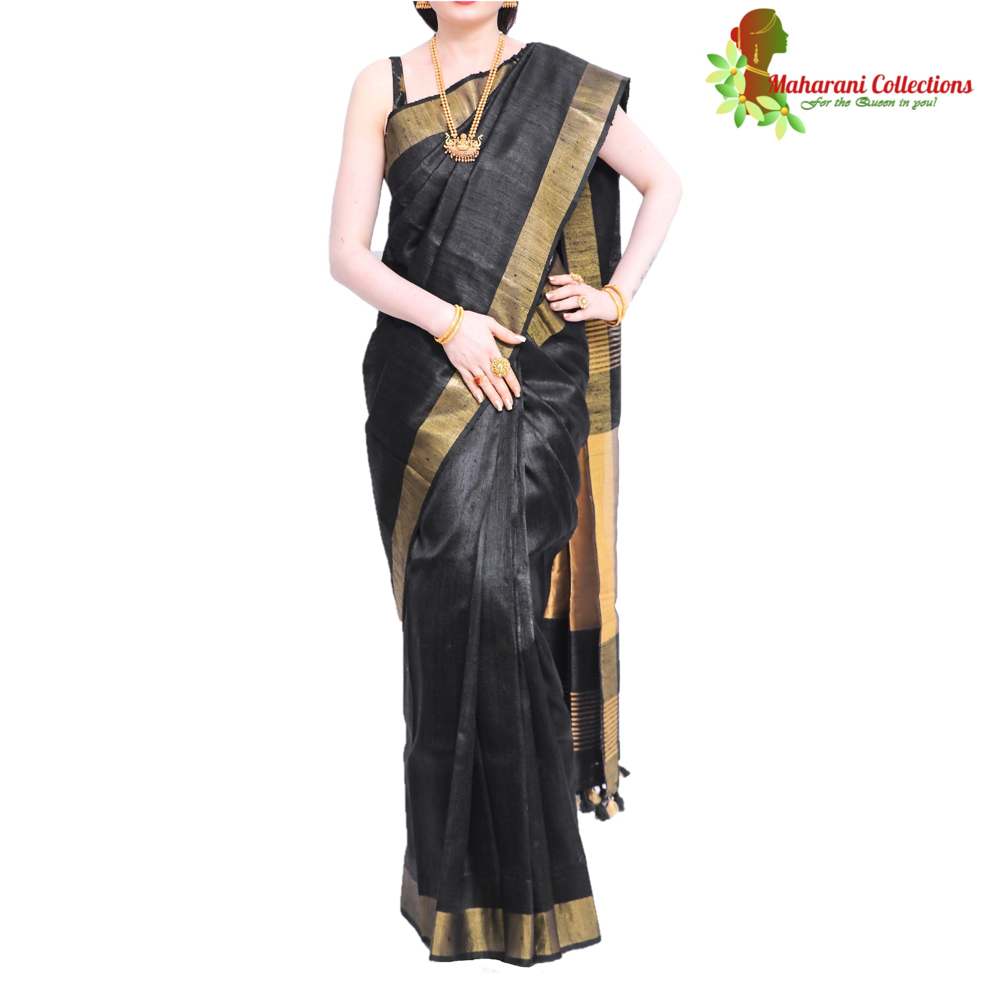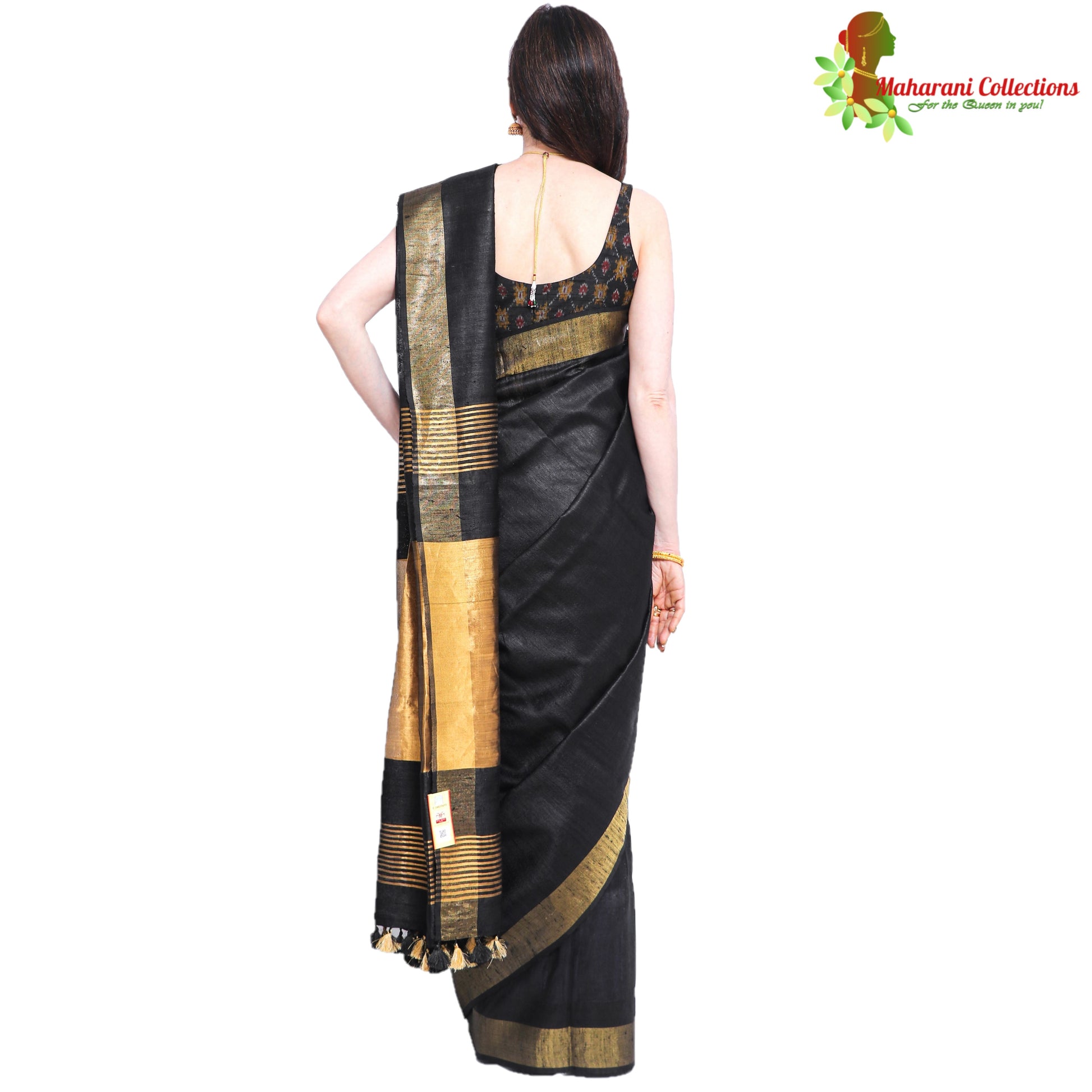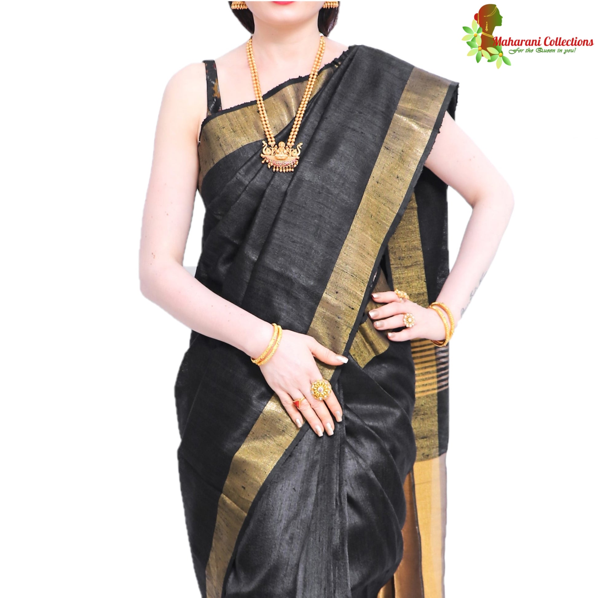 Maharani's Pure Tussar Silk Saree (Silk Mark) - Black with Golden Zari Border and Pallu