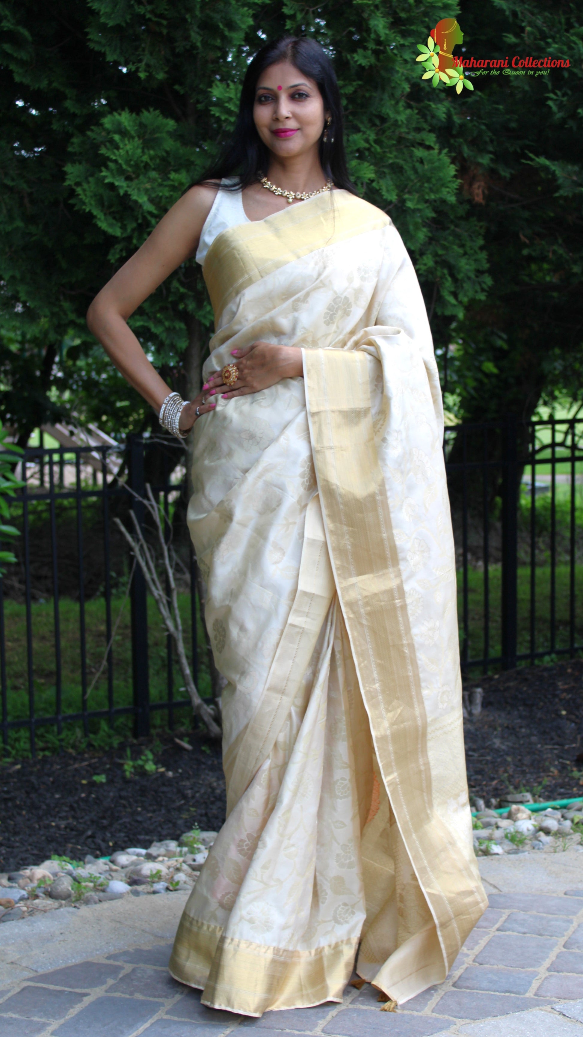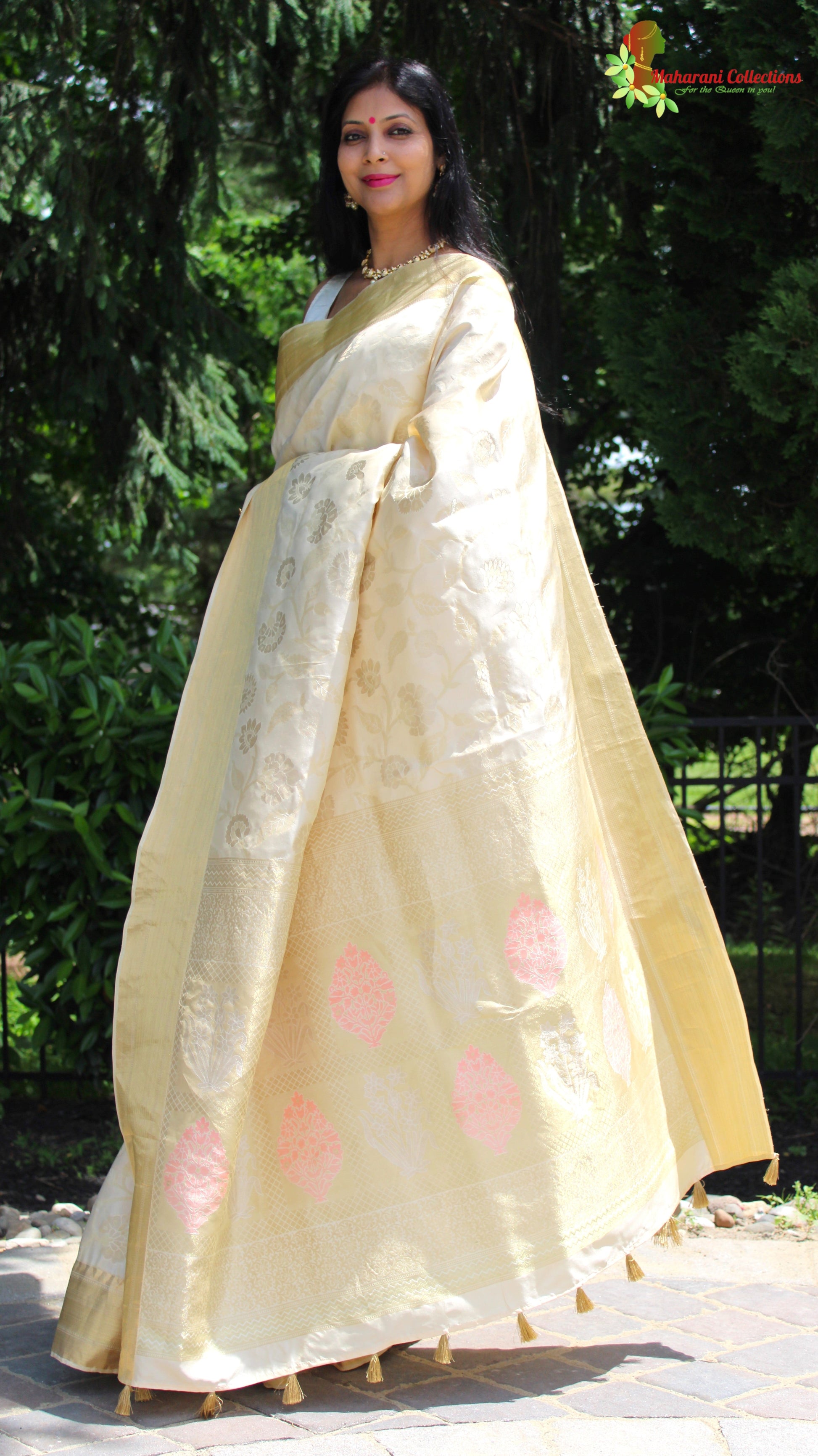 Maharani's Pure Heavy Zari Banarasi Silk Saree - Cream (with Stitched Blouse and Petticoat)