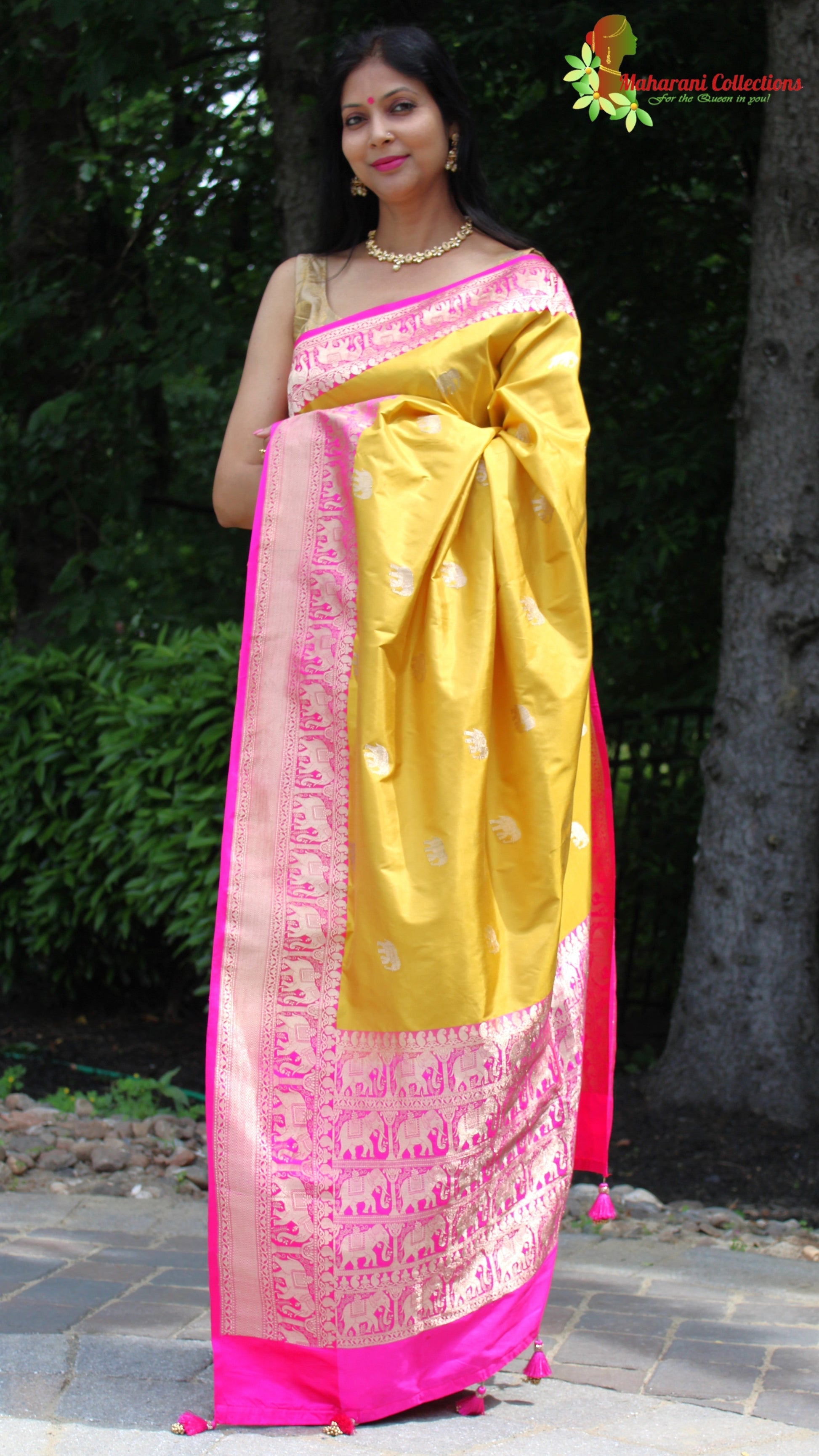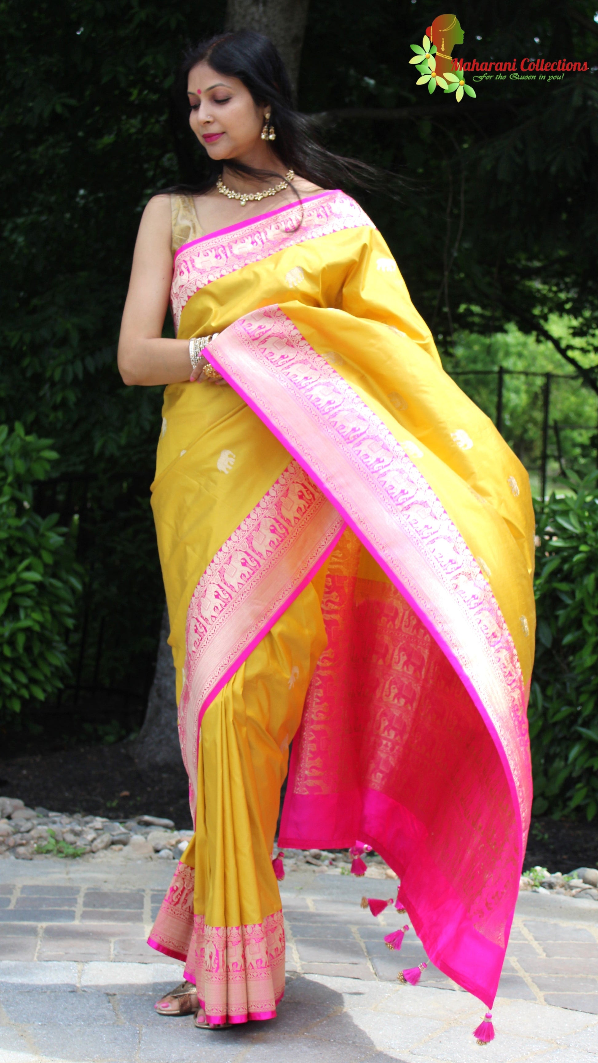 Maharani's Pure Heavy Zari Banarasi Silk Saree - Yellow & Pink (with Stitched Blouse and Petticoat)