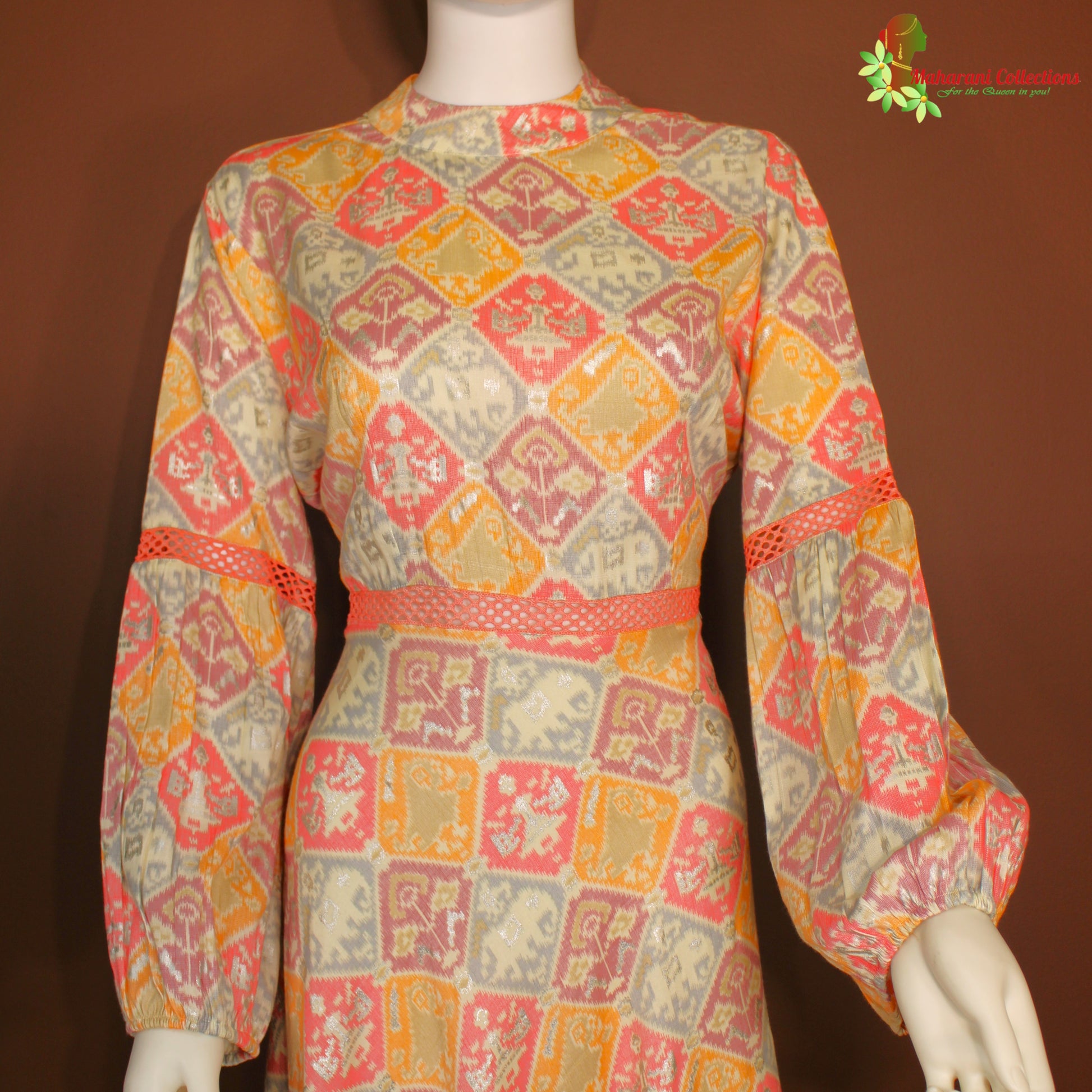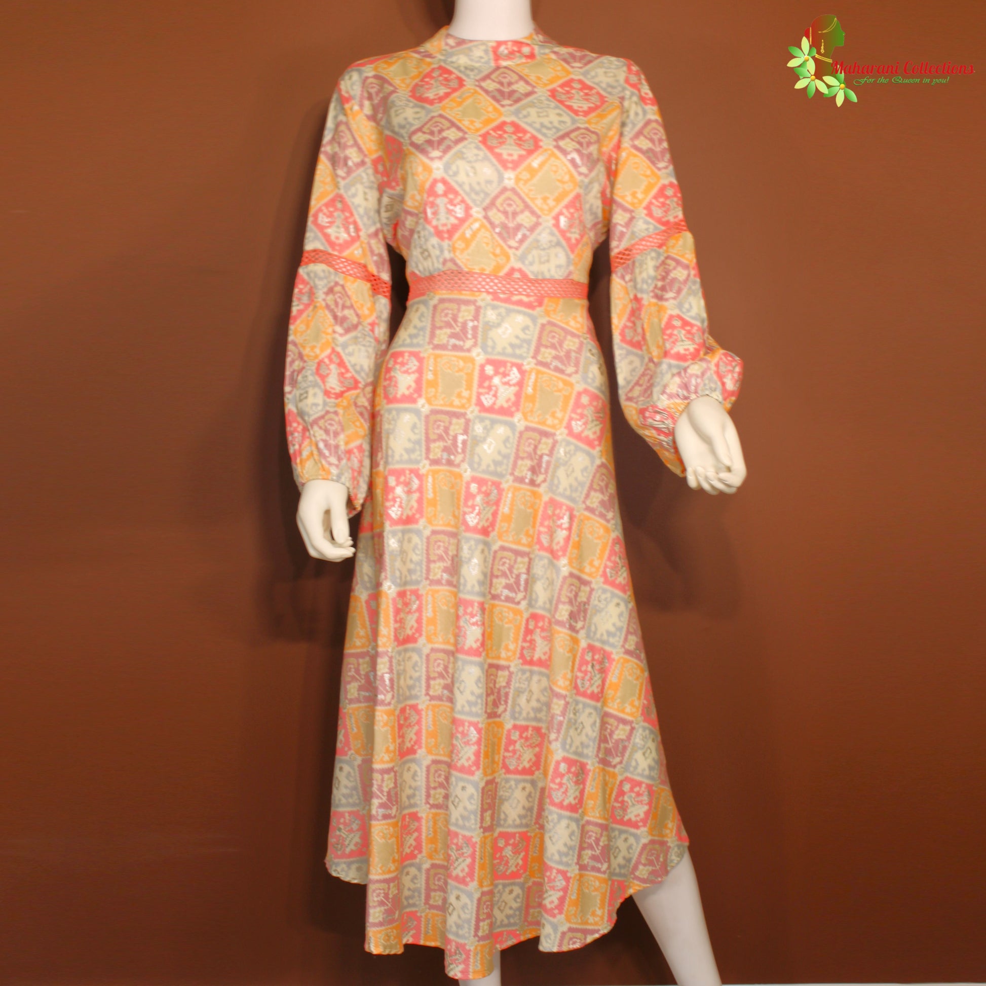 Maharani's Long Dress in Satin Silk with computer prints.