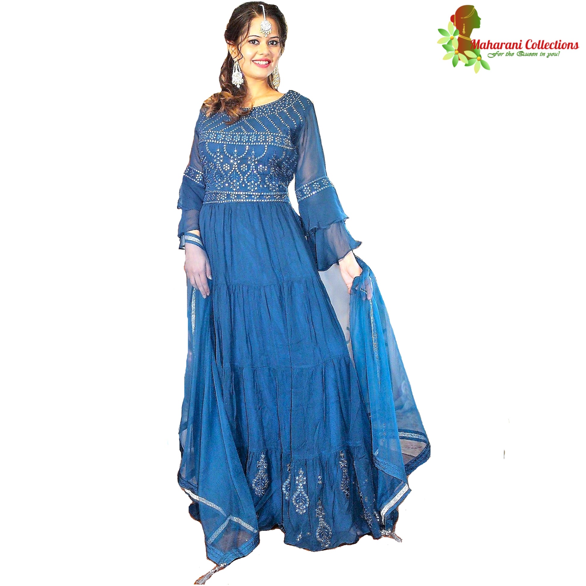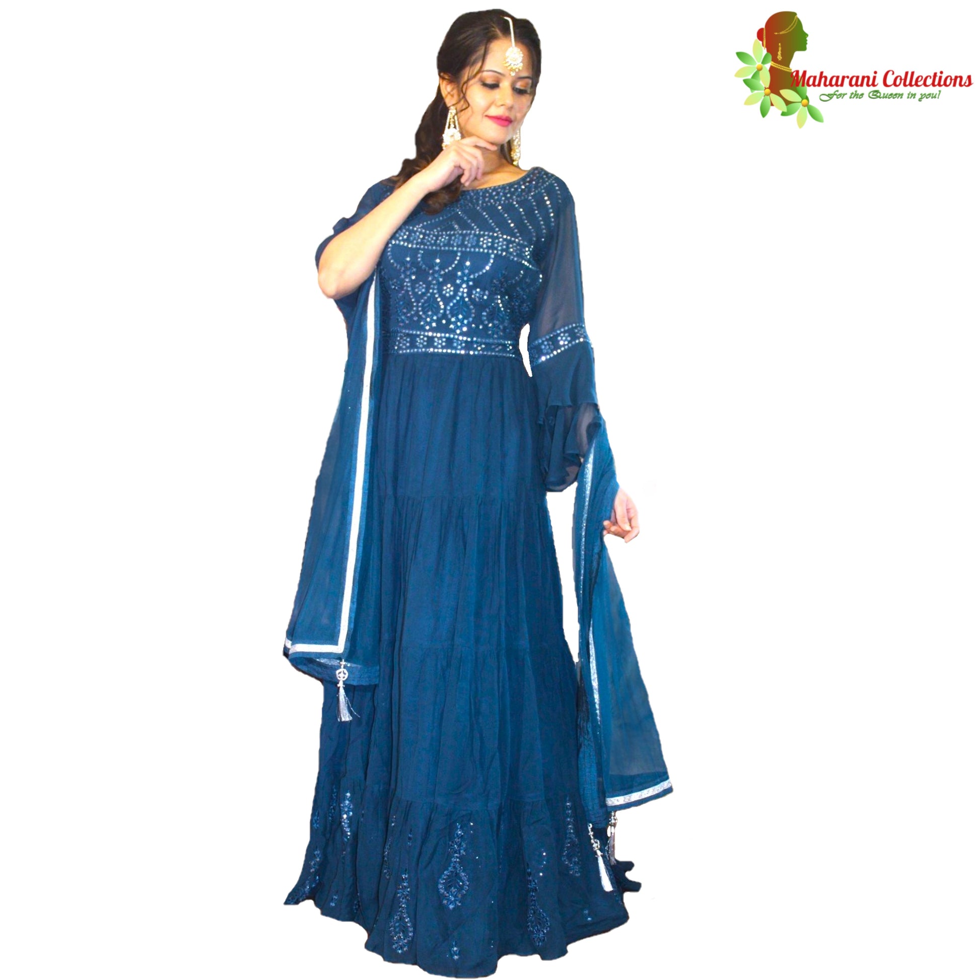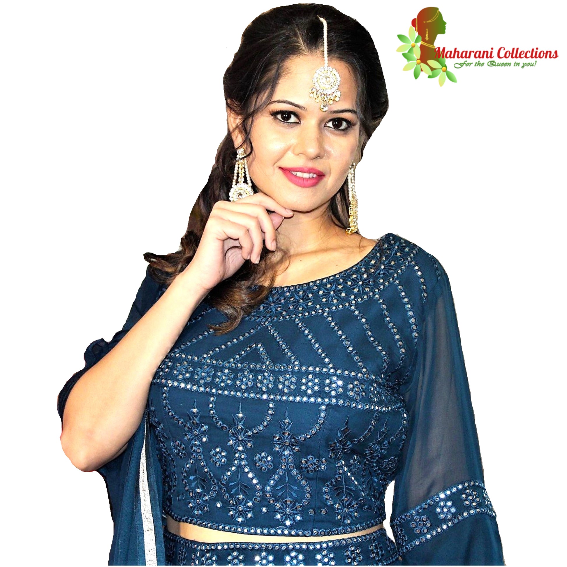 Look gorgeous in this Navy Blue designer Lehenga Choli from Maharani Collections! Crafted from Silk/Net, this heavy work Lehenga is intricately decorated with Silver and Golden Zari, Sequins, and Mirror work. The set also includes a matching Zari and Mirror work Choli and Gotta-Patti work Net dupatta.