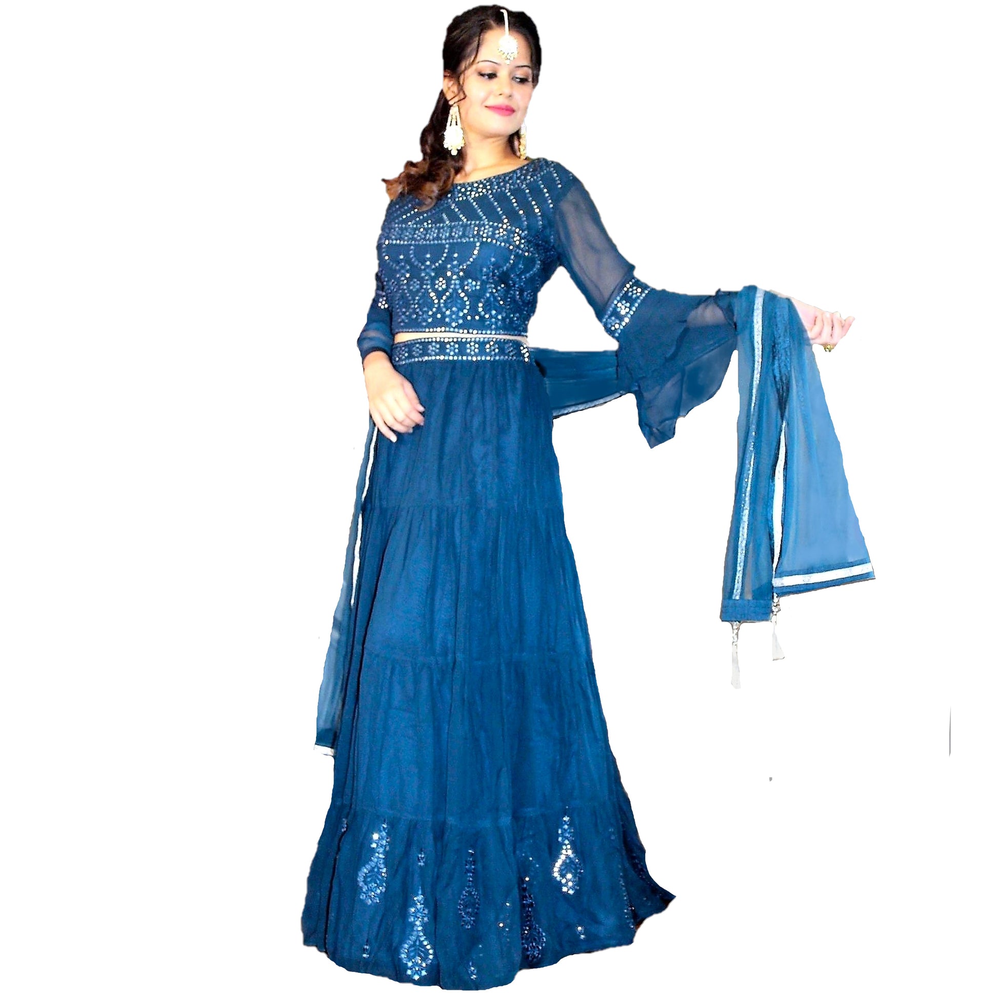 - Design: Traditional flared skirt bottom, full sleeve flared Choli