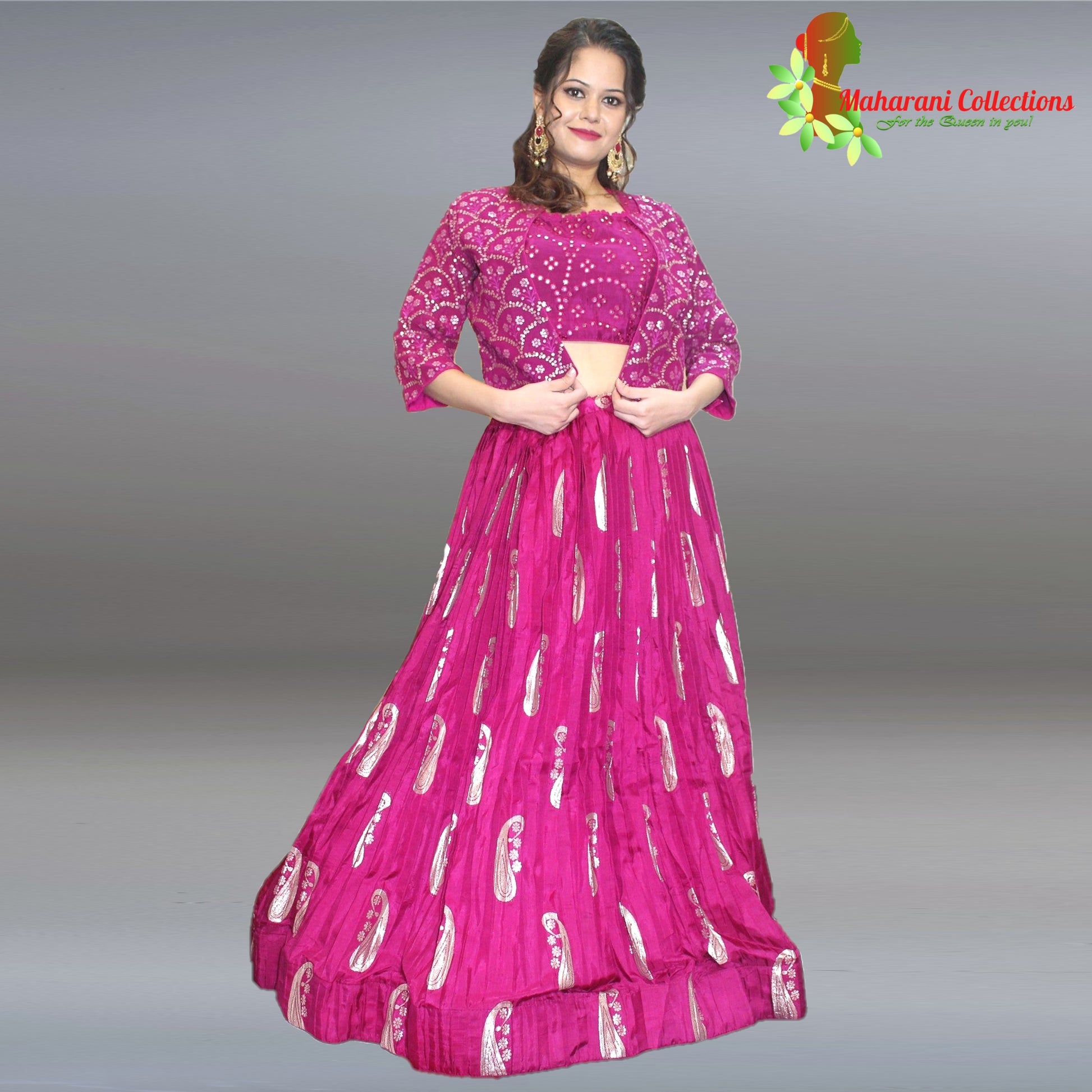 Look stunning in this beautiful Maharani's Silk Ikkat Patola Lehenga Choli with Half Koti! The Magenta Lehenga featuring large Zari Boota work and the embroidered readymade Mirror Work Choli are exquisitely stylish, with detailed mirror work throughout. Capture the spotlight in this gorgeous Lehenga.