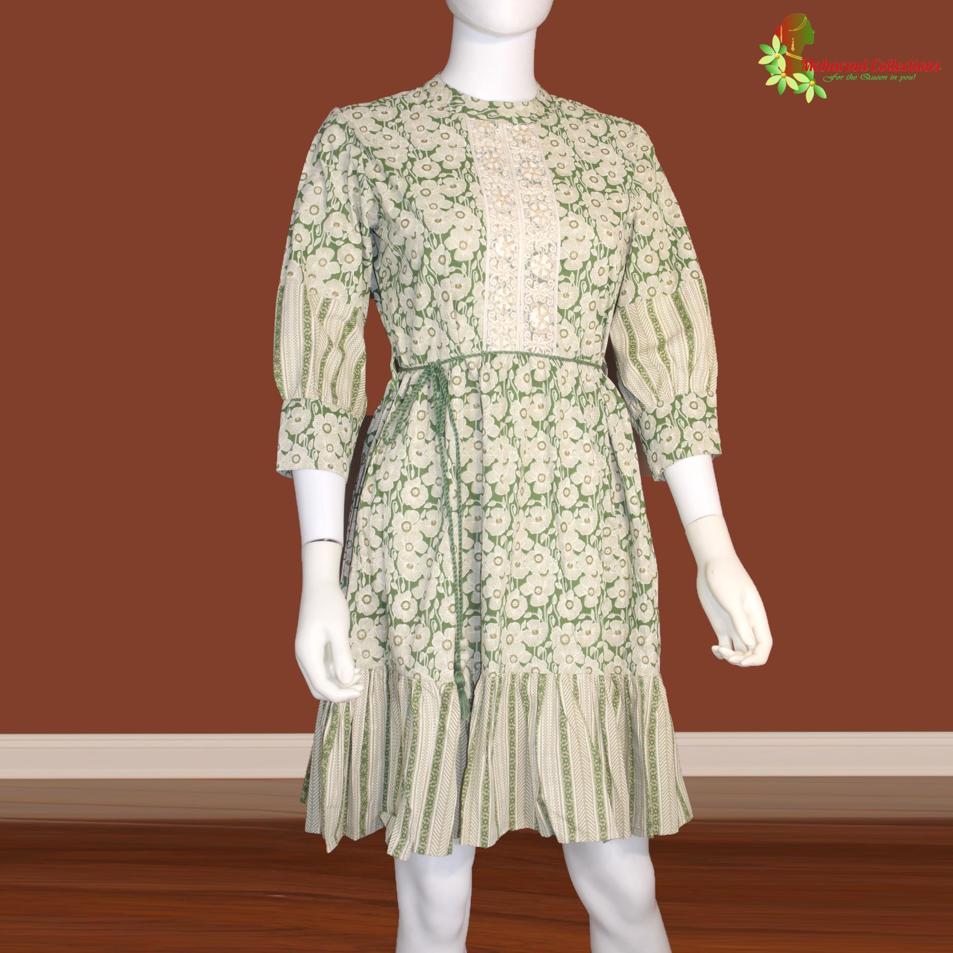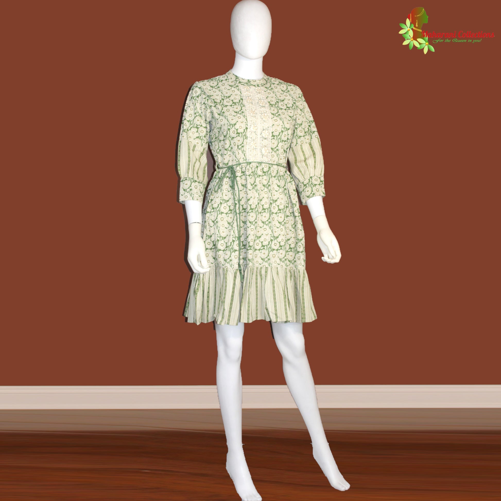 Maharani's Short Dress - Pure Cotton - Green and Cream (S, M, L, XL)